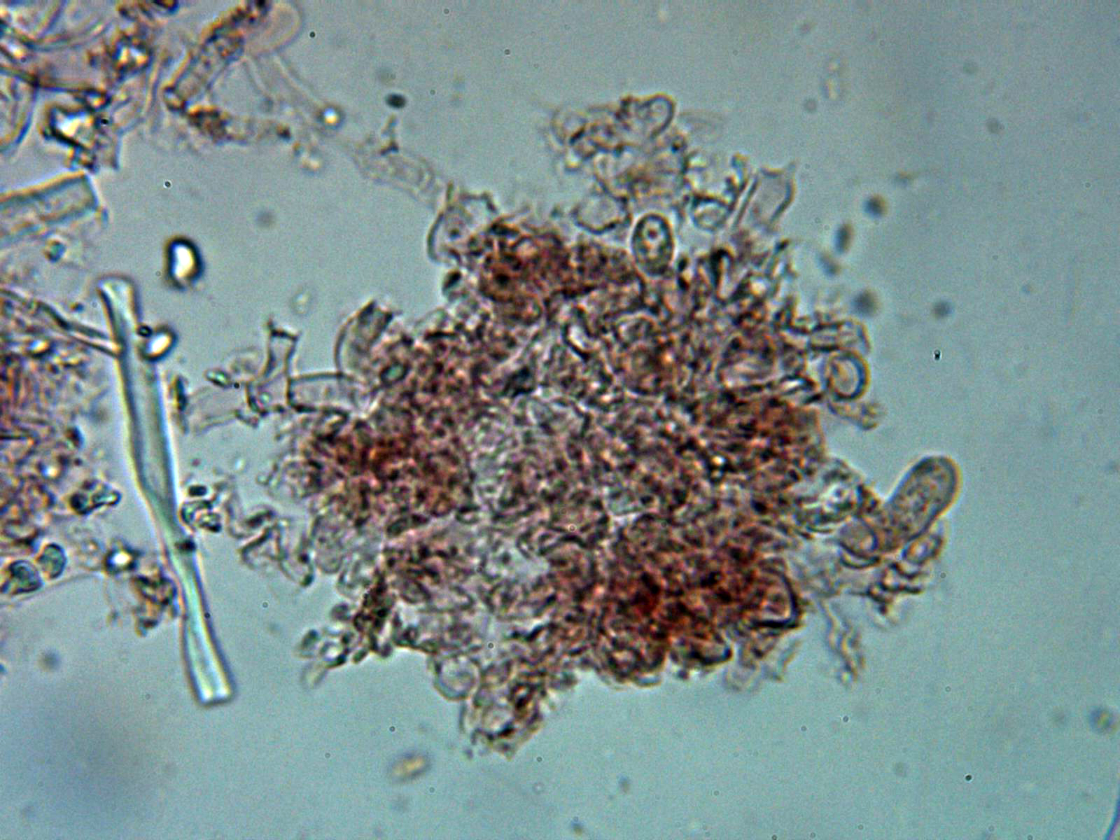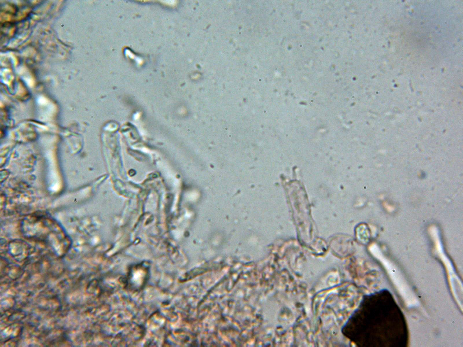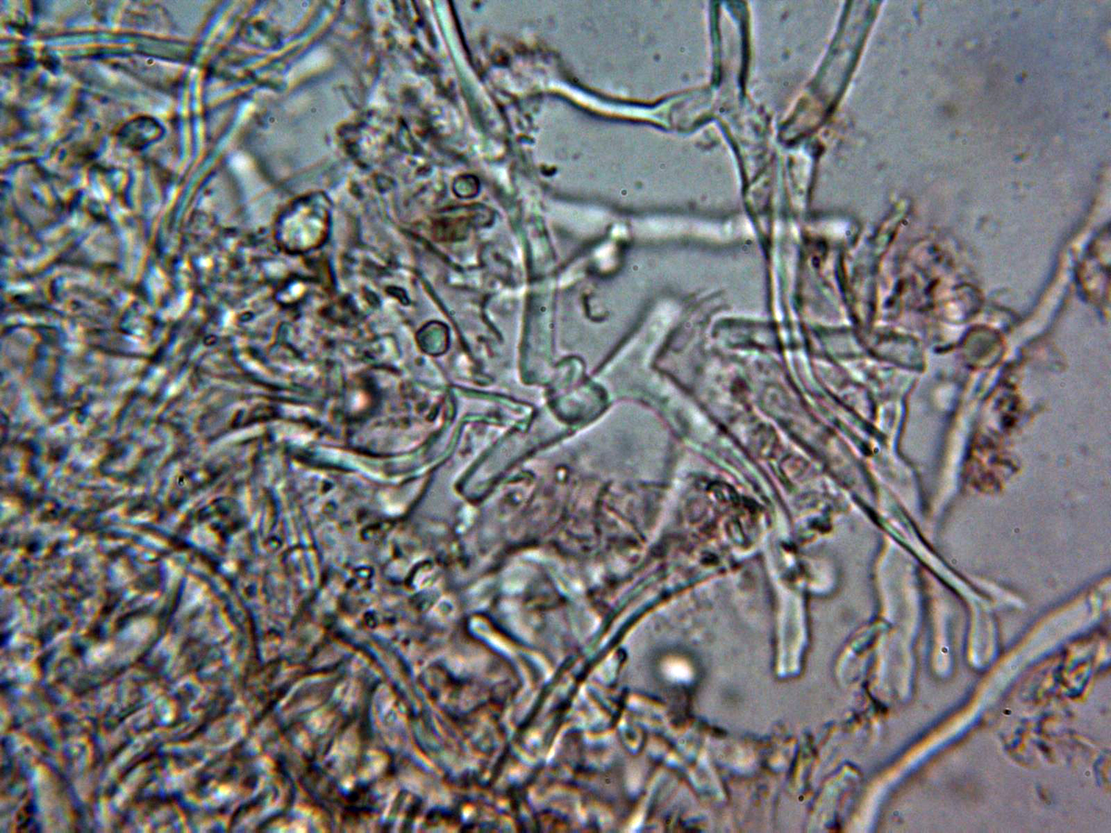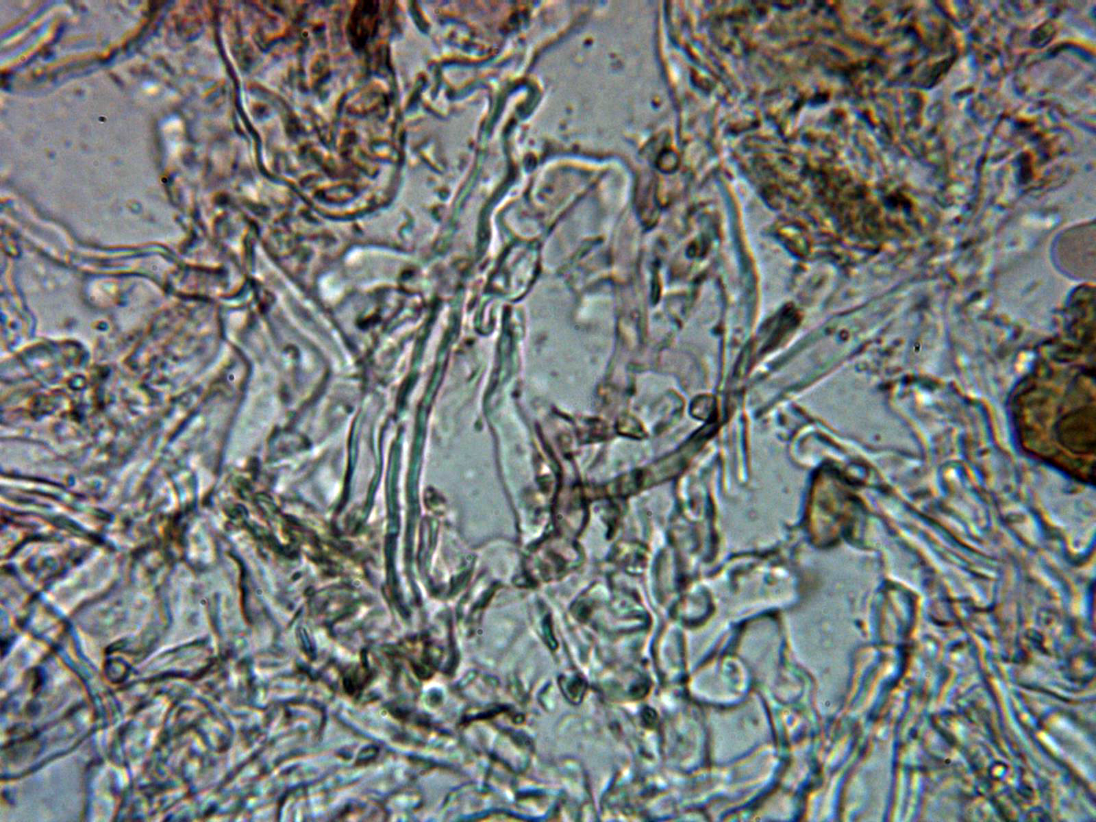Hifas subiculares que sugieren un sistema hifal monomítico formado por hifas generativas aparentemente sin fíbulas, con ramificaciones en ángulo recto y con algunos inflamientos irregulares.