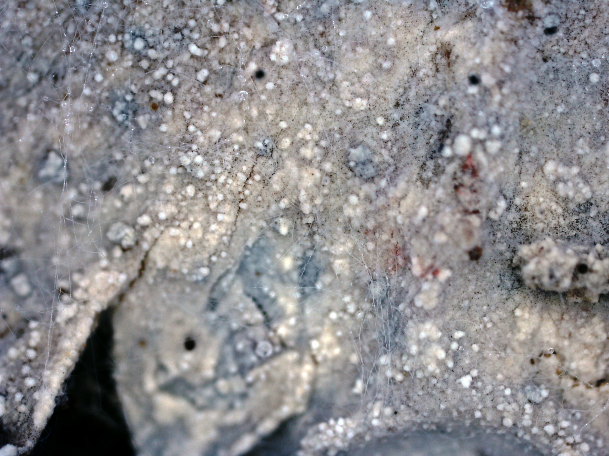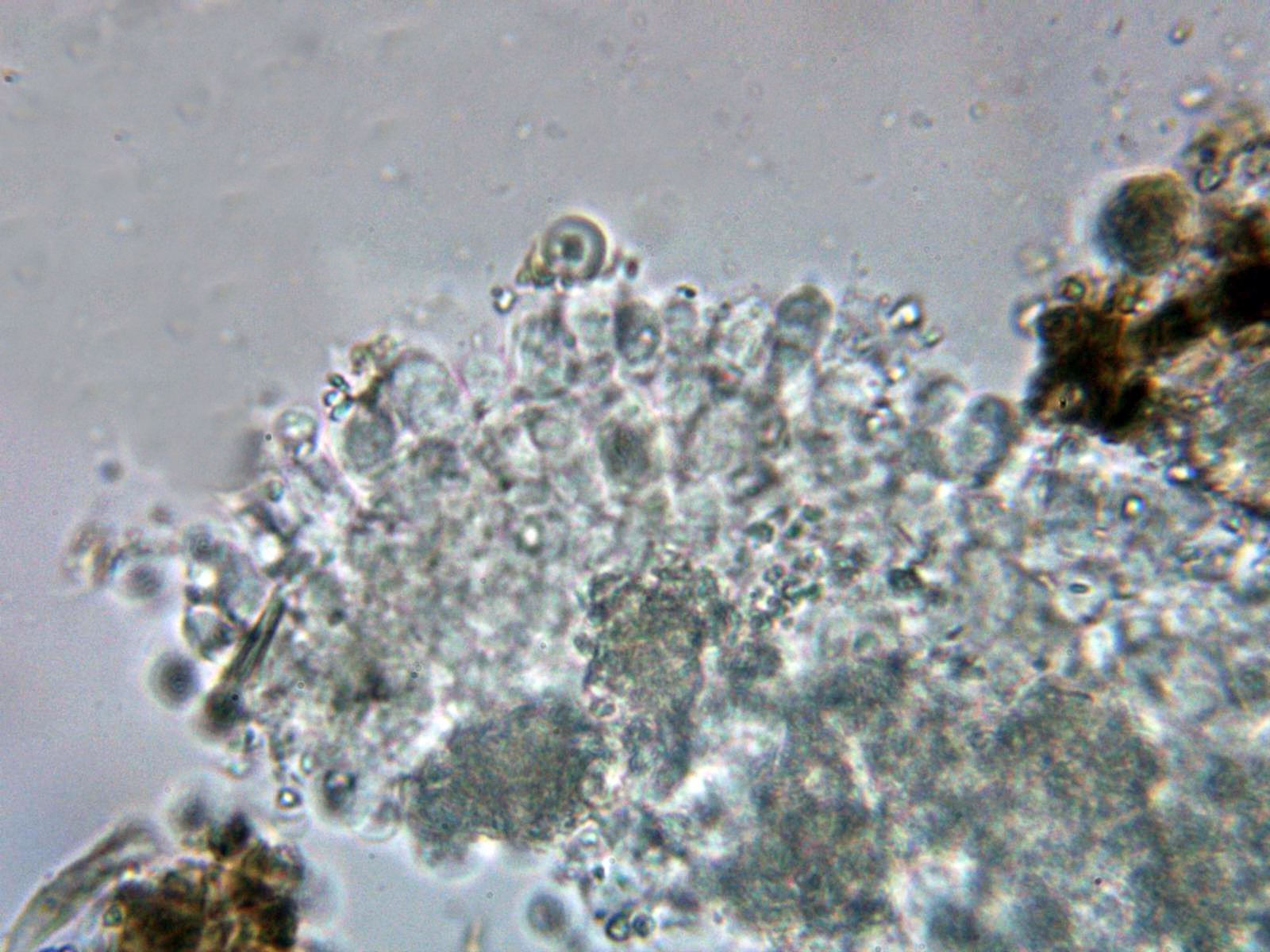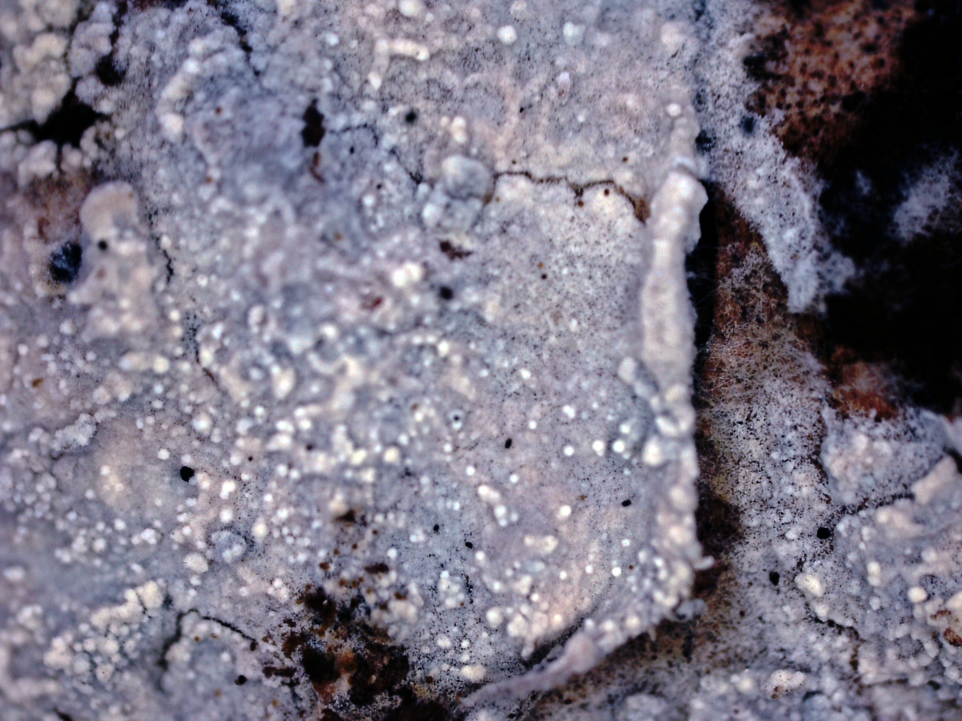 Observaciones: Si bien todos los parámetros parecen coincidir con el Byssocorticium atrovirens, la ausencia de un color claramente azulado en el basidioma me ha hecho dudar de su correcta identificación, esta coloración más pálida se debería muy probablemente a las condiciones de sequía en la que se encontraba en el momento de la toma de imágenes y recogida de muestras, por lo que he considerado prudente el dejar el tema abierto a nuevos estudios de la especie en el futuro.