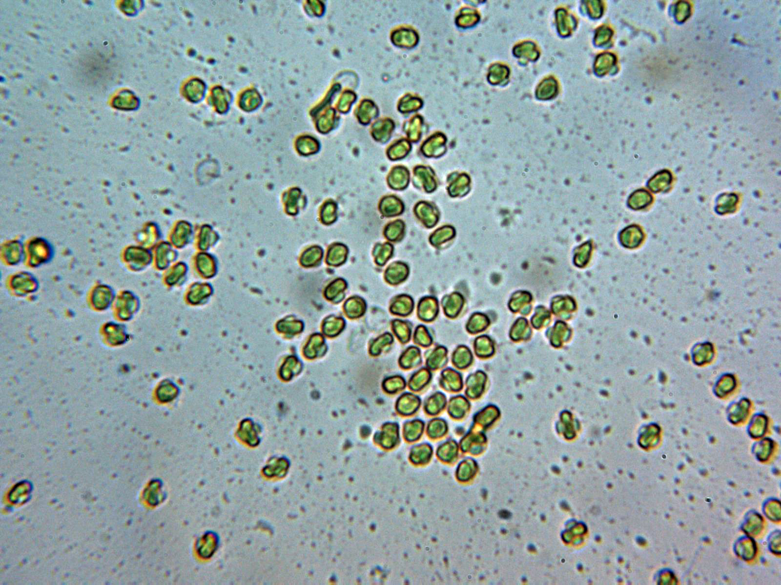 Basidiosporas globosas, inactivas al Melzer, con una marcada apícula y una gran gota lípida en su interior con unas medidas de: