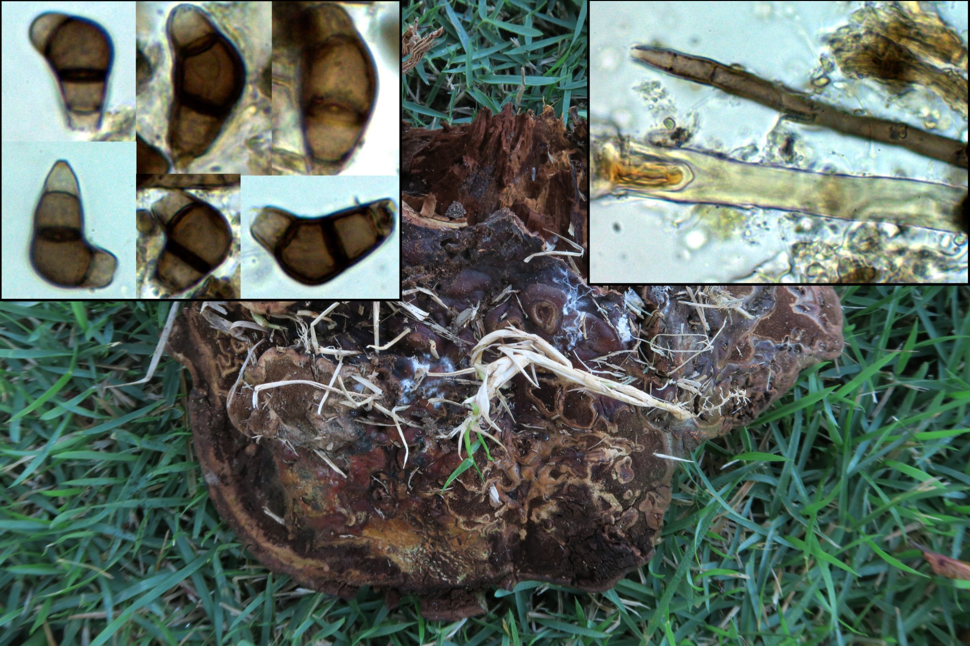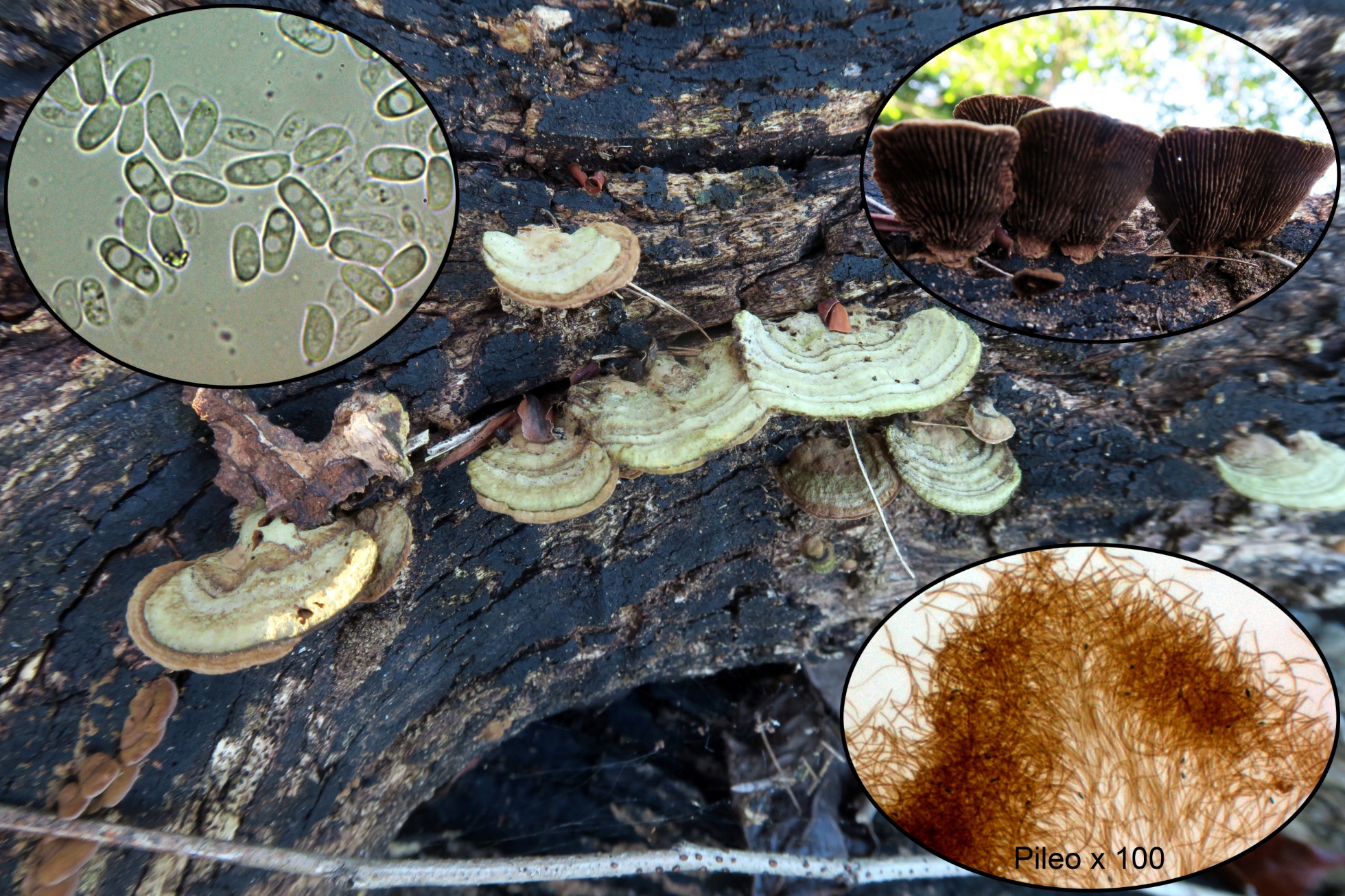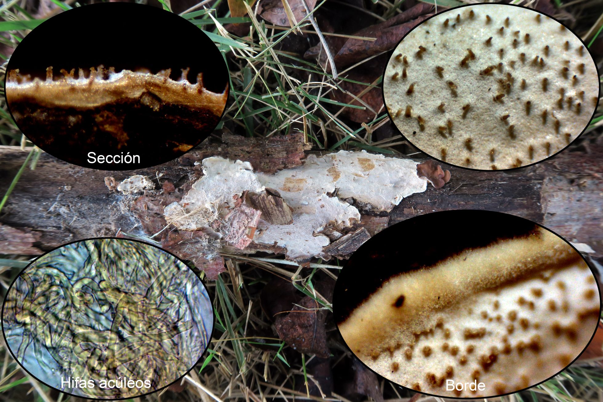 Uno que si bien ya lo había estudiado en un par de ocasiones, nunca había podido obtener esporas por esporulación natural, la Heterochaete delicata, a derstacar los acúleos dispersos de su superficie que son completamente estériles y formados por hifas pigmentadas y entrelazadas entre si: