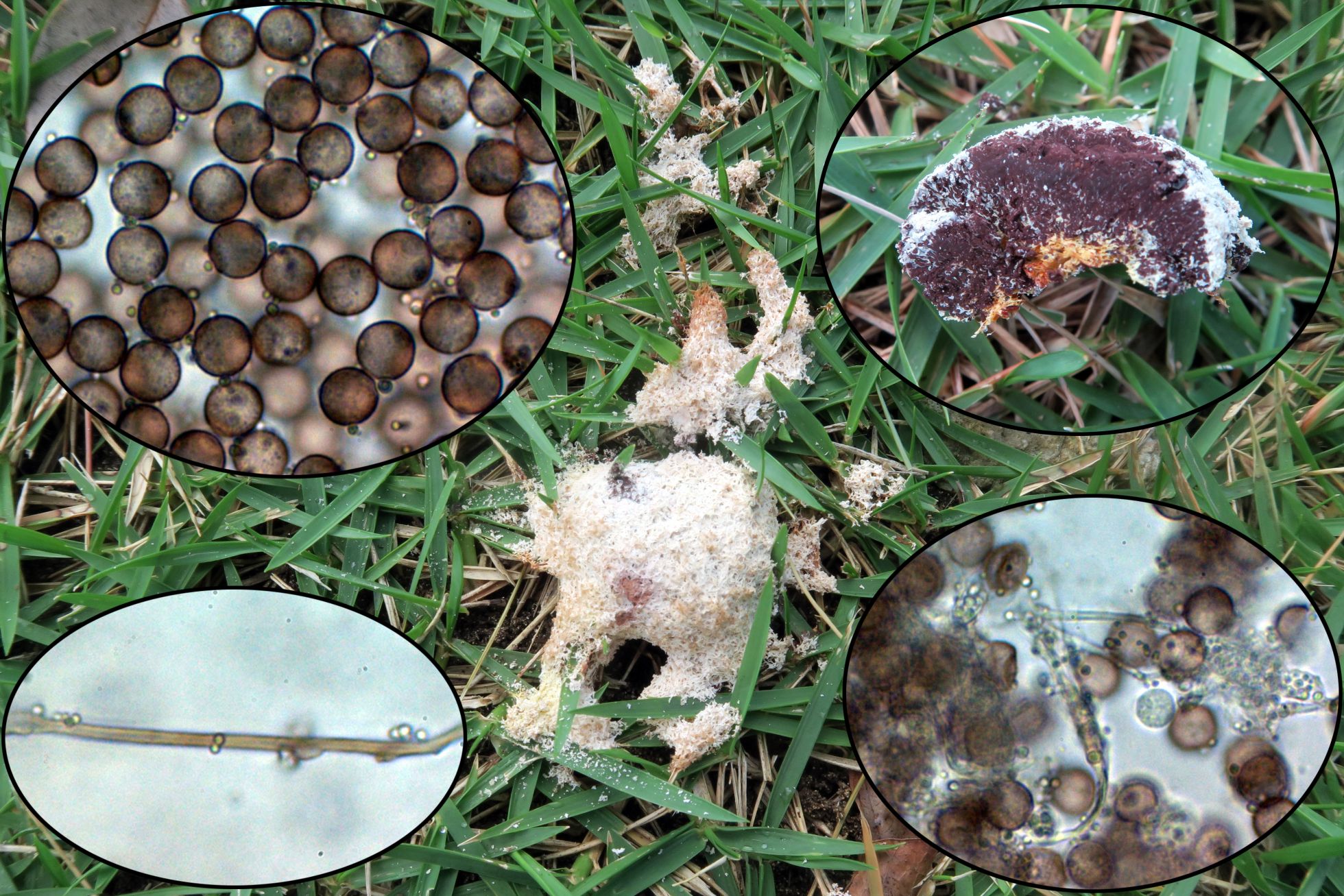 Un Mixomiceto, sobre restos herbáceos del suelo, sus características microscópicas y en especial sus medidas esporales conducen al complejo de la Fuligo septica sl., por sus coloraciones rojizas en algunos puntos y su capilicio pigmentado se podría considerar como la Fuligo septica var. rufa