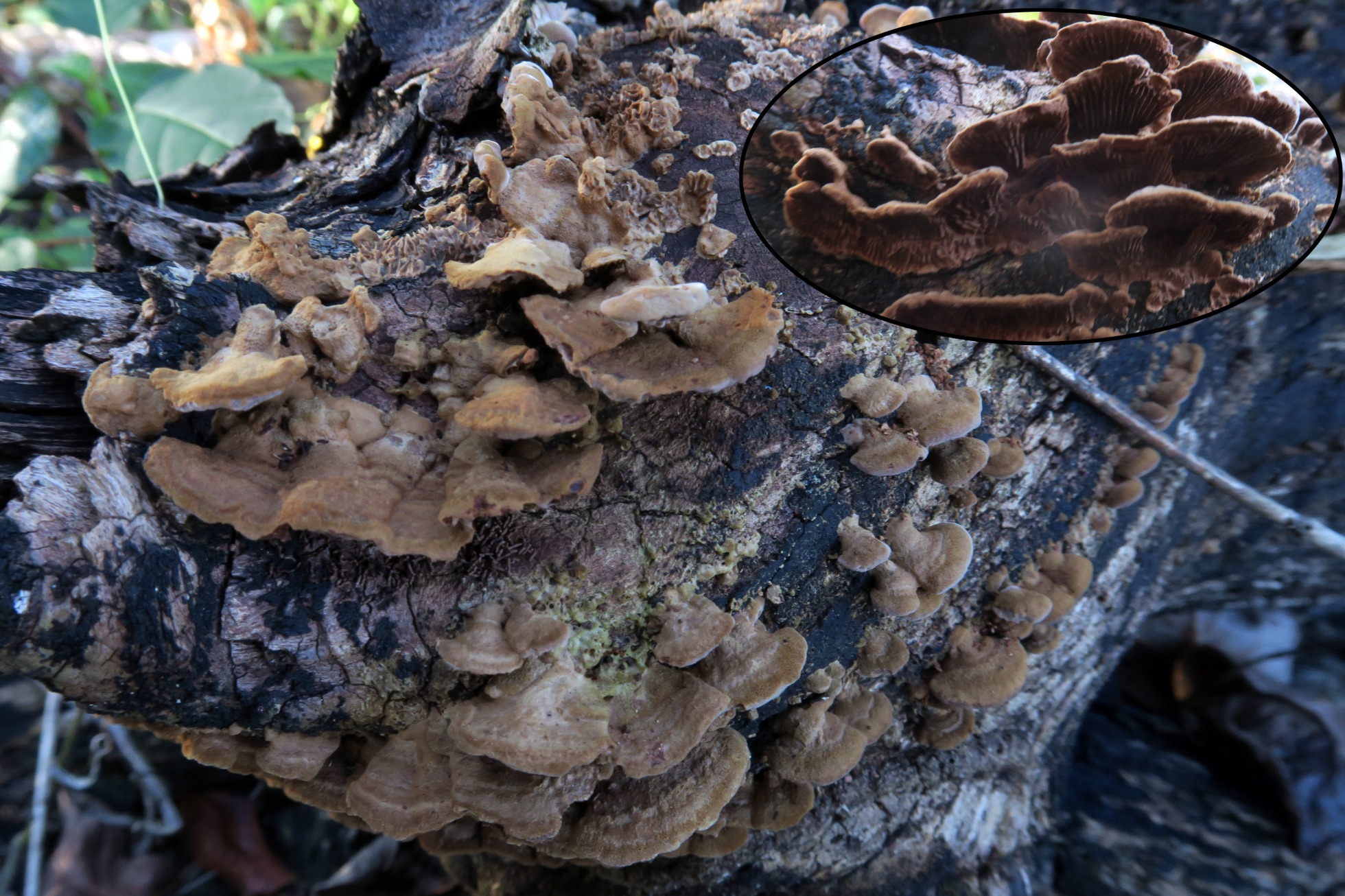 Un Polyporal que llevaba ya algunos años sin ver, con un aspecto bastante distinto en función de la humedad y del desarrollo, el Gloeophyllum striatum
