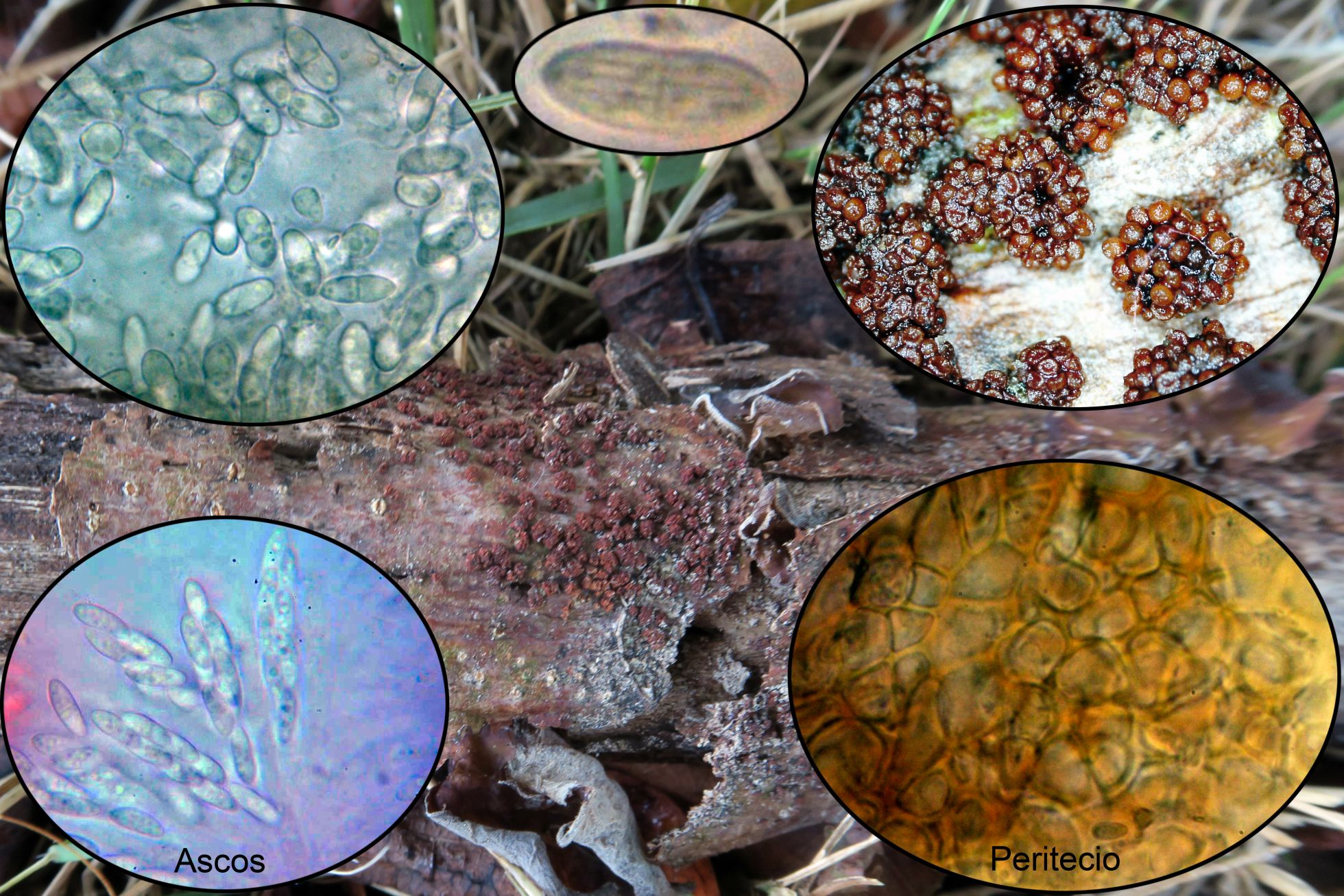 Una Nectria que ya tuve ocasión de estudiar el año pasado, aunque entonces la micro que saqué era bastante mala debido al lamentable estado del equipo de que disponía, la Nectria pseudocinnabarina, a destacar sus esporas con un septo y con estrías longitudinales que se pueden observar con un buen objetivo (miniatura central superior)