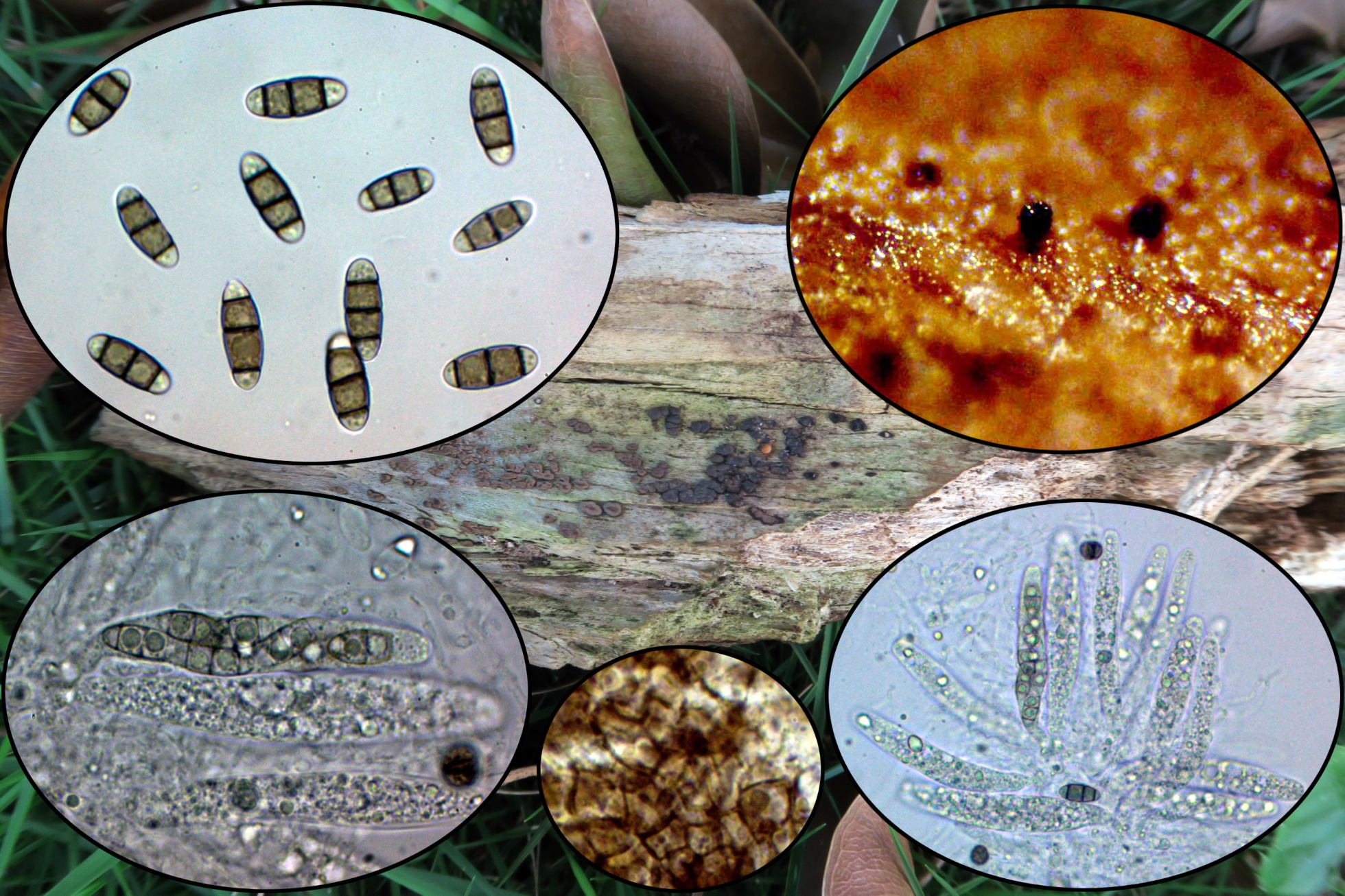 Por el dato de las esporas castaño oscuras en el centro y las dos celdas hialinas de los extremos pienso en Chaetosphaerella, dentro de ellas con unas medidas esporales parecidas tendríamos la Chaetosphaerella indica, actualmente Tengiomyces indicus