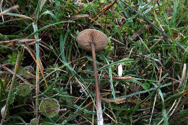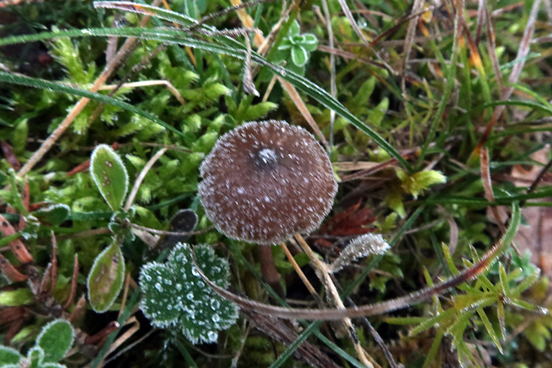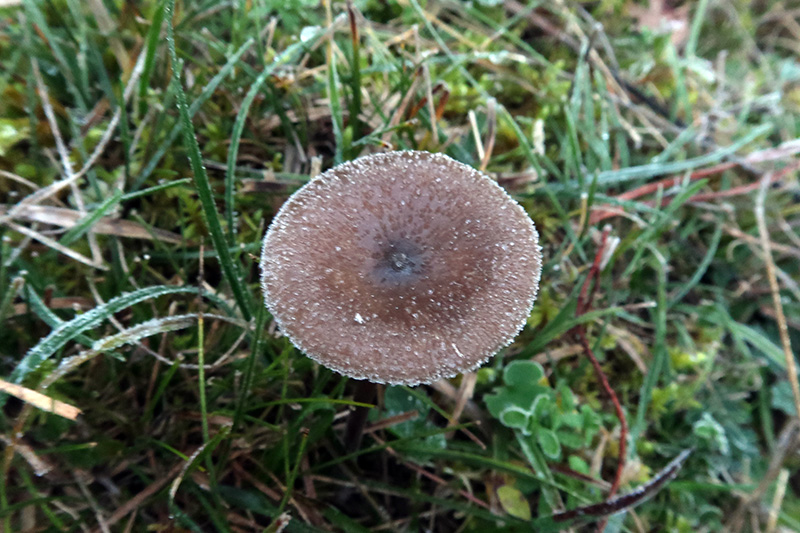 Un par de ejemplares el mayor de entre 3 y 4 cm., sombrero hemisférico para pasar a convexo deprimido con el desarrollo, de color marrón pardusco, más oscuro en el centro para ir esclareciéndose al acercarse al borde, las imágenes resultan un poco desnaturalizadas al estar tomadas a una temperatura de -2ª.
