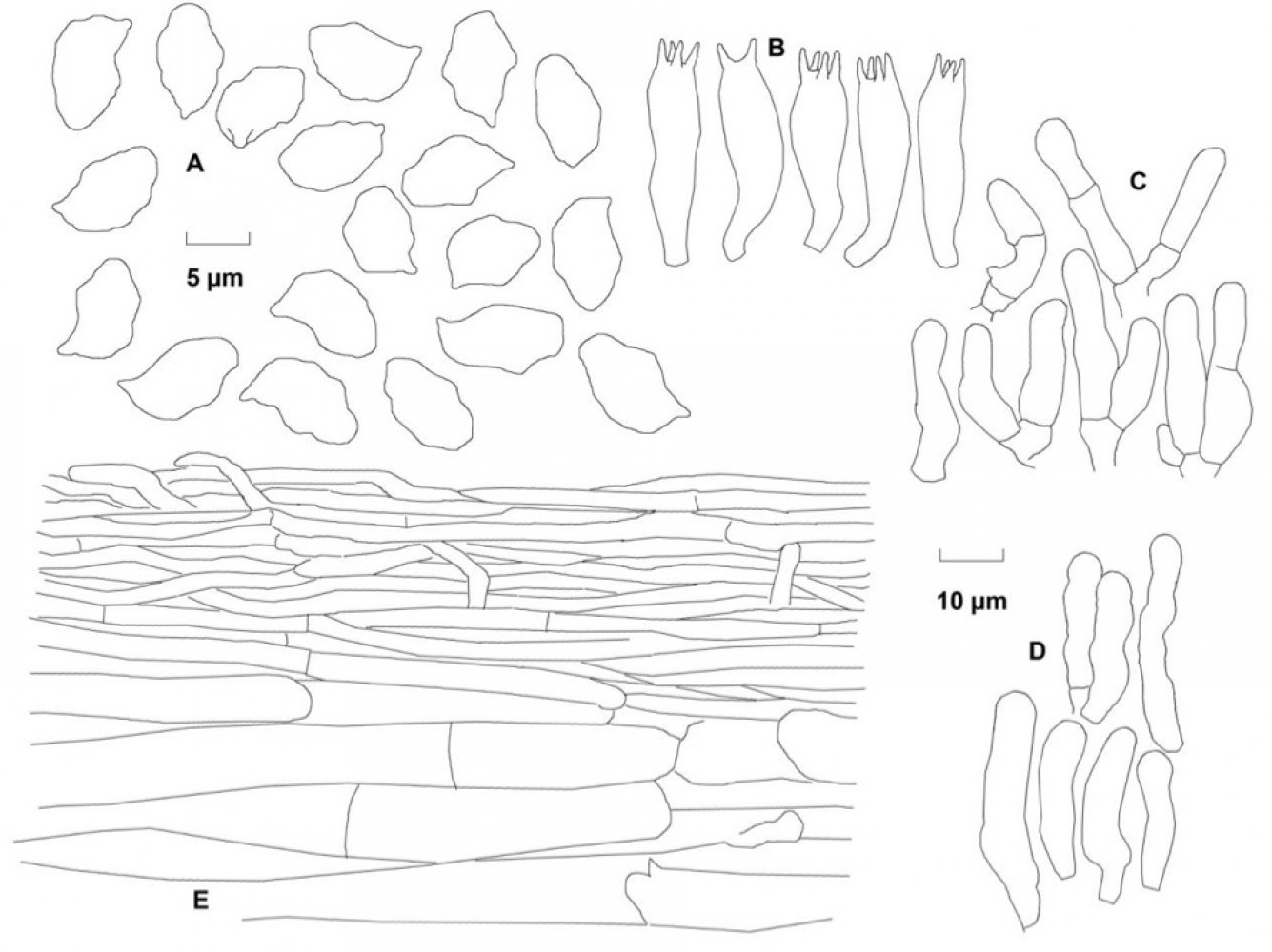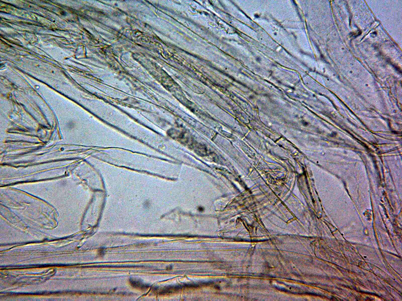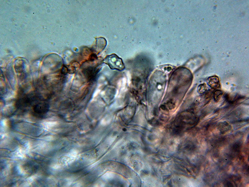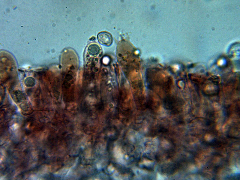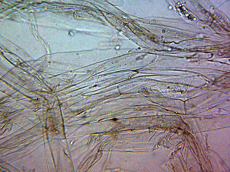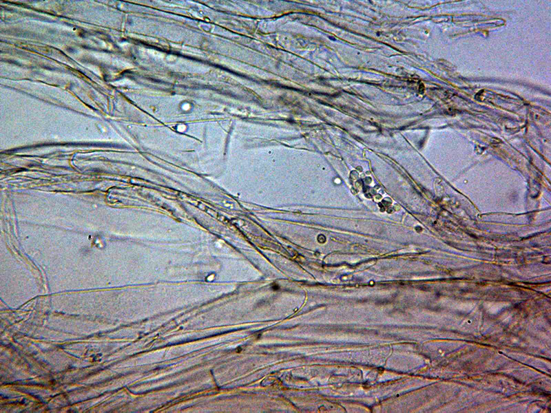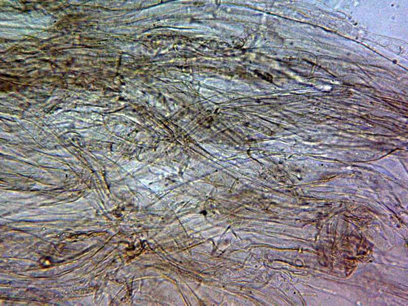 Hifas de la pileipellis dispuestas más o menos paralelamente con una anchura muy variable de entre 6,3 y hasta 33,7 micras, con pigmento intracelular de color pardo y aparentemente sin fíbulas.