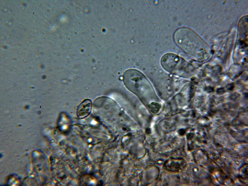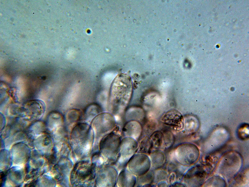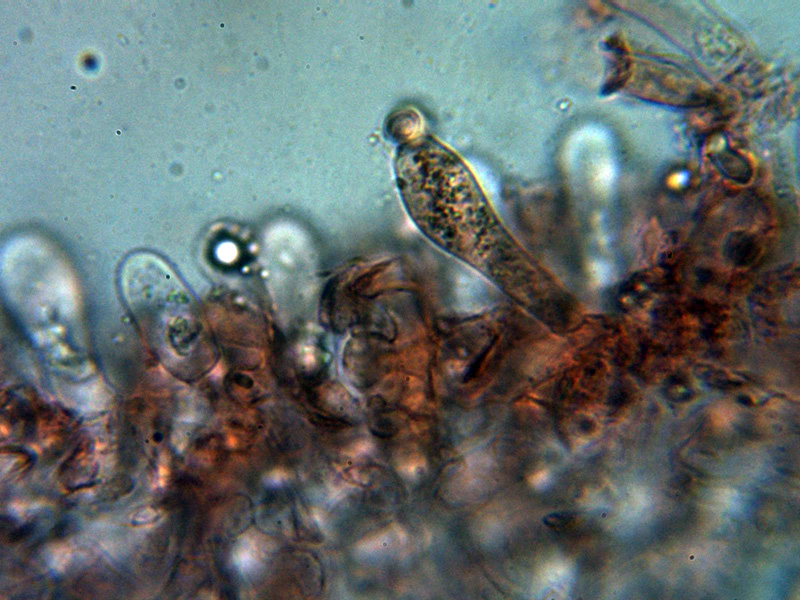 Arista laminar sin elementos claramente diferenciados de los basidios o basidiolos, aunque presenta unas hifas terminales hialinas de un tamaño parecido (20 - 25 × 8.2 - 10.4 µm.) que se podrían corresponder a cistidios.