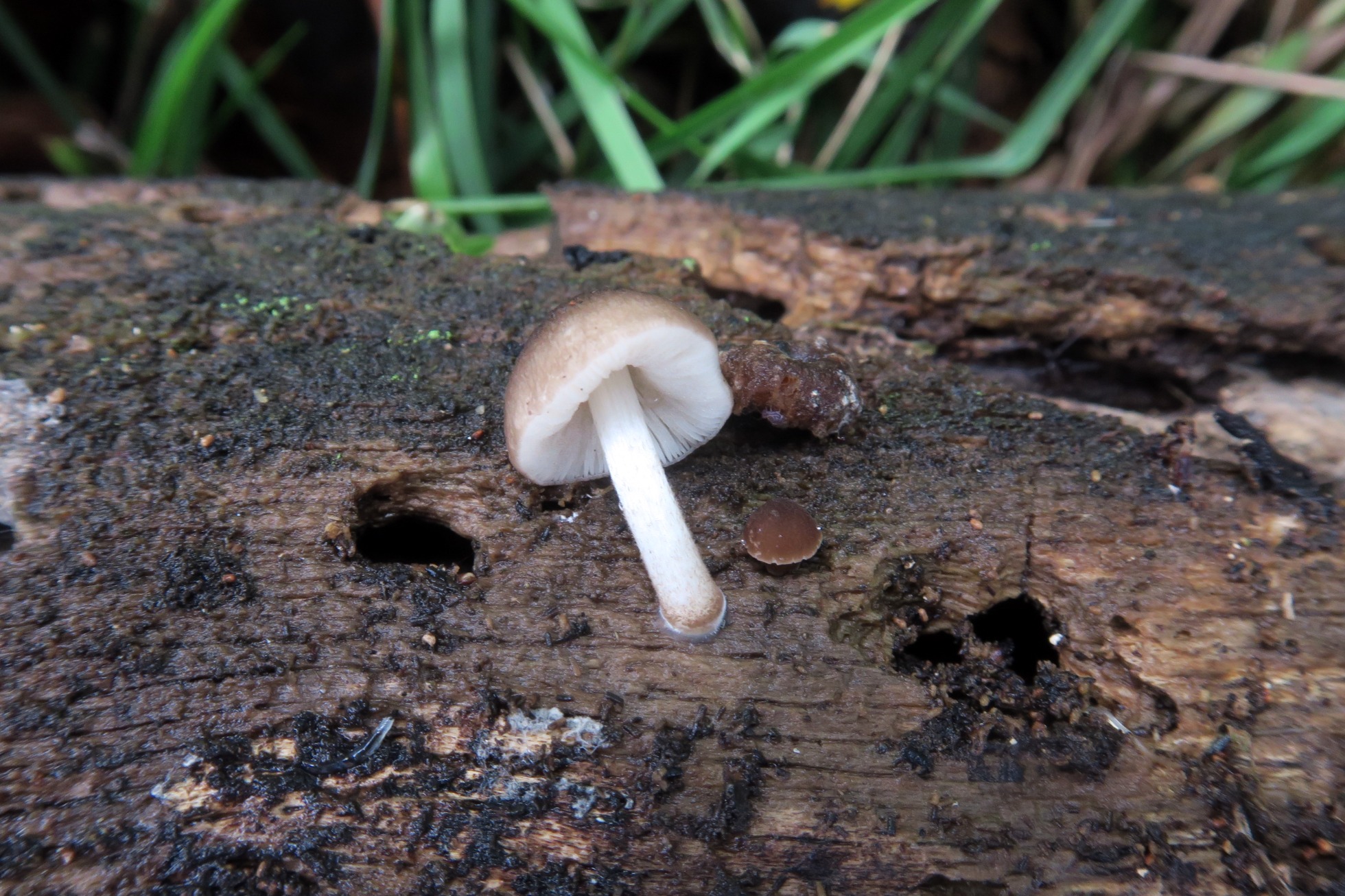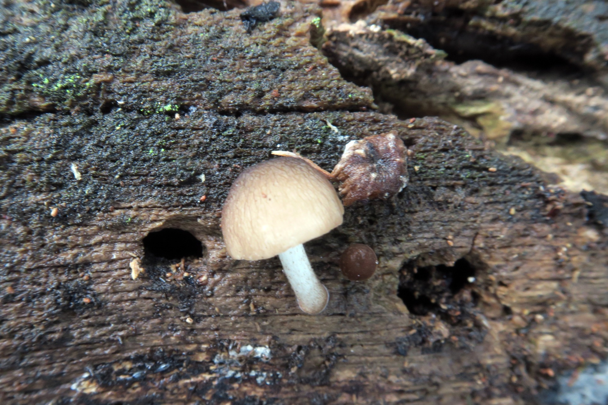 Un Pluteus de pequeño tamaño brotando directamente de un tronco tumbado de árbol tropical indeterminado:
