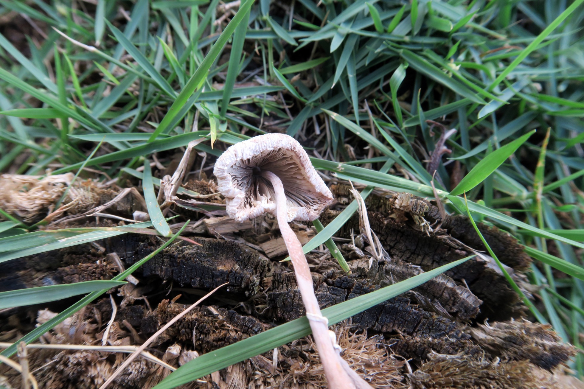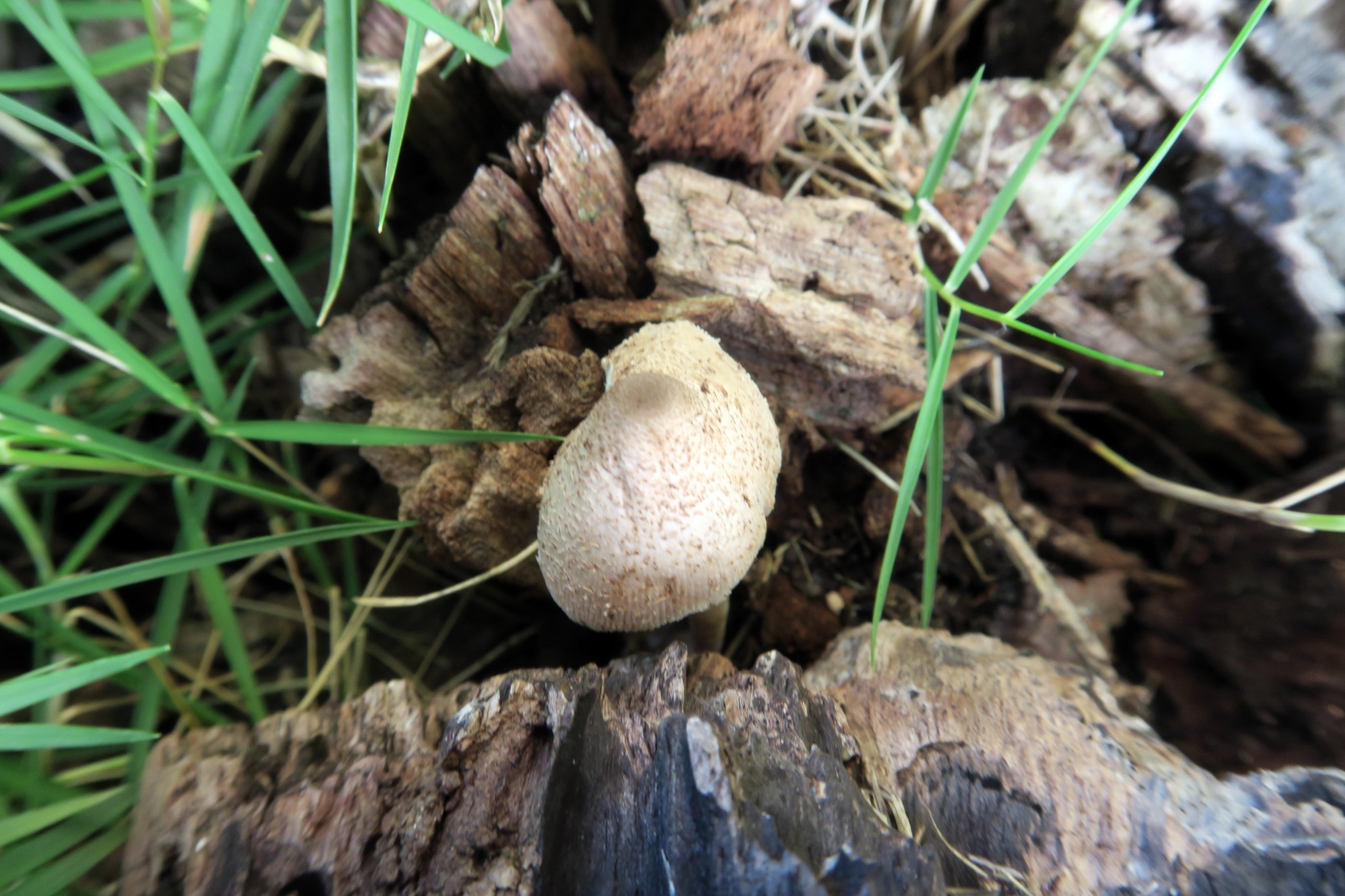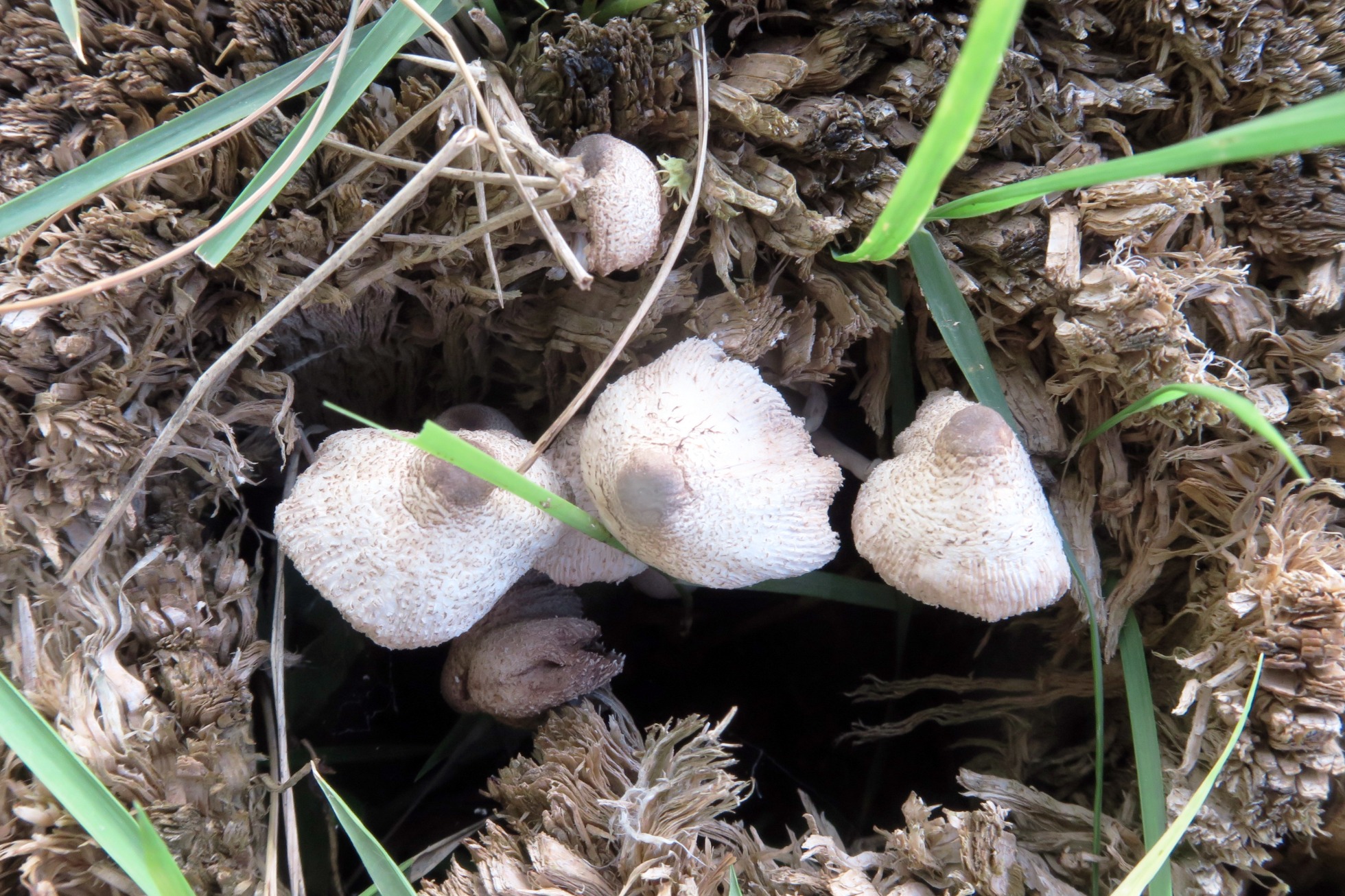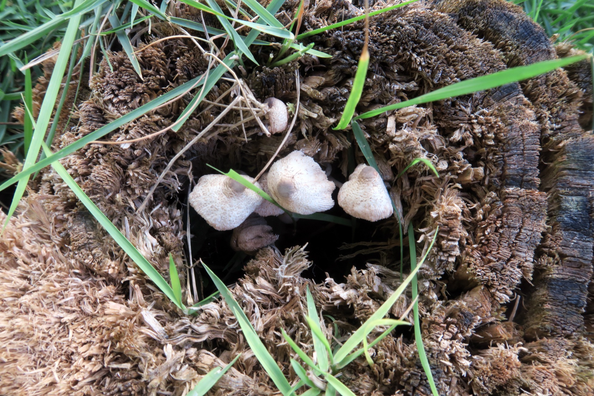 Un grupito de Leucocoprinus fotografiado el pasado 15 de Febrero brotando entre los restos ya bastante degradados de un tocón de planifolio tropical indeterminado.