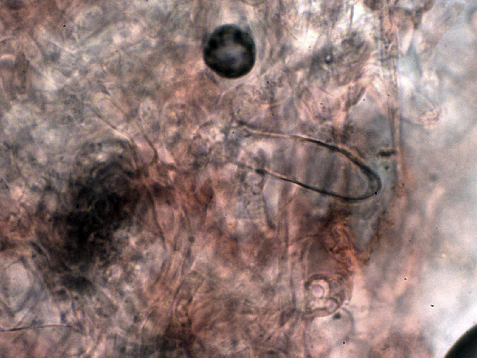 Un cistidio, a su derecha un basidio tetraspórico y más a la derecha una hifa fibulada.
