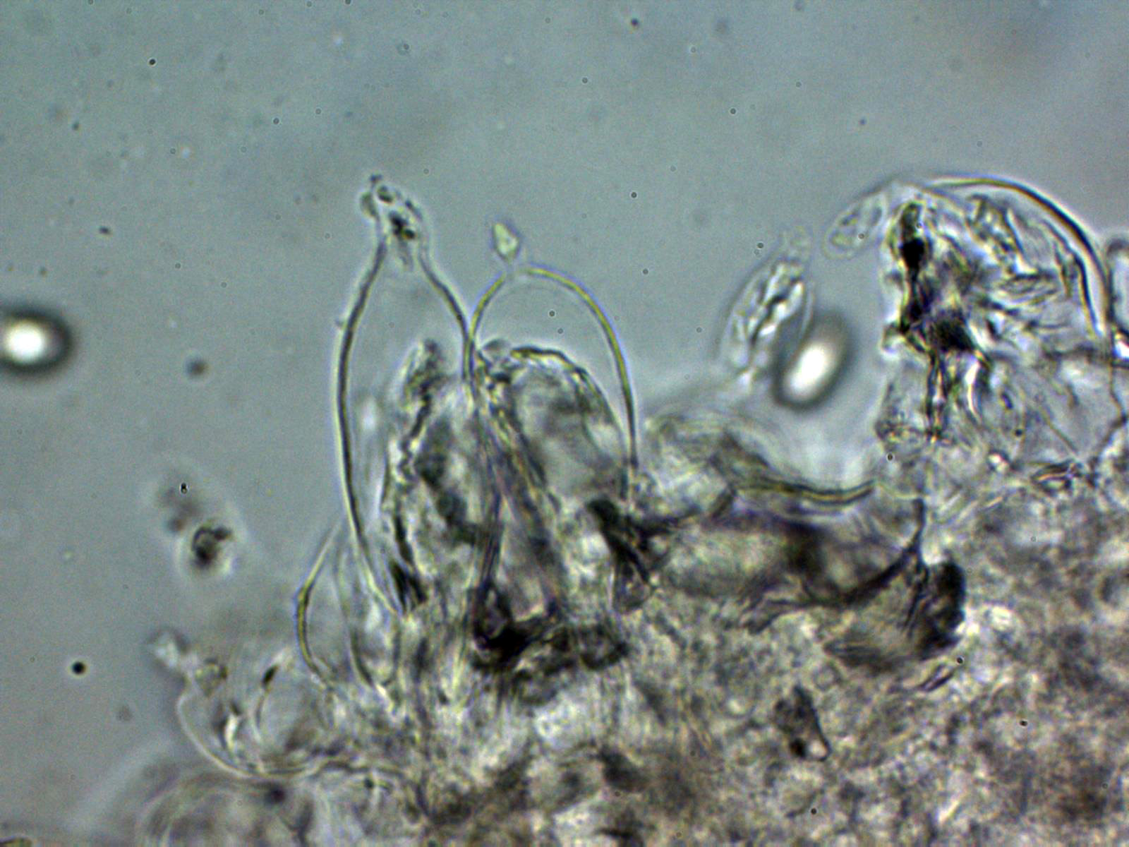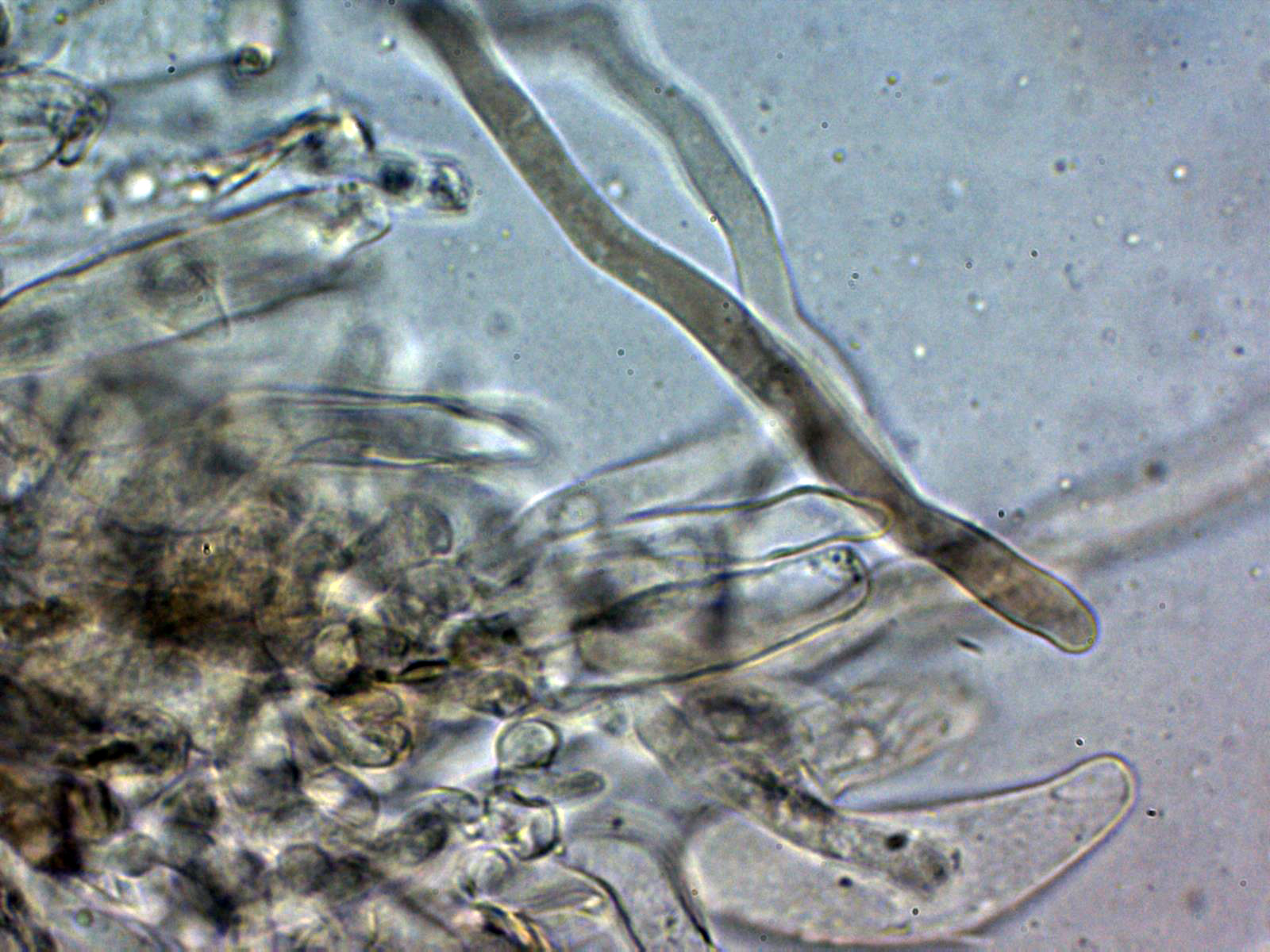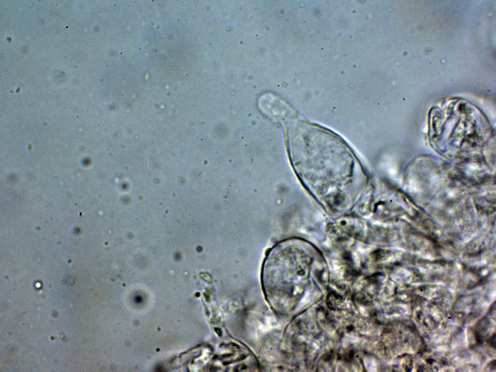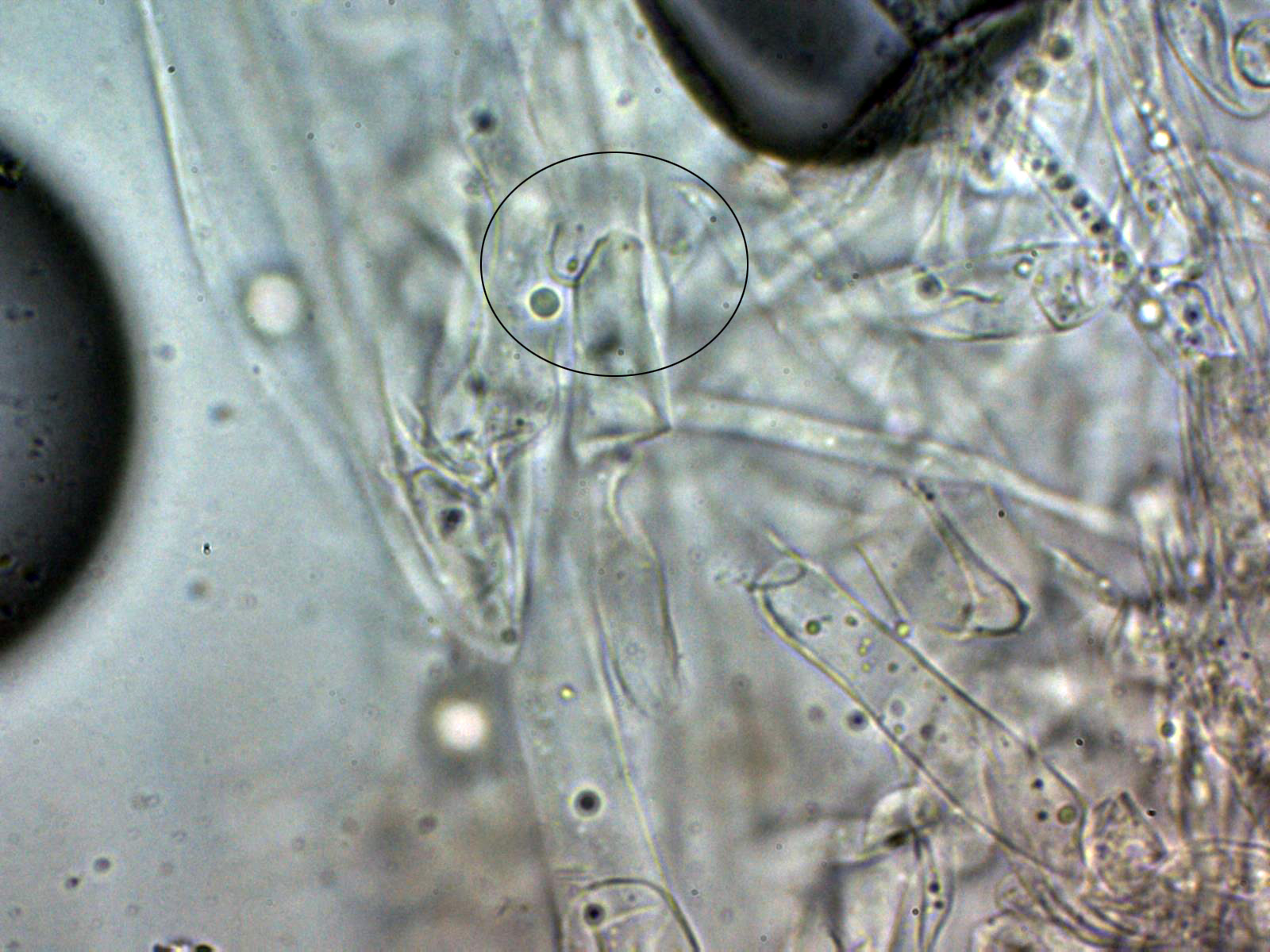 Arita laminar en agua con abundantes queilocistidios ensanchados en su base y terminado con un largo cuello.