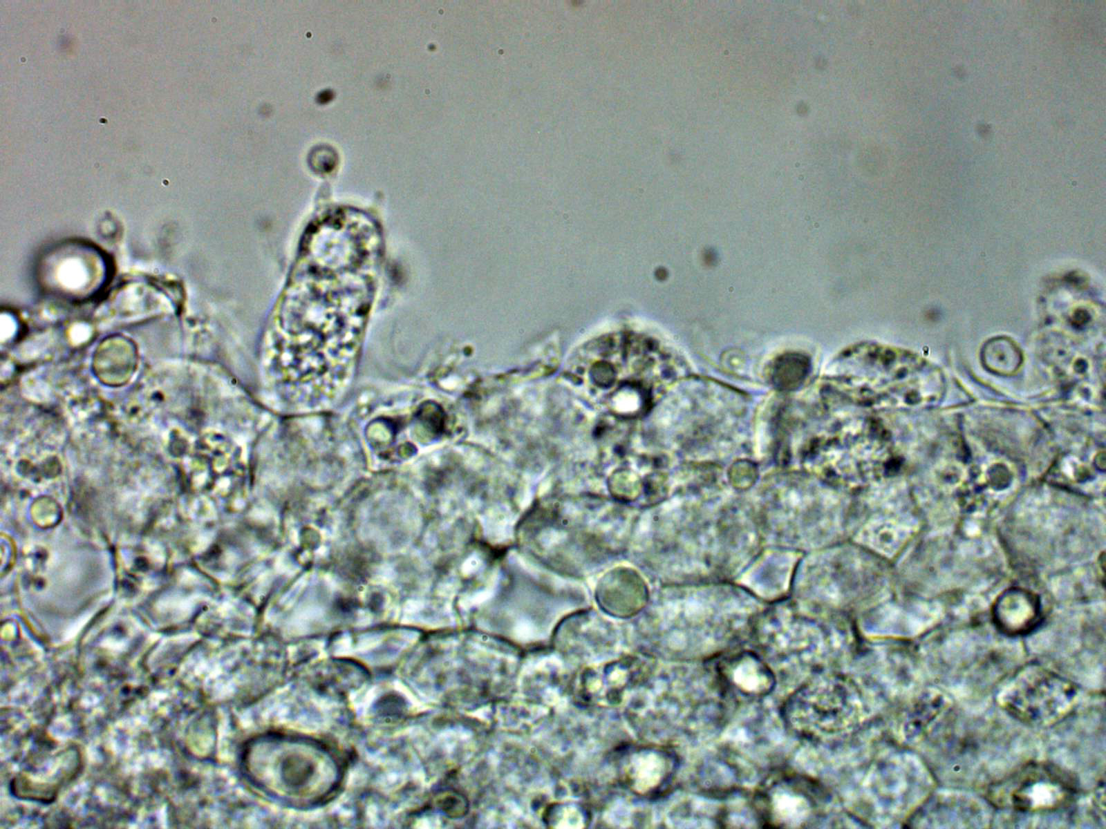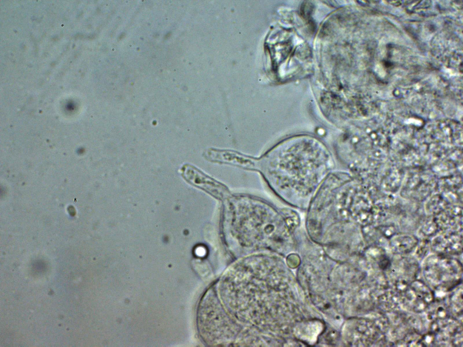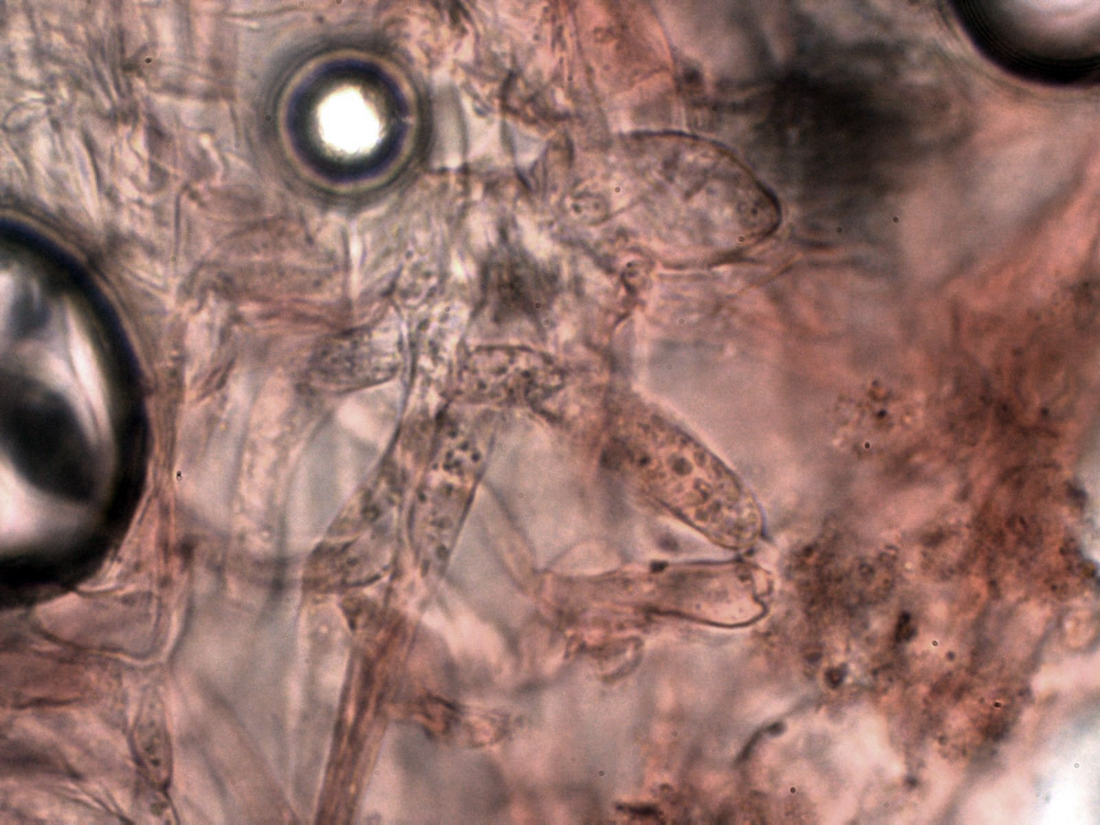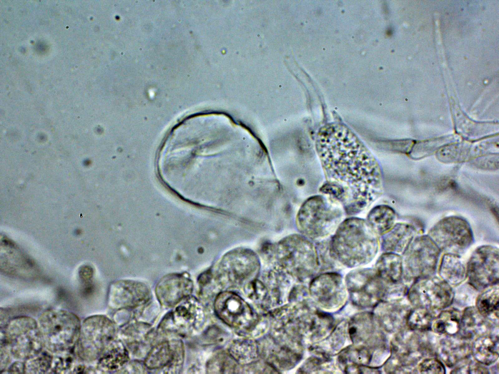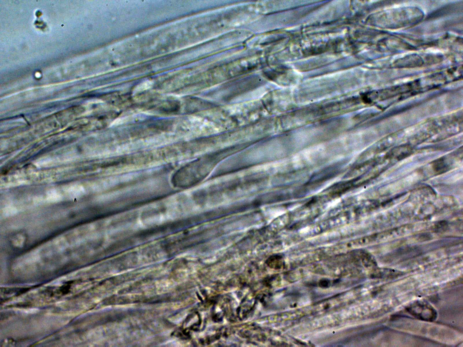 Arita laminar en agua con abundantes queilocistidios ensanchados en su base y terminado con un largo cuello.