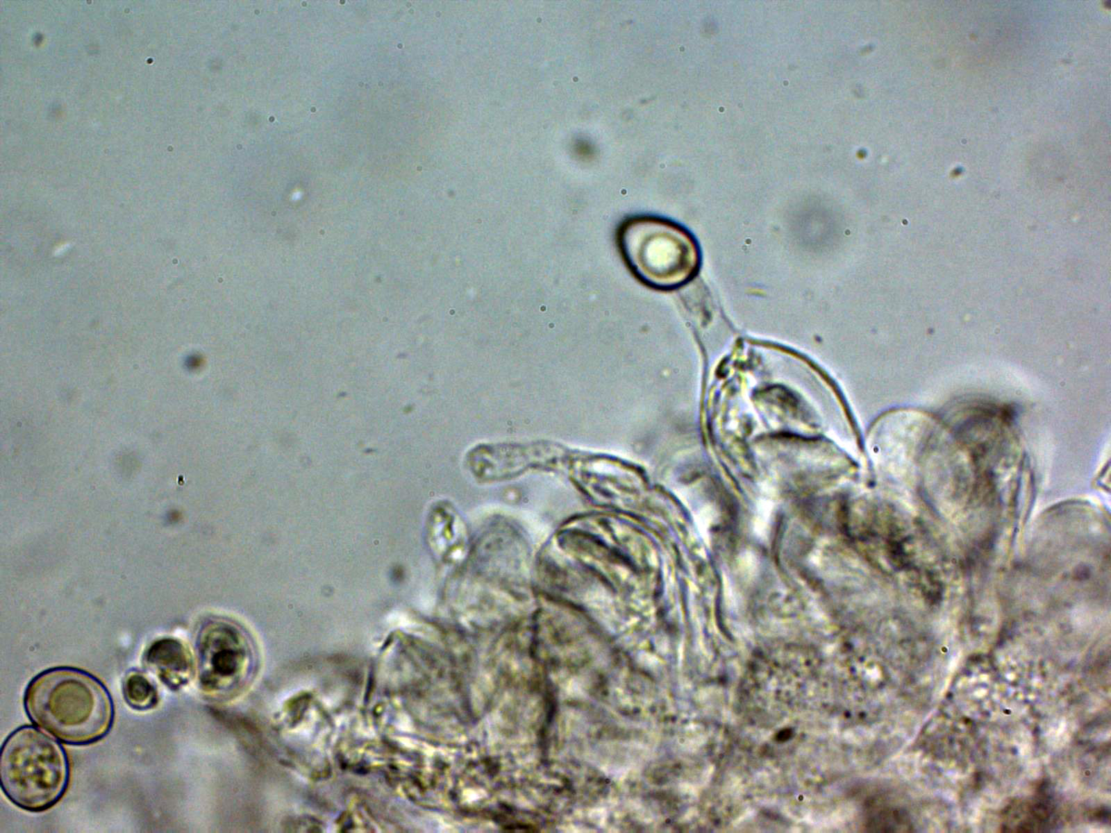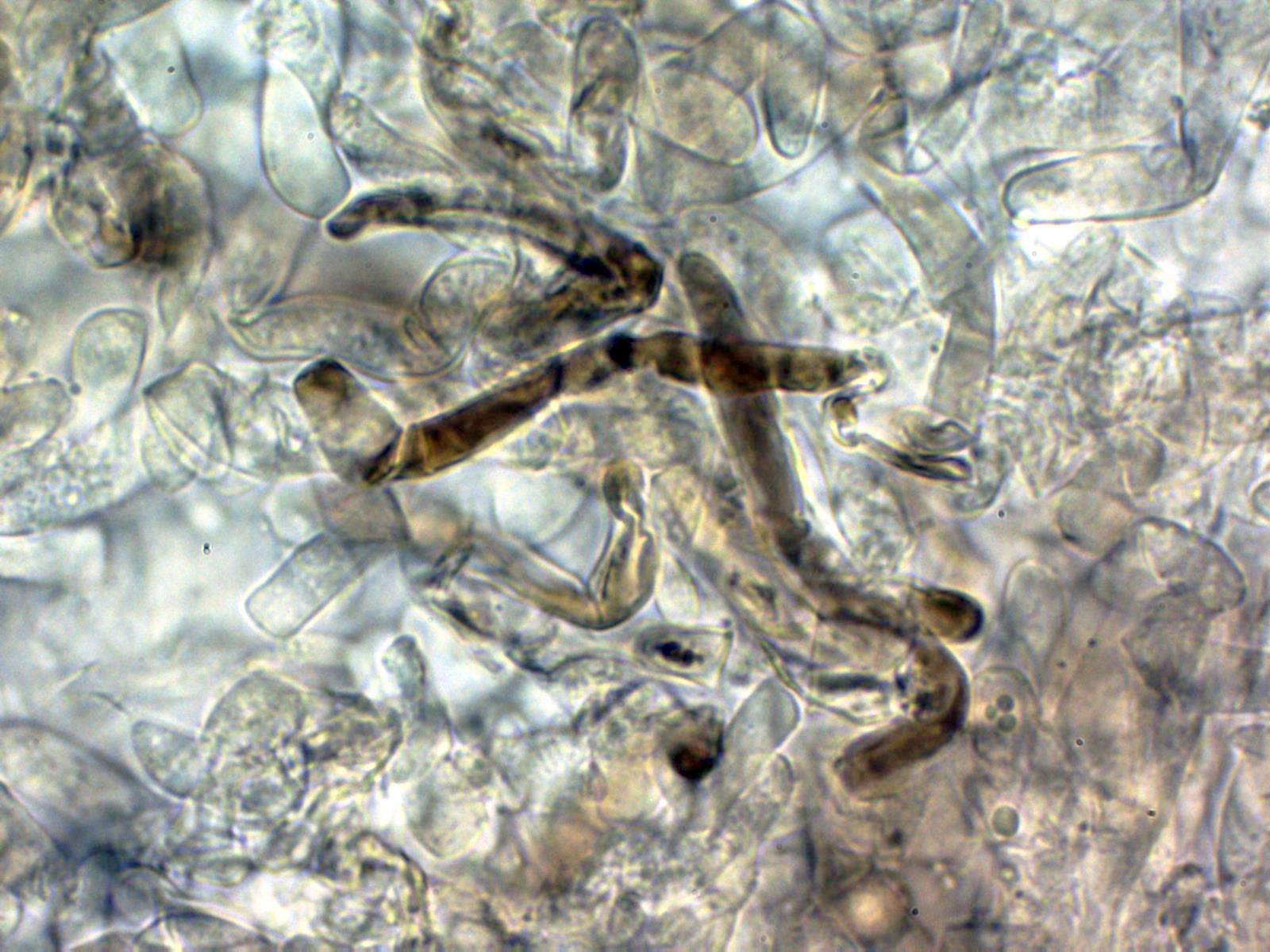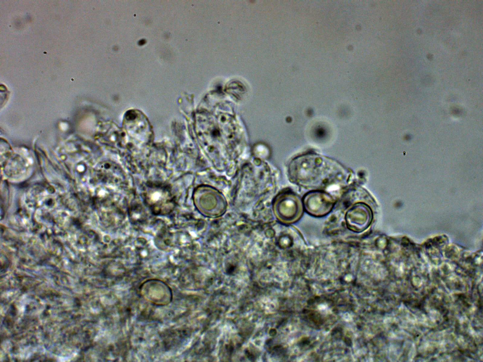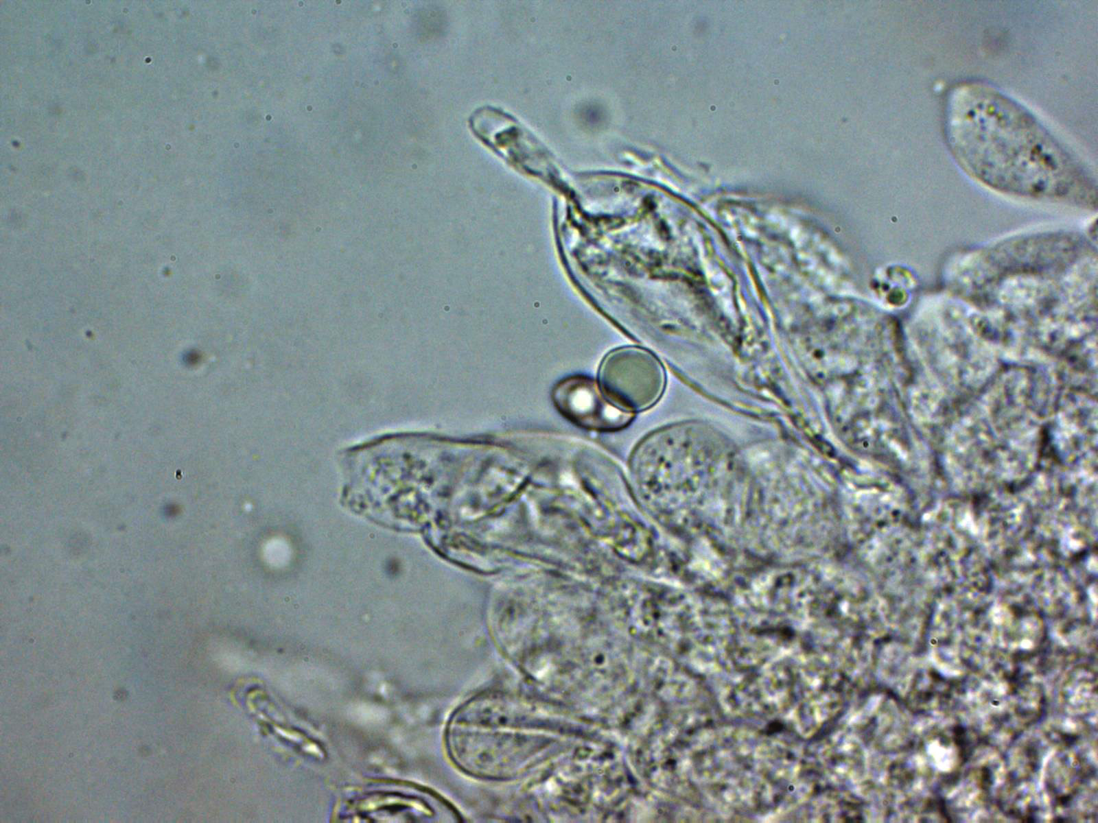 Arita laminar en agua con abundantes queilocistidios ensanchados en su base y terminado con un largo cuello.