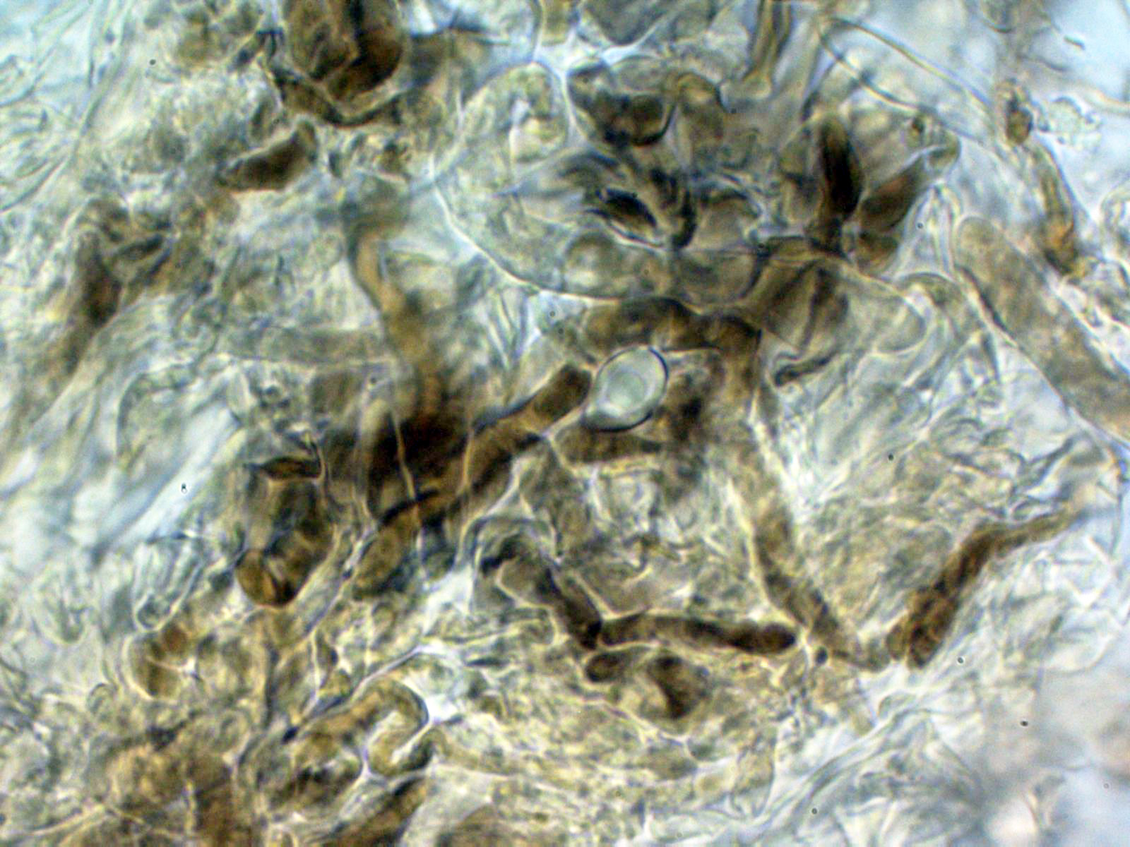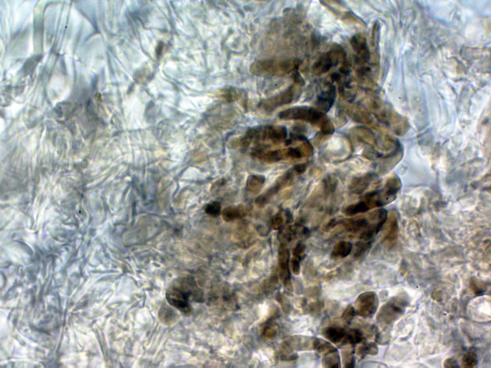 Hifas de las escamas del sombrero con pigmento intracelular marrón: