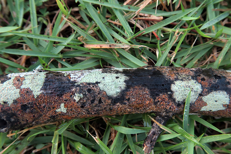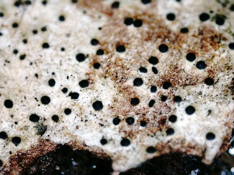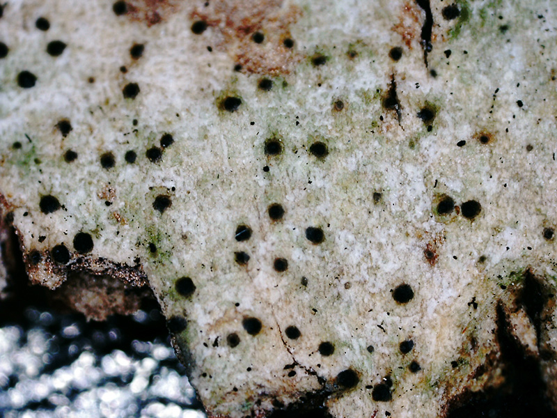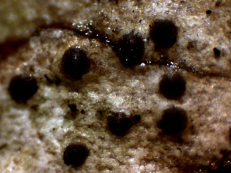 Apotecios de entre 0,25 a 0,39 mm., de clolor negro a modo de granos sobre un talo blanquecino anaranjado que oscurece débilmente con el KOH.