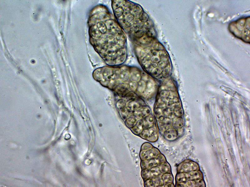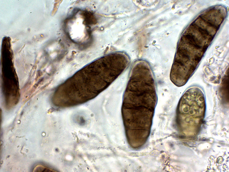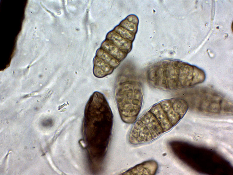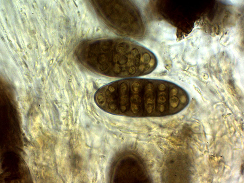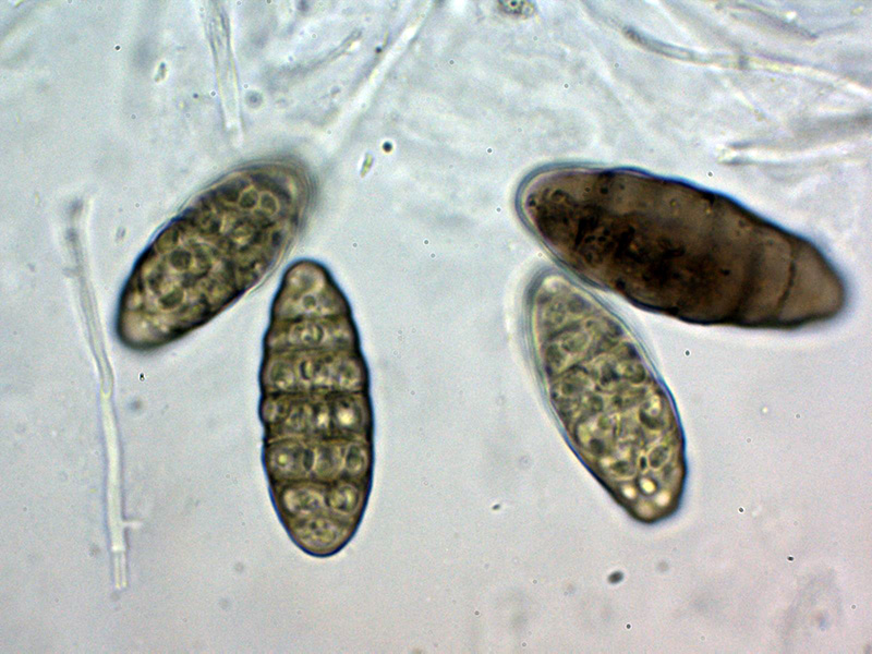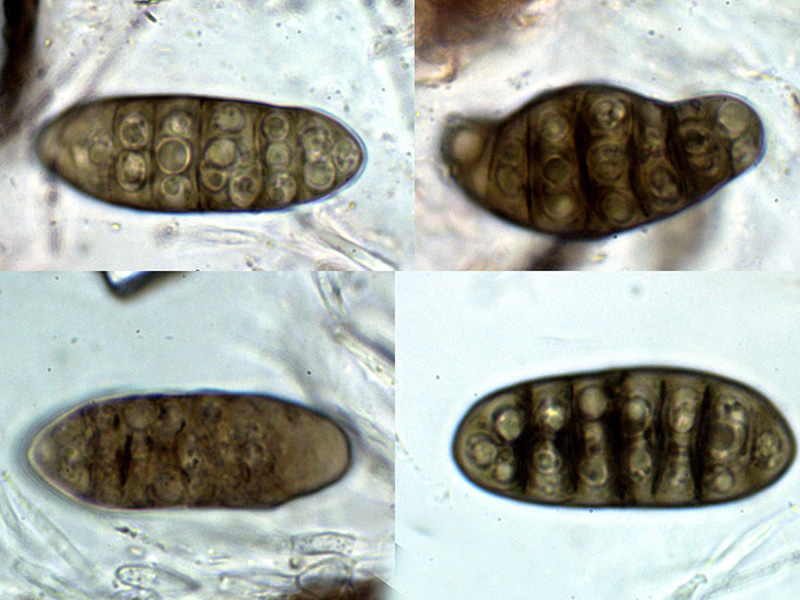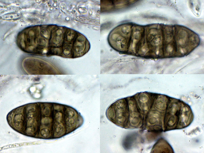 Ascosporas moriformes, las inmaduras hialinas para ir coloreándose de marrón con el desarrollo, las inmaduras mayoritariamente con 7 septos y con constreñimiento en los mismos, estos septos se reducen a entre 4 y 6 en las ascosporas maduras en las que ya no se aprecian los constreñimientos.