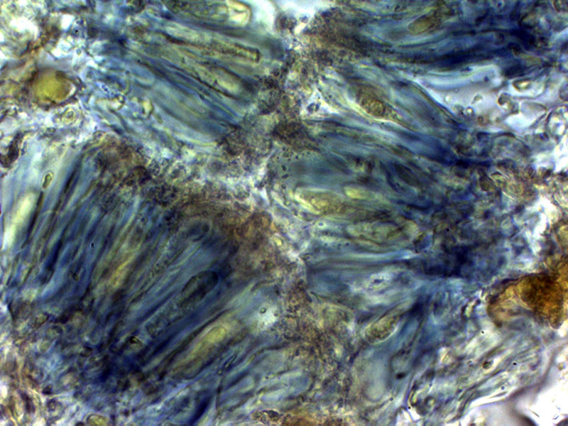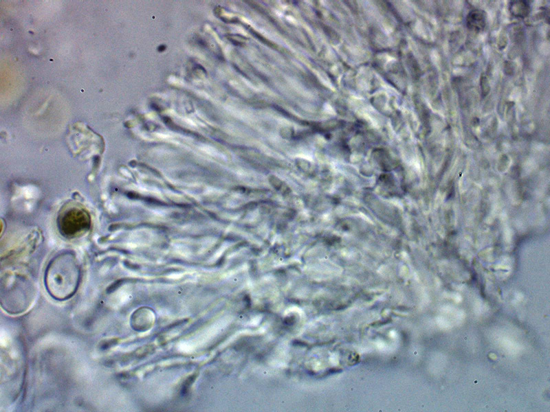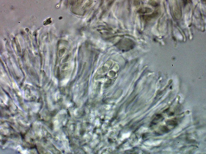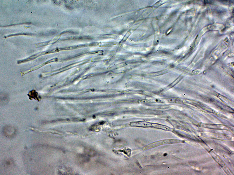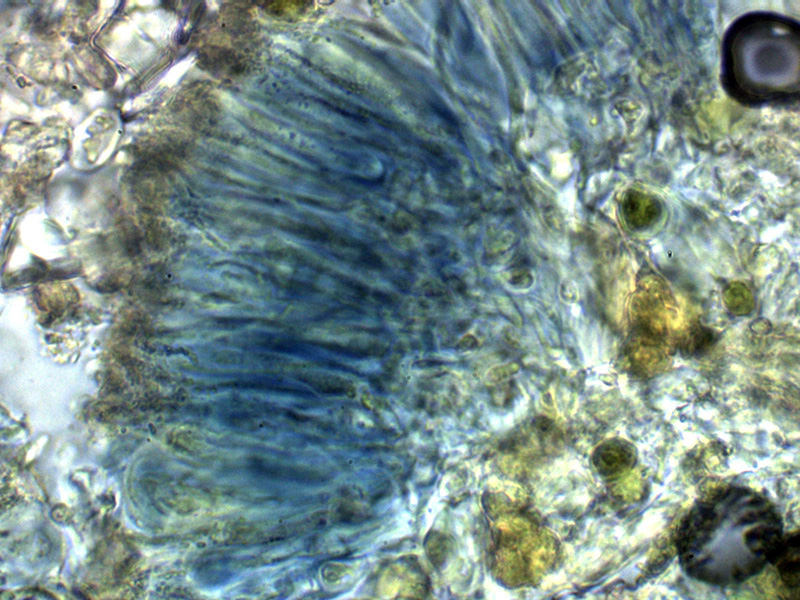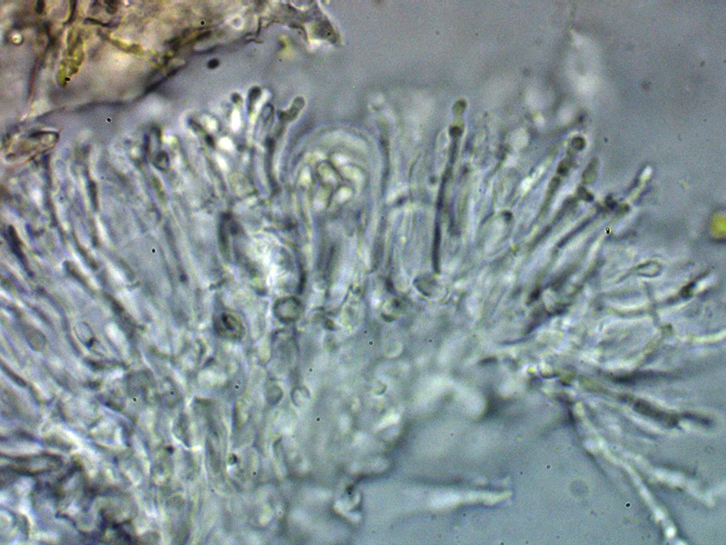 Paráfisis filiformes, estrechas, algunas ramificadas en el ápice que sobresalen ligeramente por encima del nivel de los ascos, con contenido que se oscurece levemente con HOH al igual que con el Reactivo de Melzer, sin pigmento apical observado.