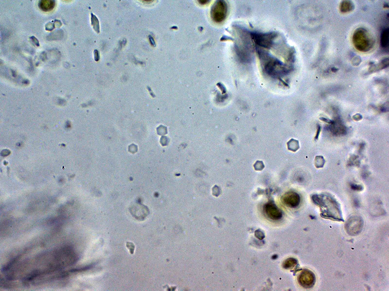 También observados unos pequeños cristales hexagonales en las muestras que se disuelven en KOH.
