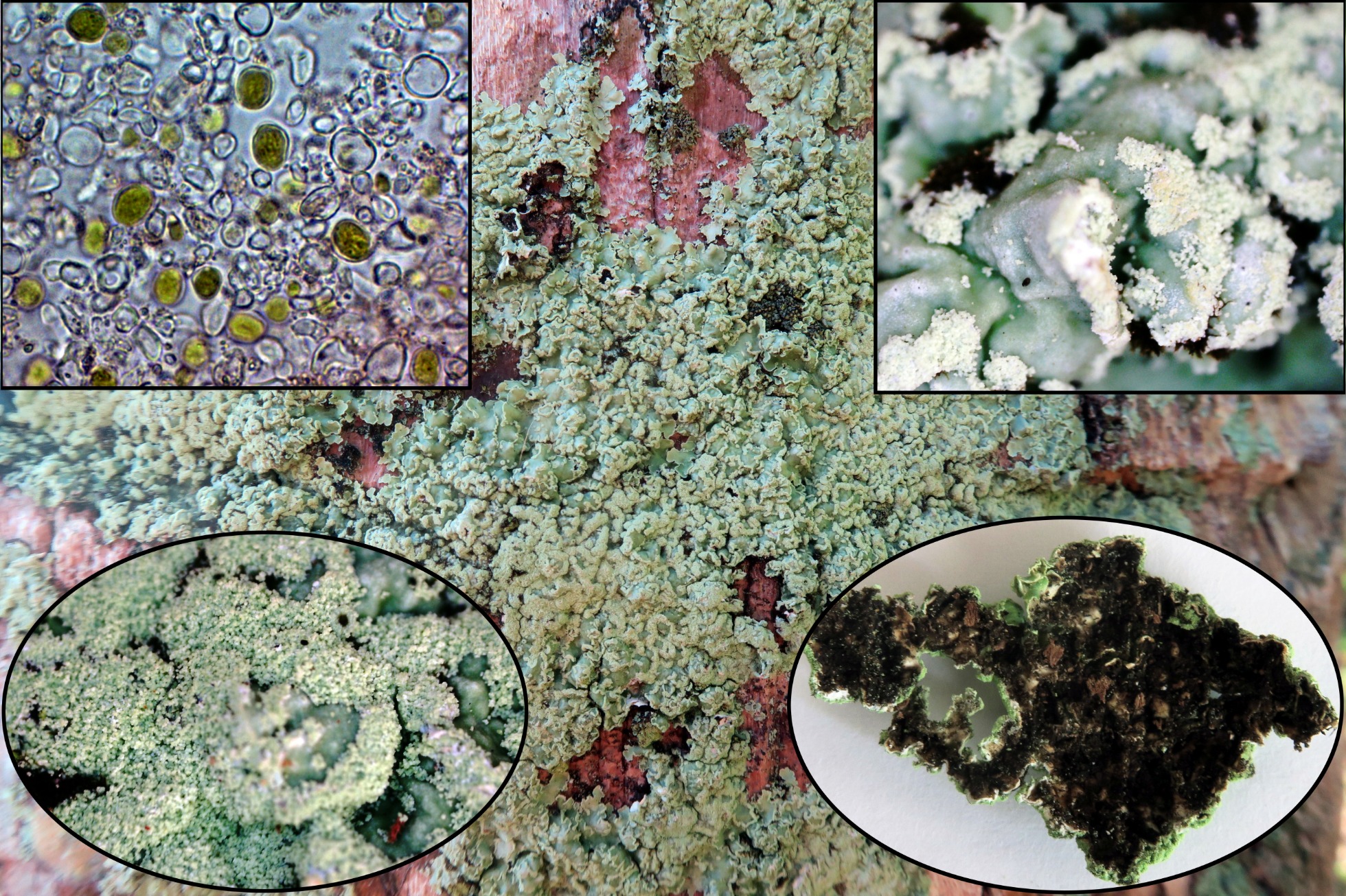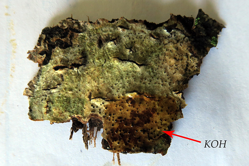 Parches de entre 1 y 2 cm. a lo sumo, con un talo tenue, muy fino de color blanquecino grisáceo, que reacciona a amarillo verdoso con KOH al 20%.
