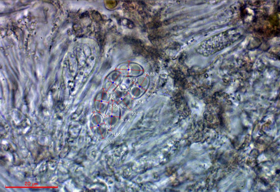 Ascosporas no obtenidas, las ascosporas dentro del asco con unas medidas de (8.2) 8.3 - 10.8 (11.7) × (3.6) 3.8 - 5.9 (6) µm.