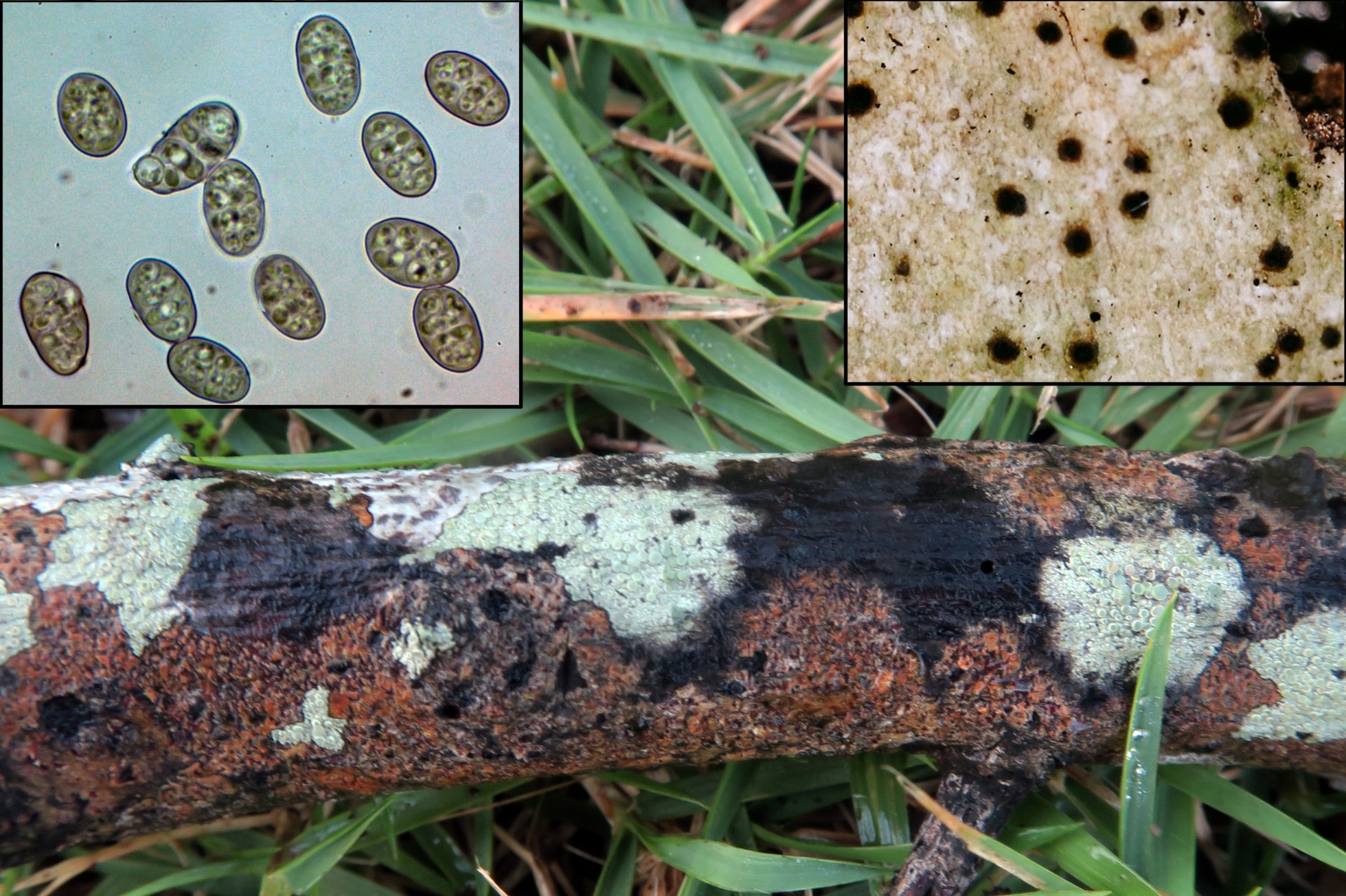 Observaciones; Especie que previamente tenía identificada como la muy parecida Pyrenula astroidea, para la que se indican en las Claves de Harris unas medidas esporales de 33-42 x 13-18 µm., atendiendo a las mismas Claves con esporas con unas medidas de 37-51 x 14-19 µm. (totalmente acordes con las del presente estudio) con sustancia oleosa incolora tendríamos la Pyrenula oleosa propuesta. La Pyrenula oleosa a día de hoy sigue sin estar registrada como tal en Index Fungorum, aunque si que aparece en Mycobank.