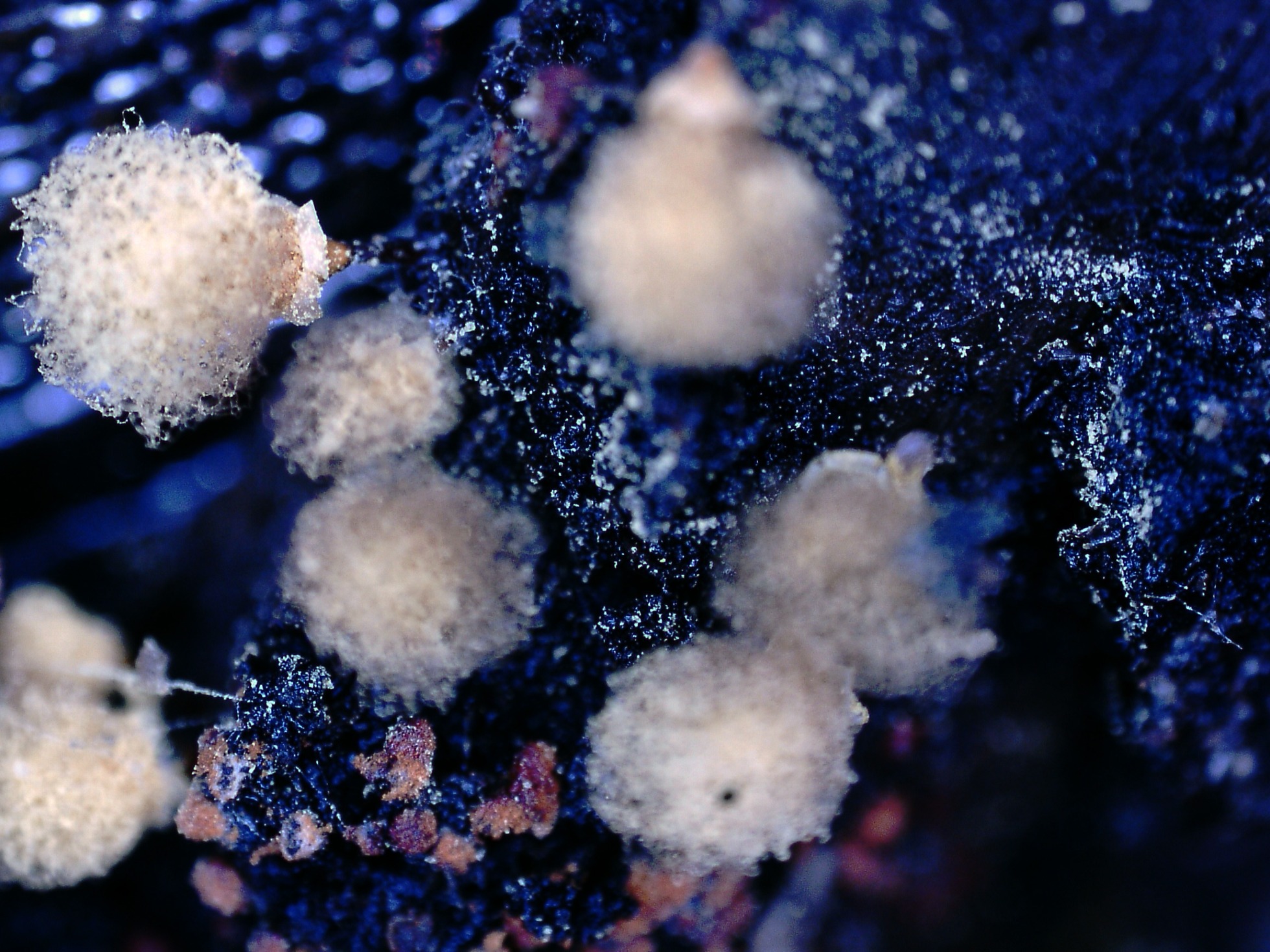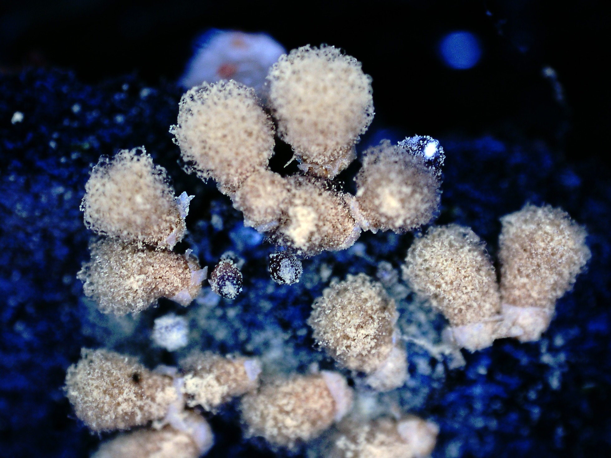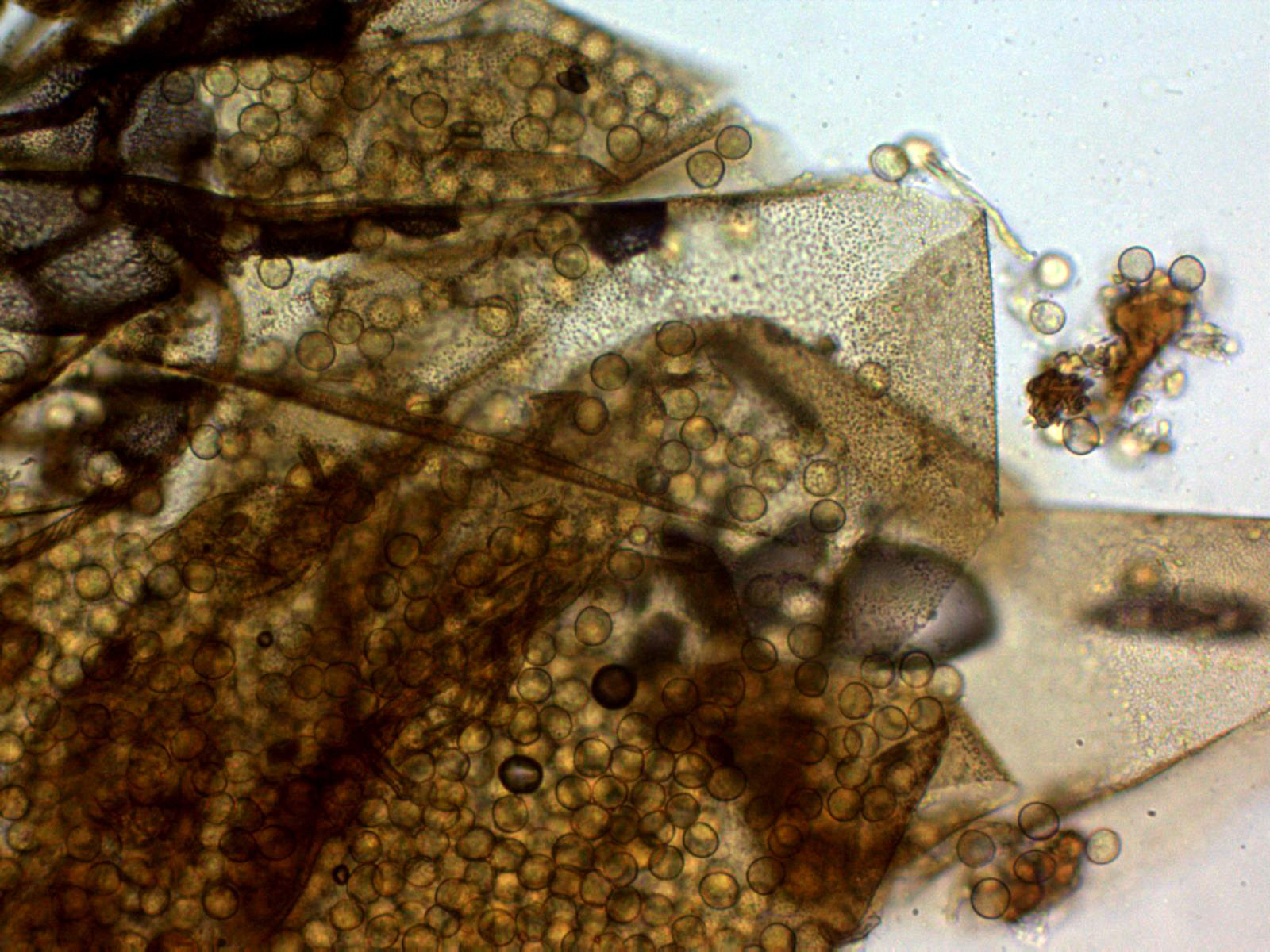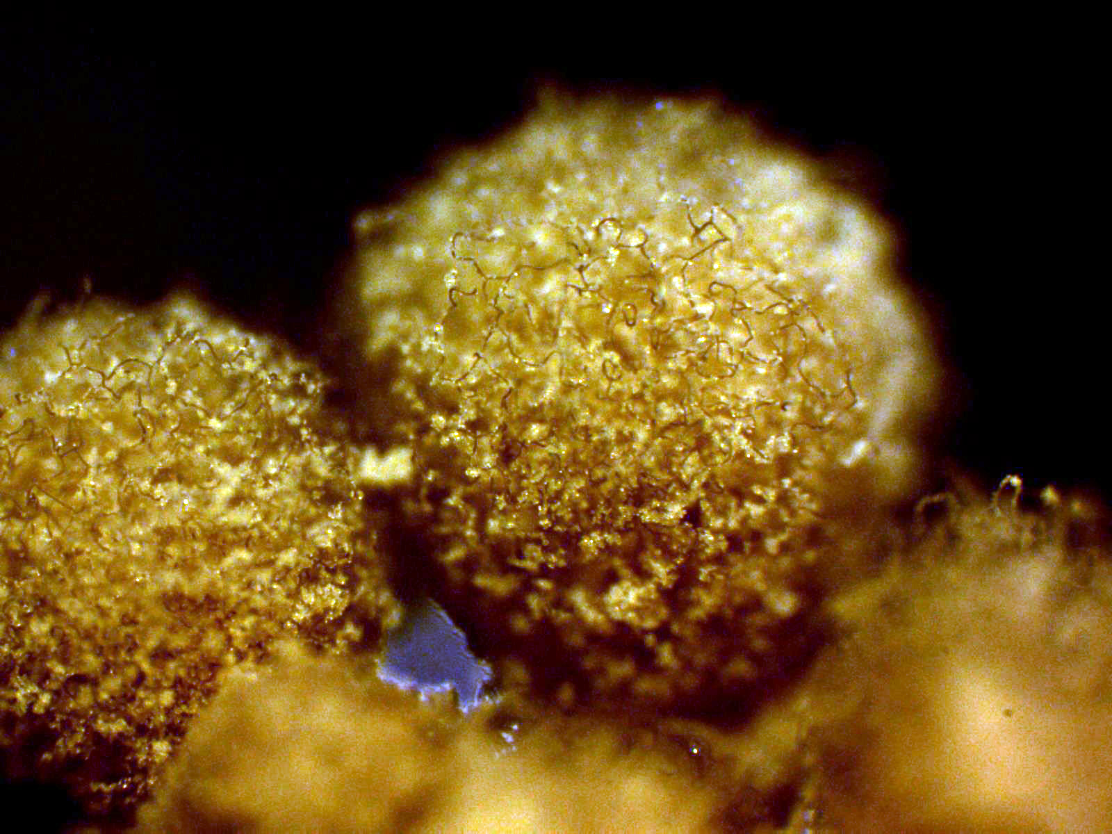 En la segunda de las imágenes por debajo de los esporocarpos aparecen unos granos de color rojo cinabrio, dejo una ampliación a 20 aumentos: