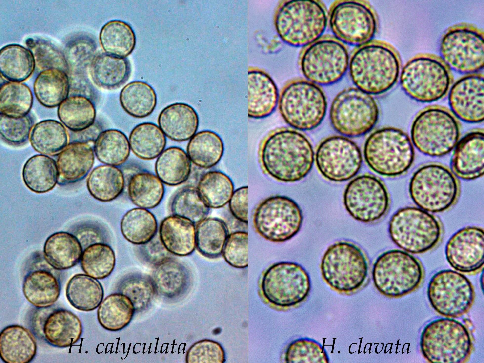 La más parecida sería su hermana la Hemitrichia clavata, esta ya con esporas de mayor tamaño y un halo característico alrededor de las esporas, este halo ausente en el caso de la Hemitrichia calyculata, añado una comparativa de estas esporas sacada de mis archivos: