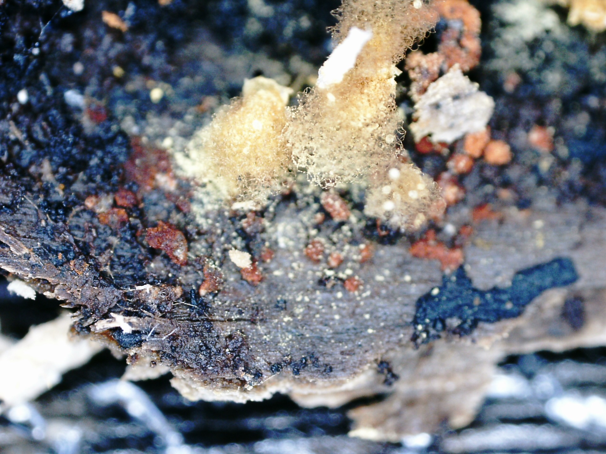 Sin ningun criterio científico ya que no dispongo de documentación al respecto, en mi opinión creo que se podría corresponder a la fase plasmodial del mismo Mixomiceto, ya que me he encontrado con Plasmodium de otros Mixomicetos con un aspecto parecido.