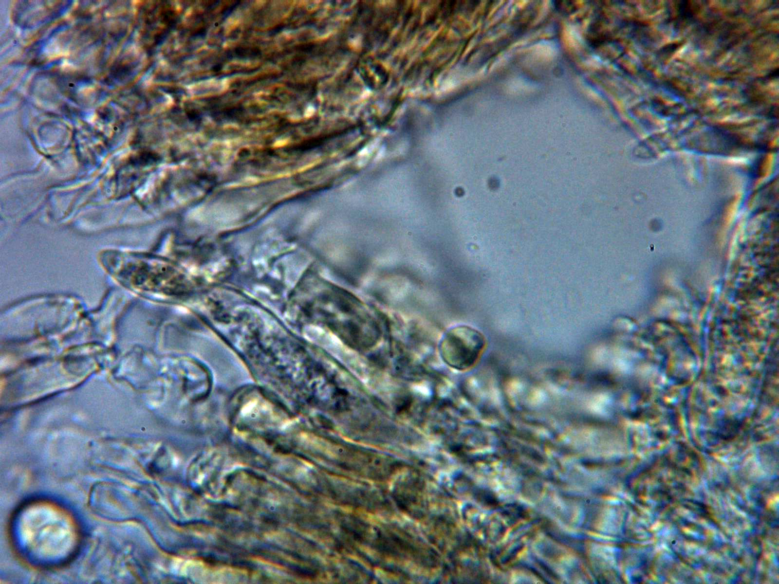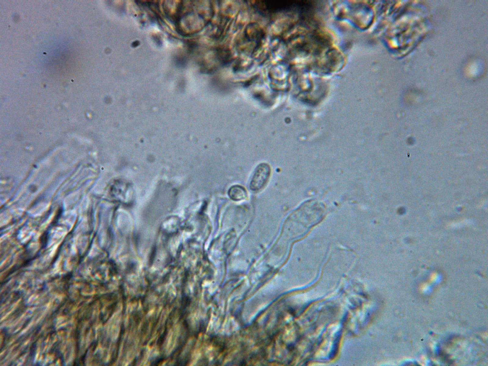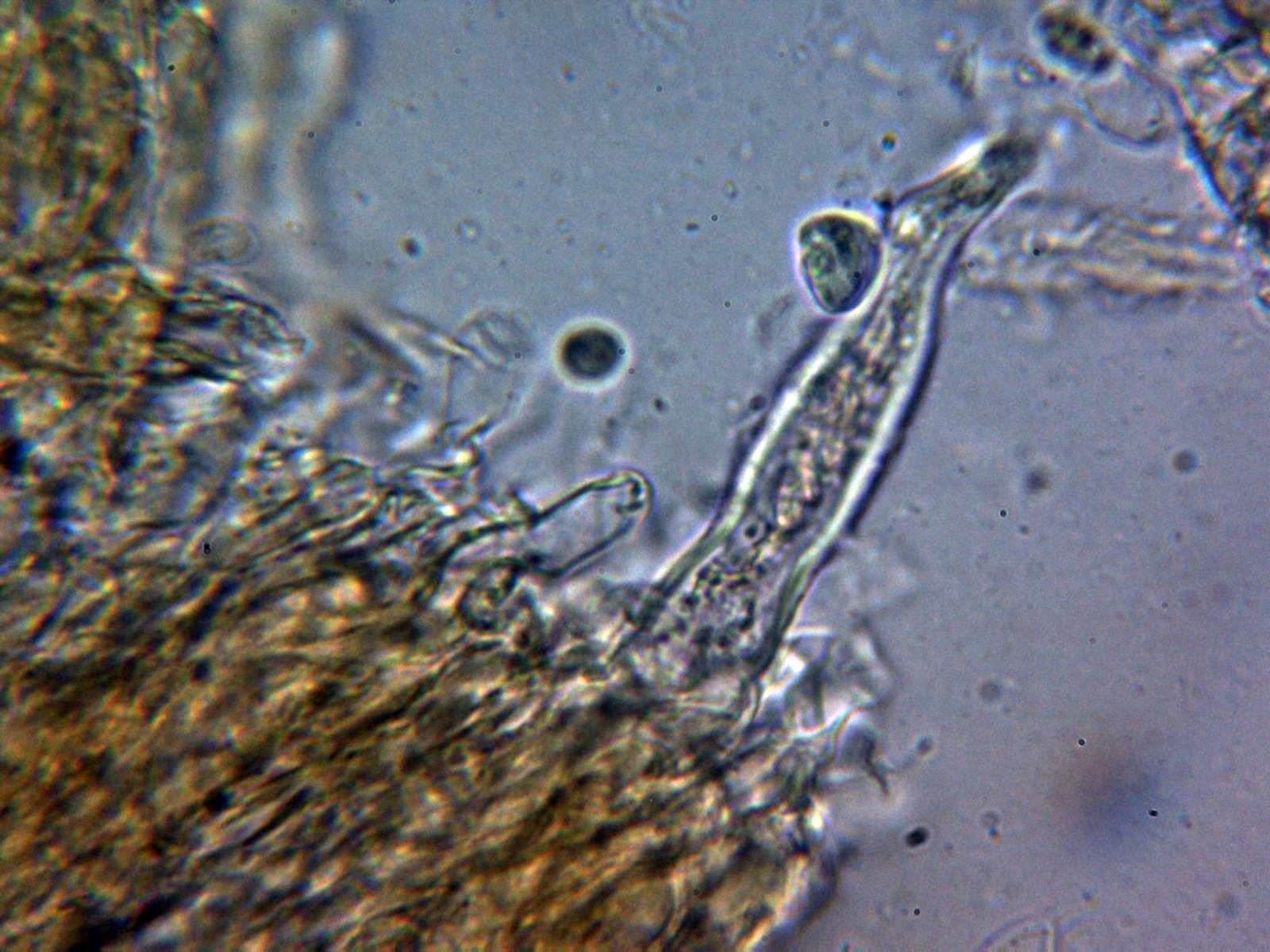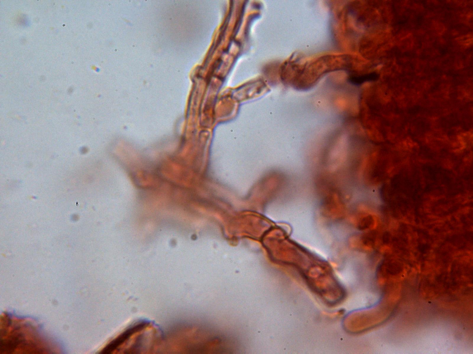 Cistidios tipo lamprocistidio escasos, aunque se observaban en las muestras unas cristalizaciones gruesas que podrían corresponderse a trozos de los mismos:
