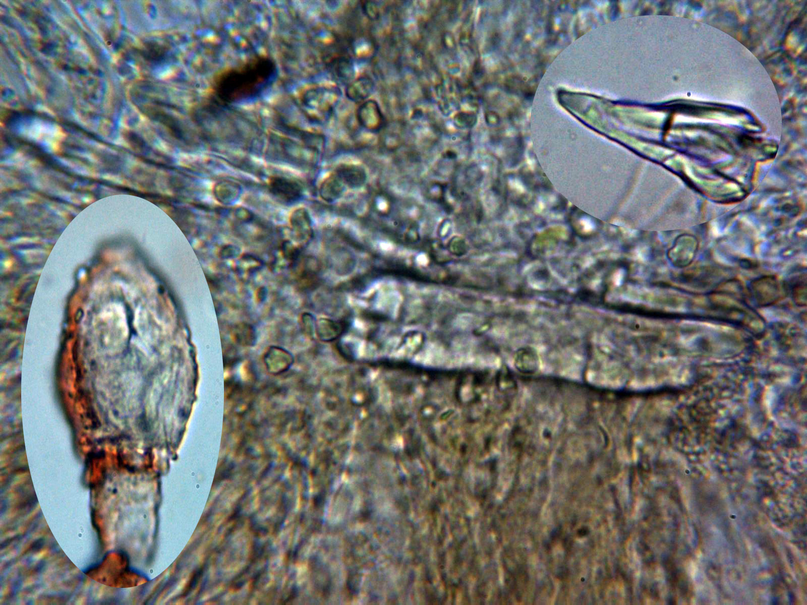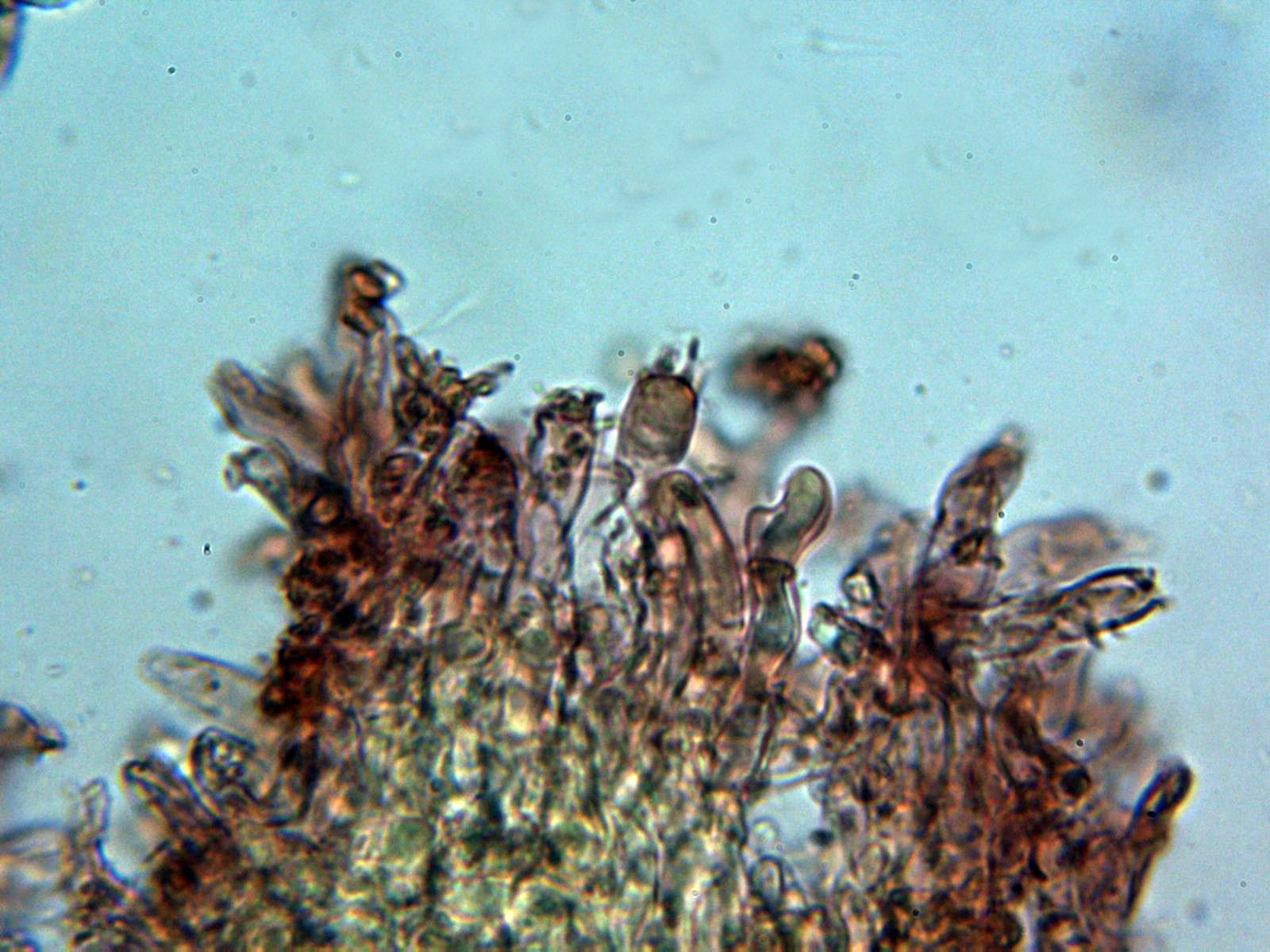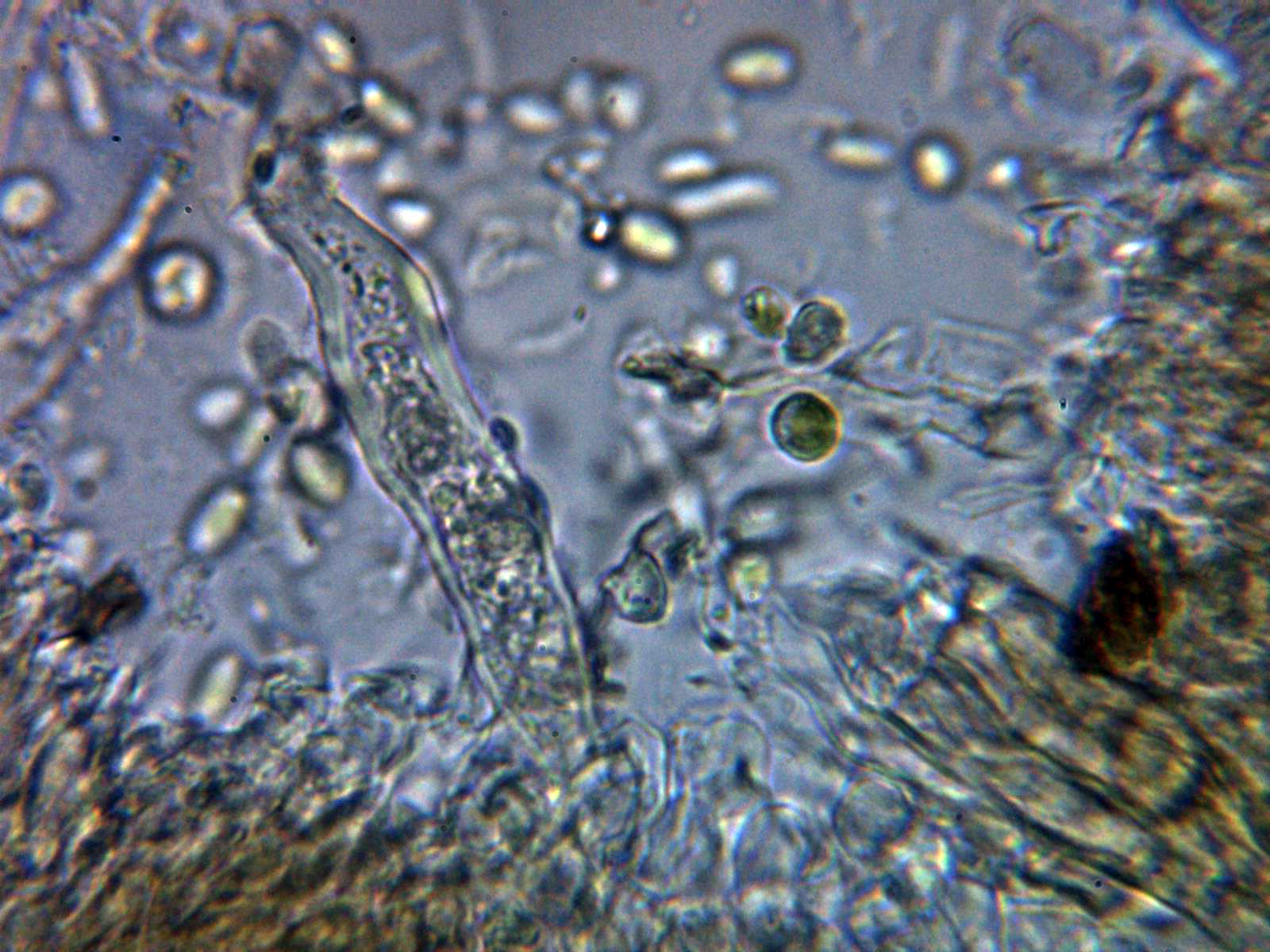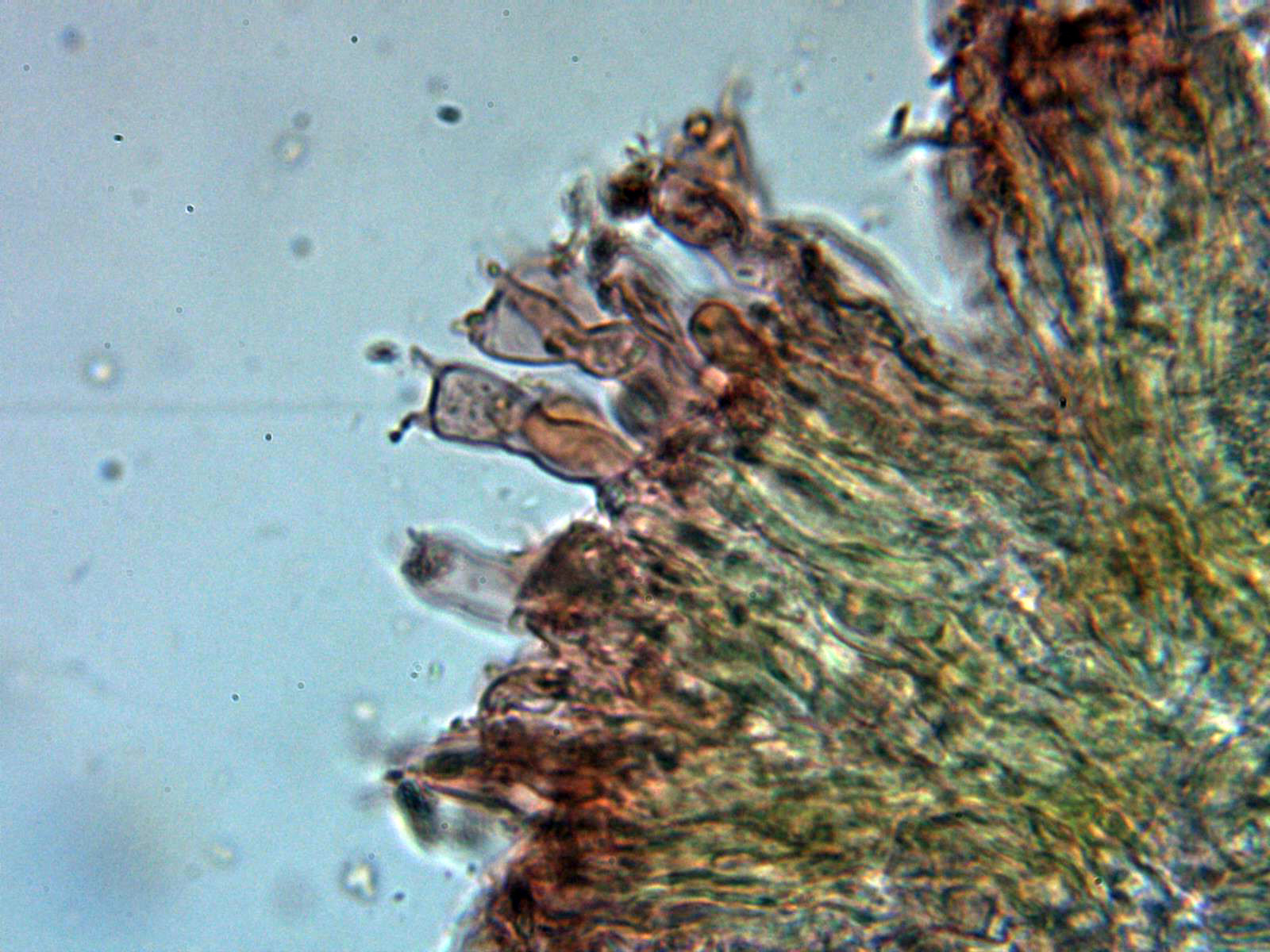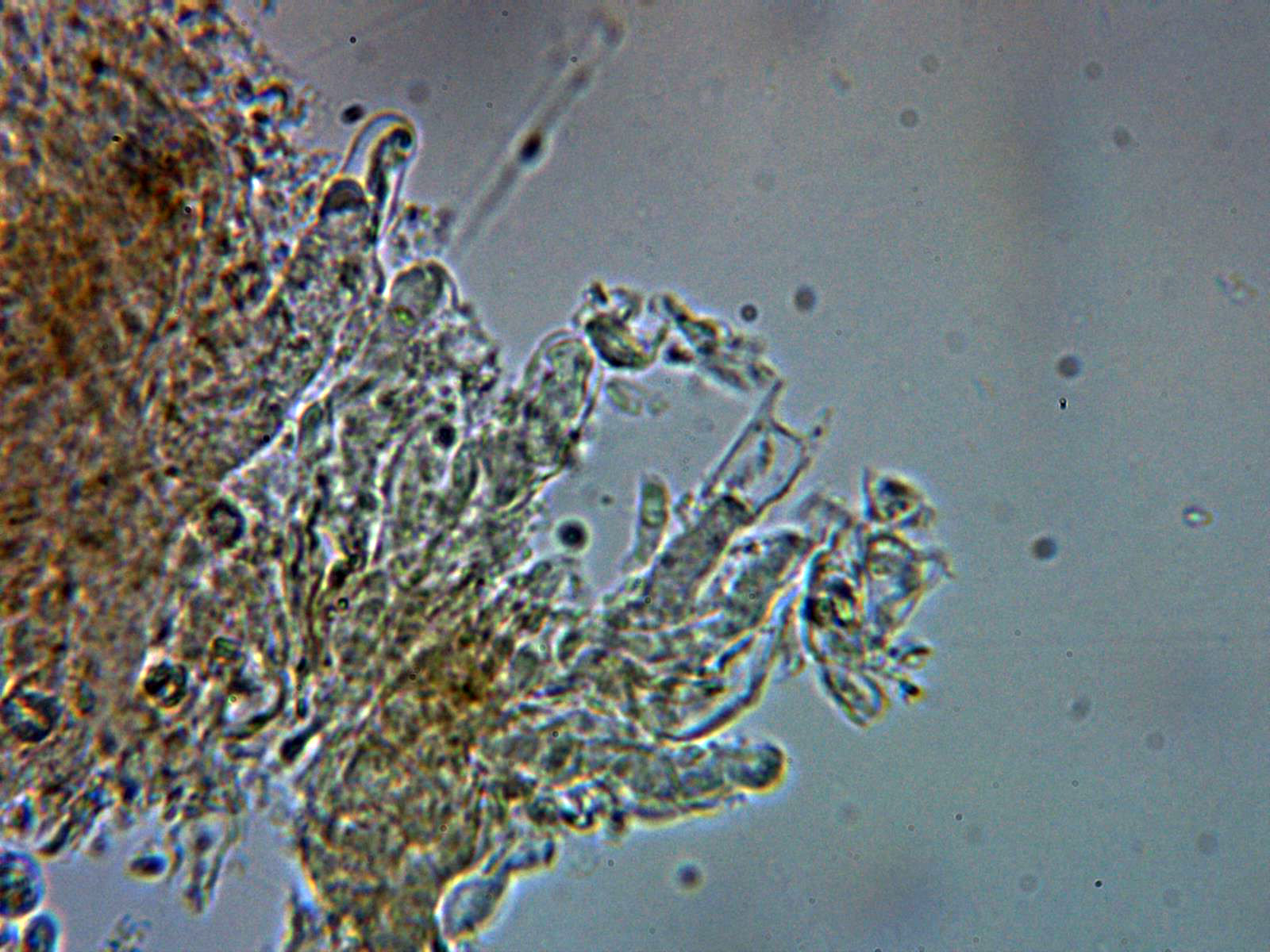 Cistidios tipo lamprocistidio escasos, aunque se observaban en las muestras unas cristalizaciones gruesas que podrían corresponderse a trozos de los mismos: