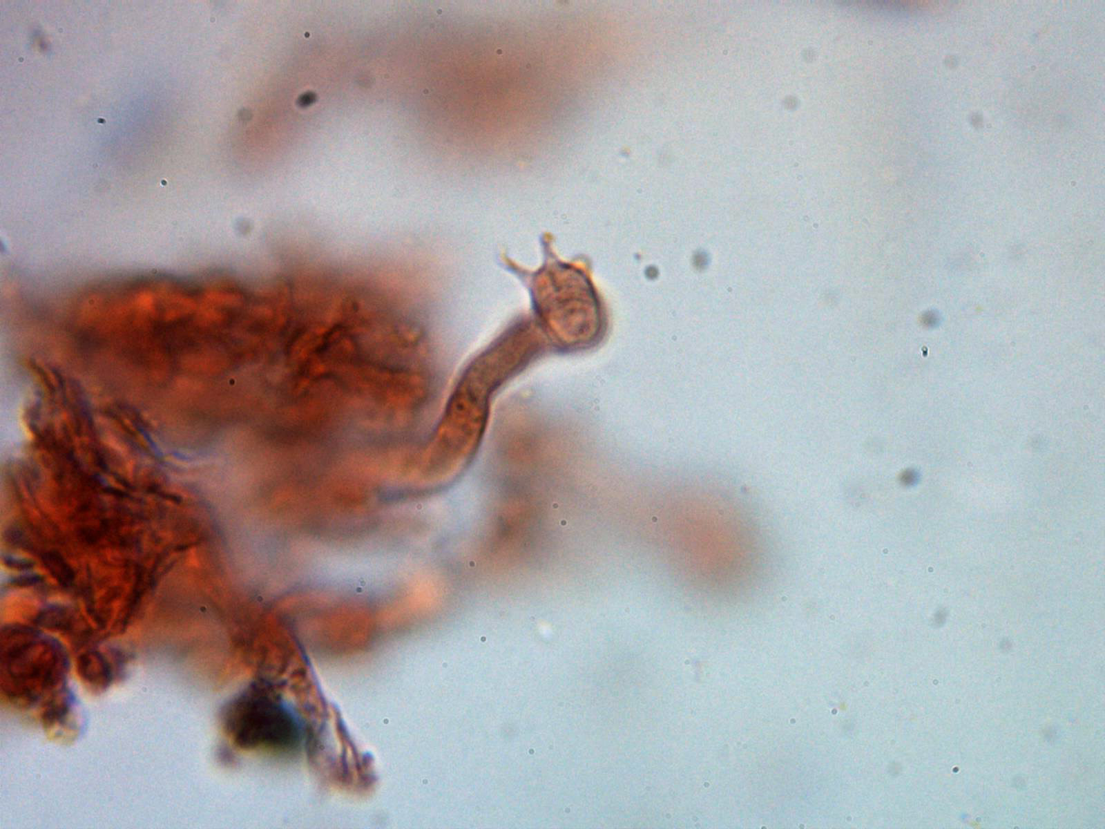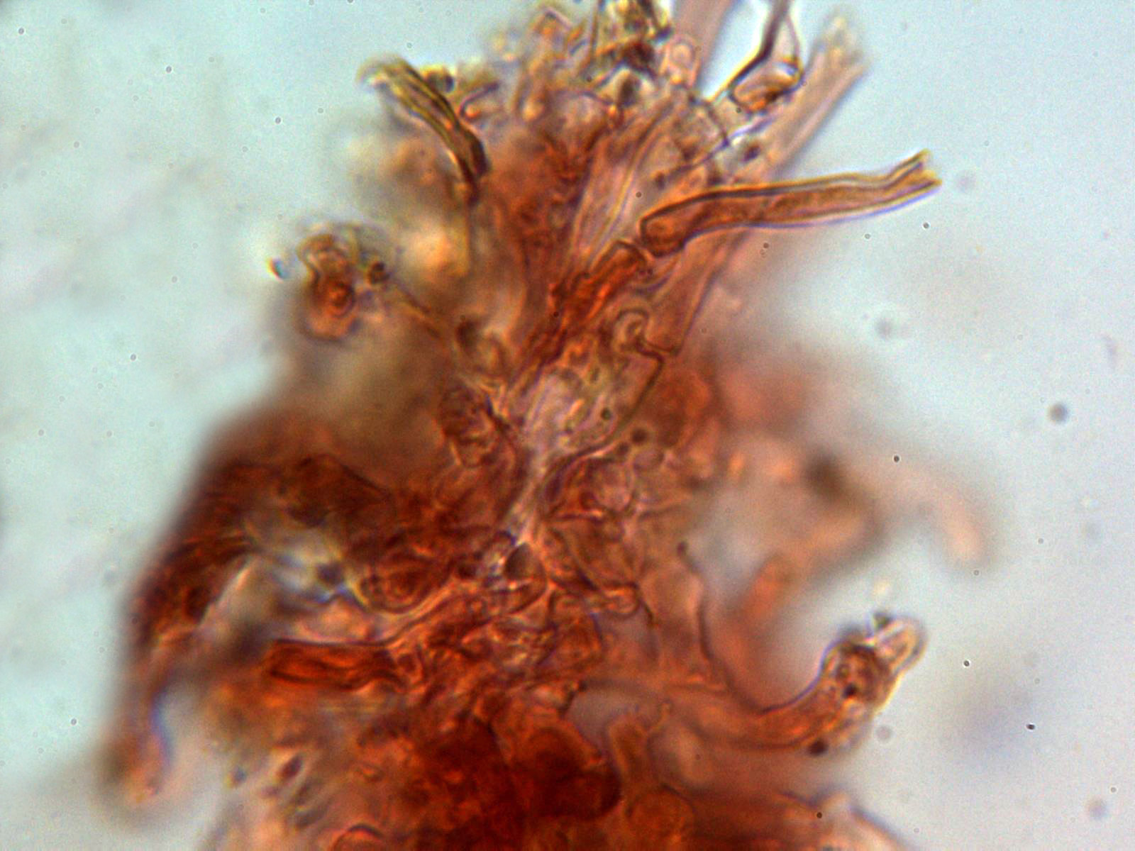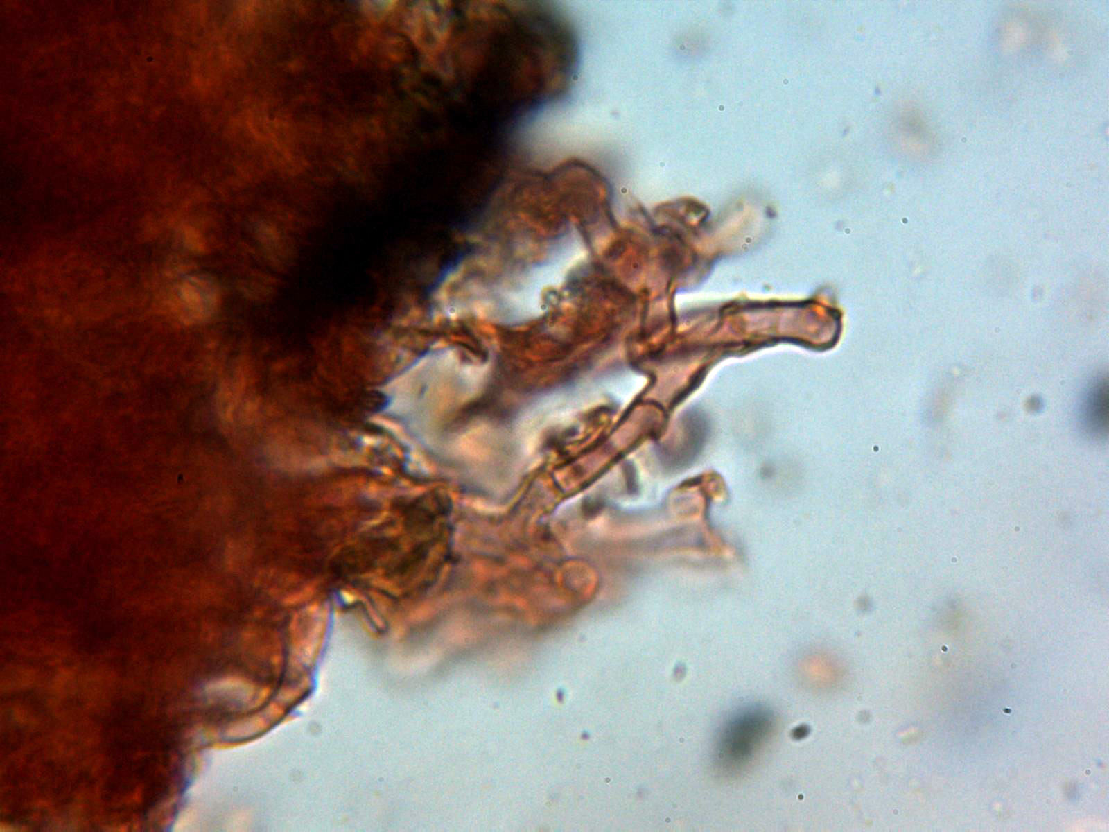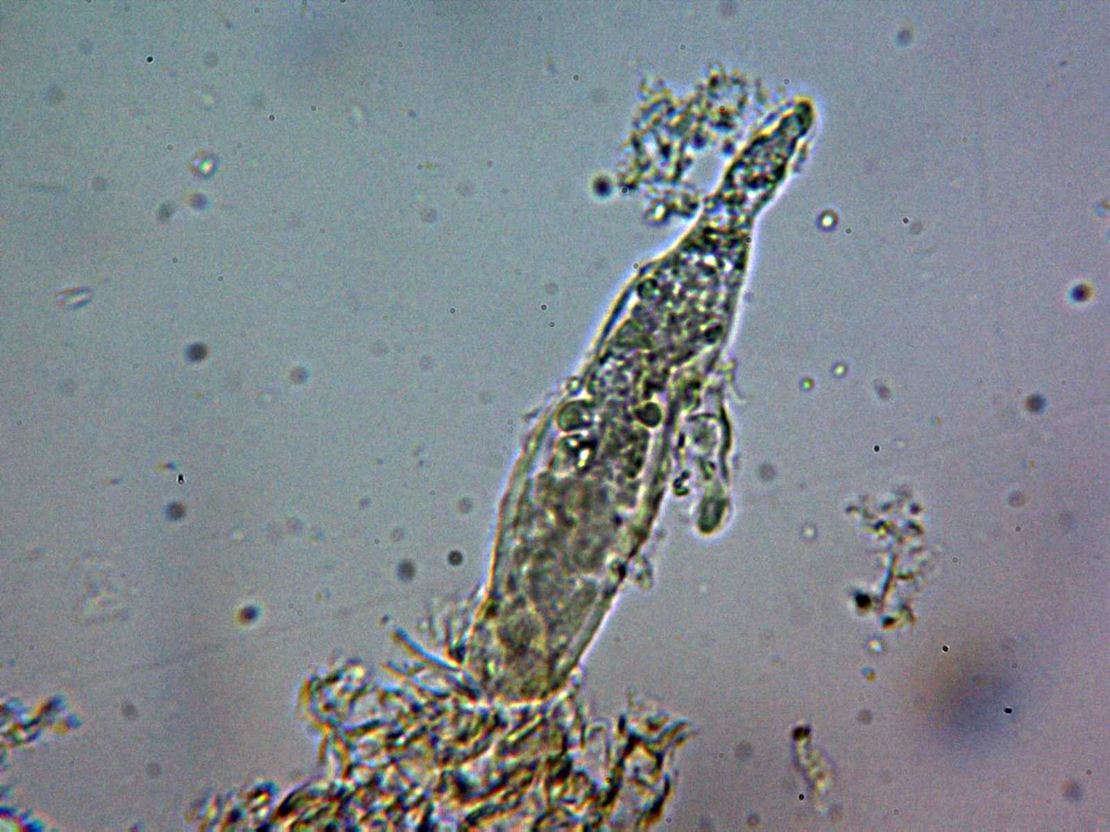 Cistidios tipo lamprocistidio escasos, aunque se observaban en las muestras unas cristalizaciones gruesas que podrían corresponderse a trozos de los mismos: