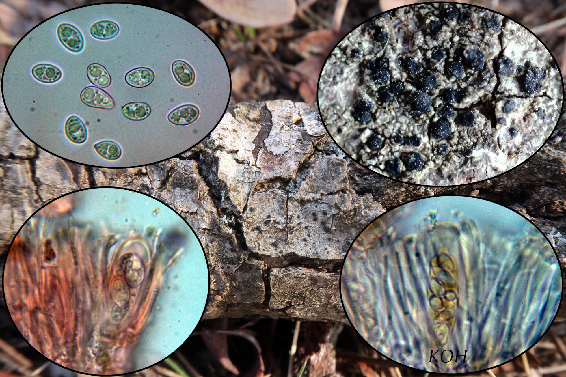Y por otro lado uno de muy parecido a la Amandinea punctata y a la Buelia disciformis, aunque mucho más abundante que las dos anteriores y fácilmente separables con la microscopía, la Lecidella elaeochroma