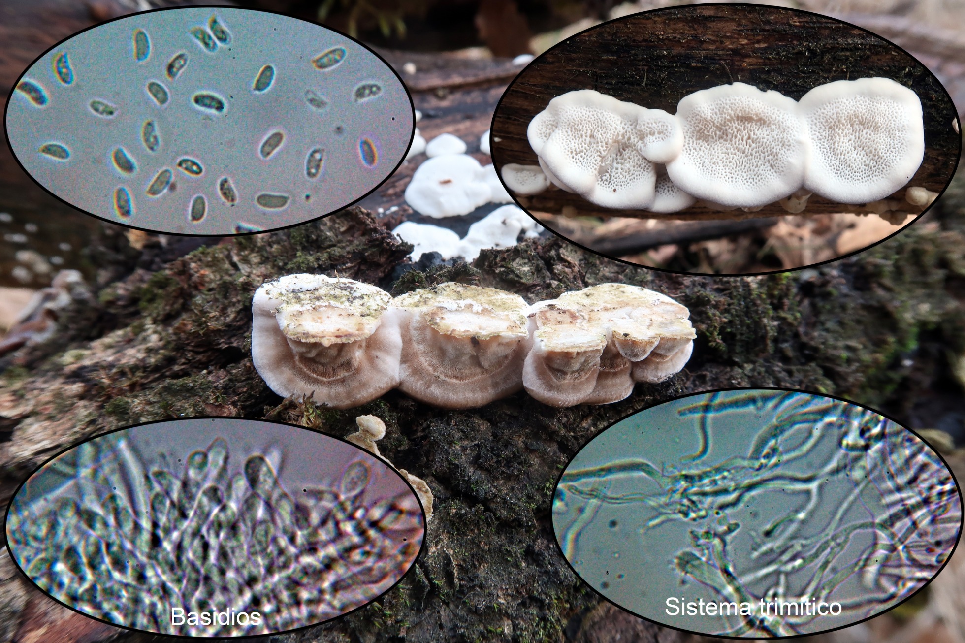 Por su sistema hifal trimítico, la no reacción frente al KOH y su morfología y medidas esporales, me conducen a considerar la Trametes versicolor, esta sería ya la segunda vez que me la encuentro sobre madera de coníferas, en mi primera ocasión precisé de dos análisis moleculares para convencerme: