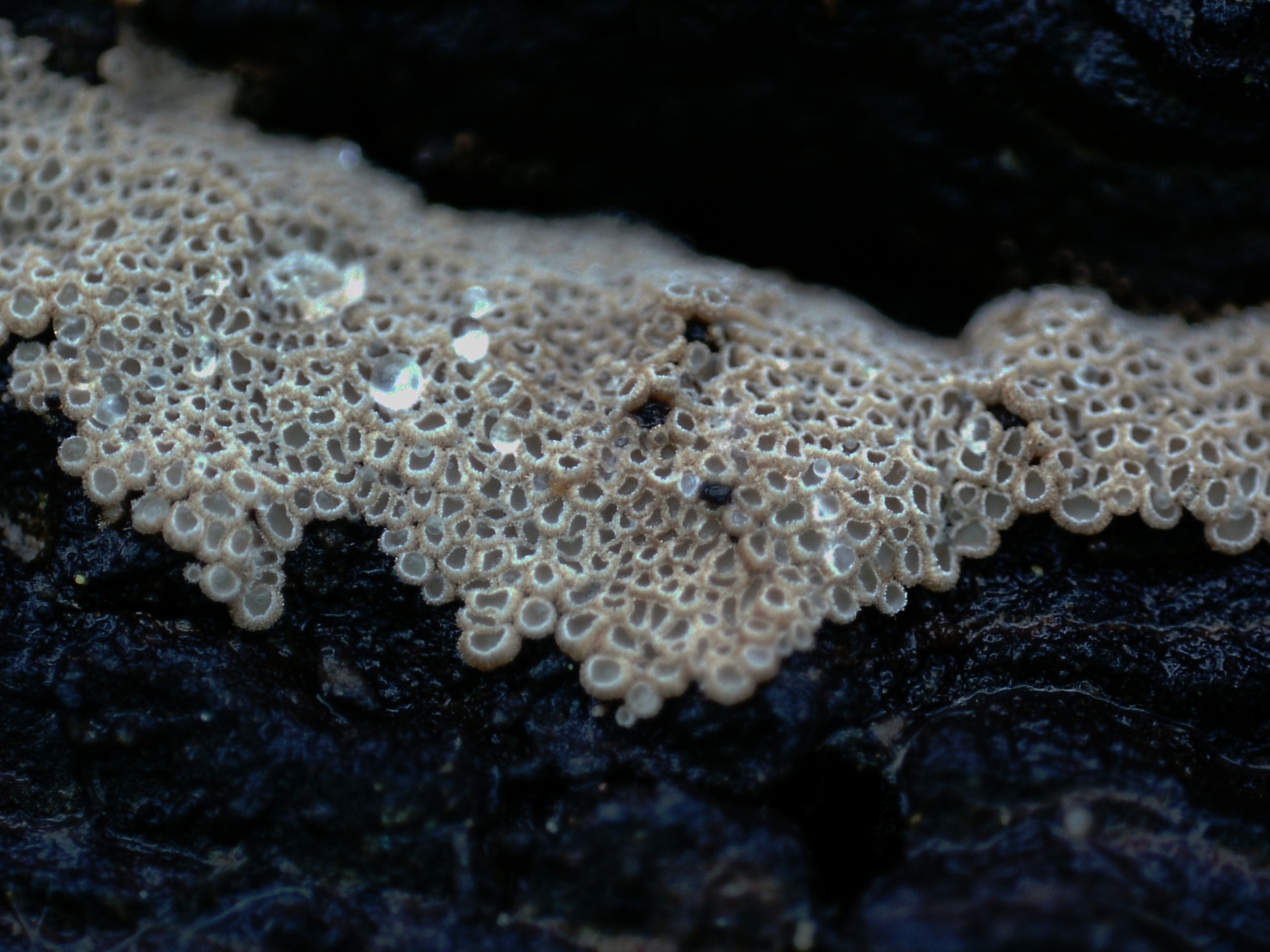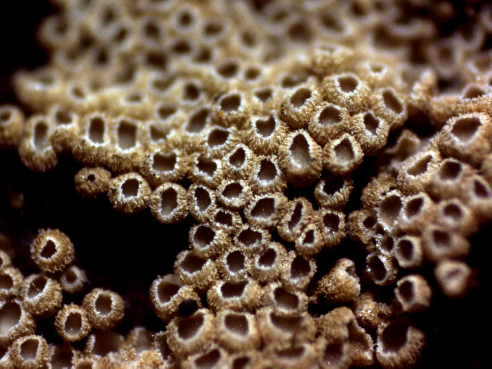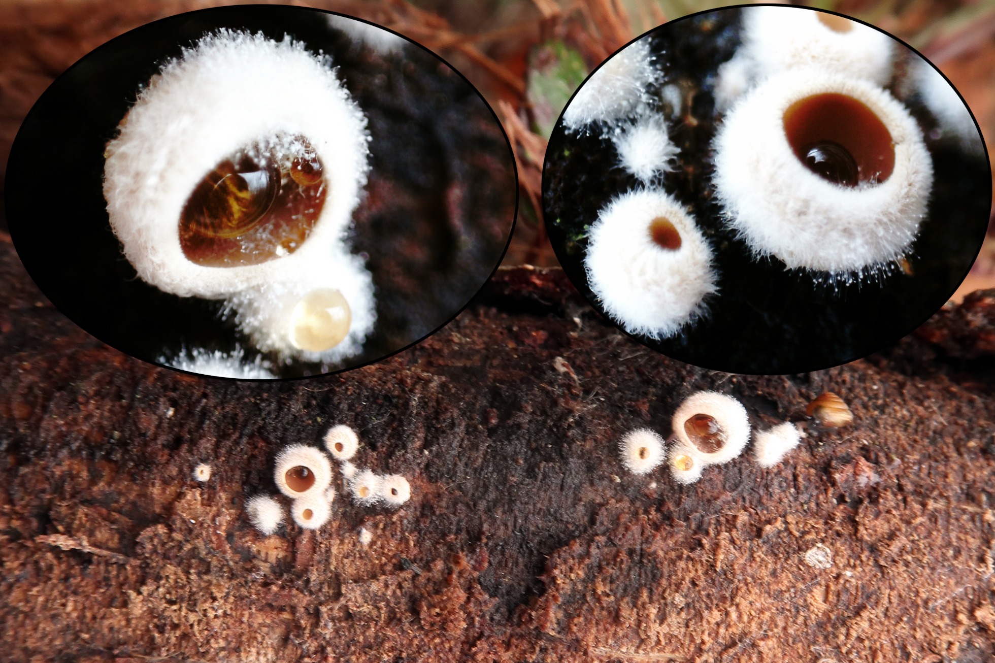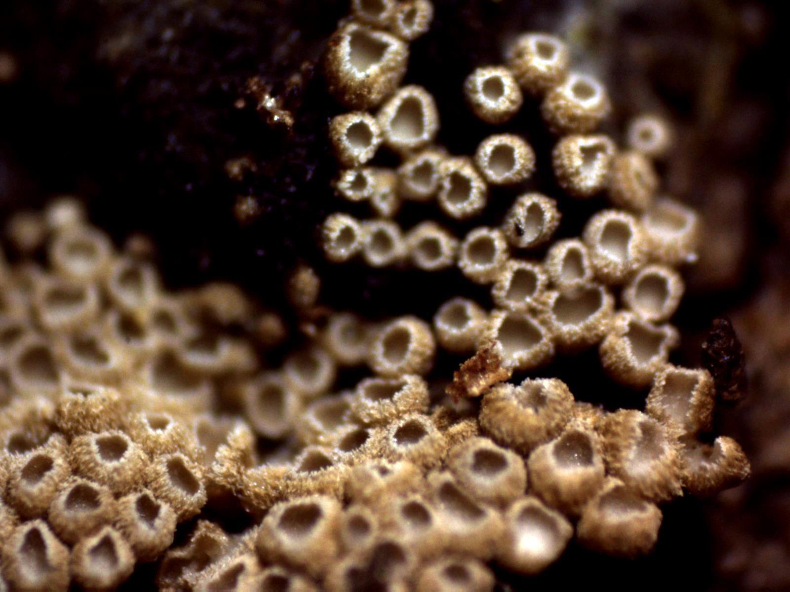 Un pequeño basidiomiceto con forma de olla con el interior de color crema grisáceo y la parte exterior cubierta de pelos de color marrón pardo, brotando de manera masiva a modo de pequeños parches sobre la superficie de un tronco tumbado de planifolio en cauce fluvial: