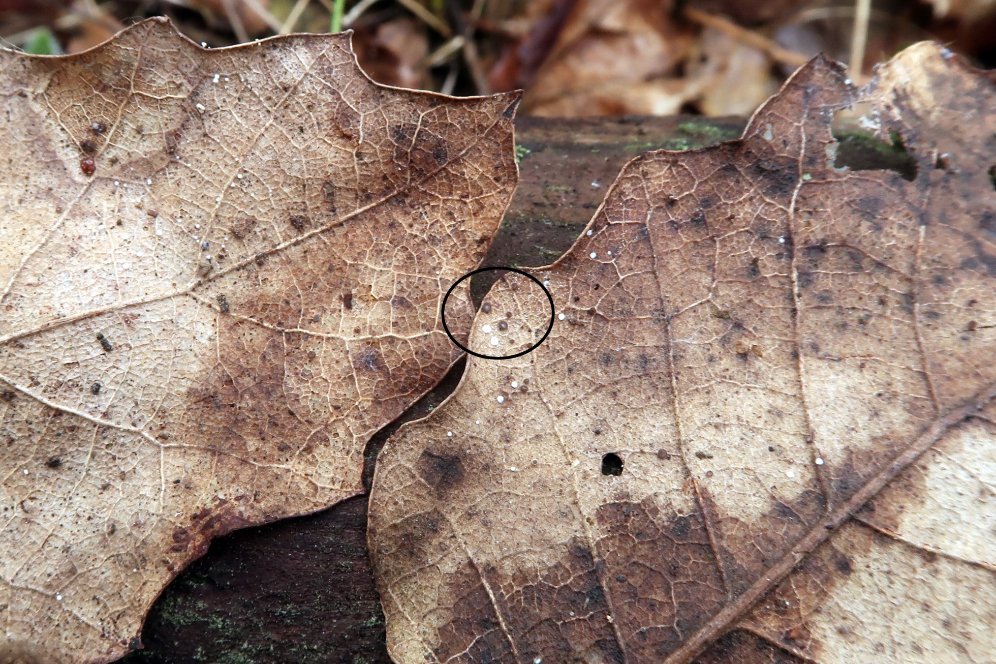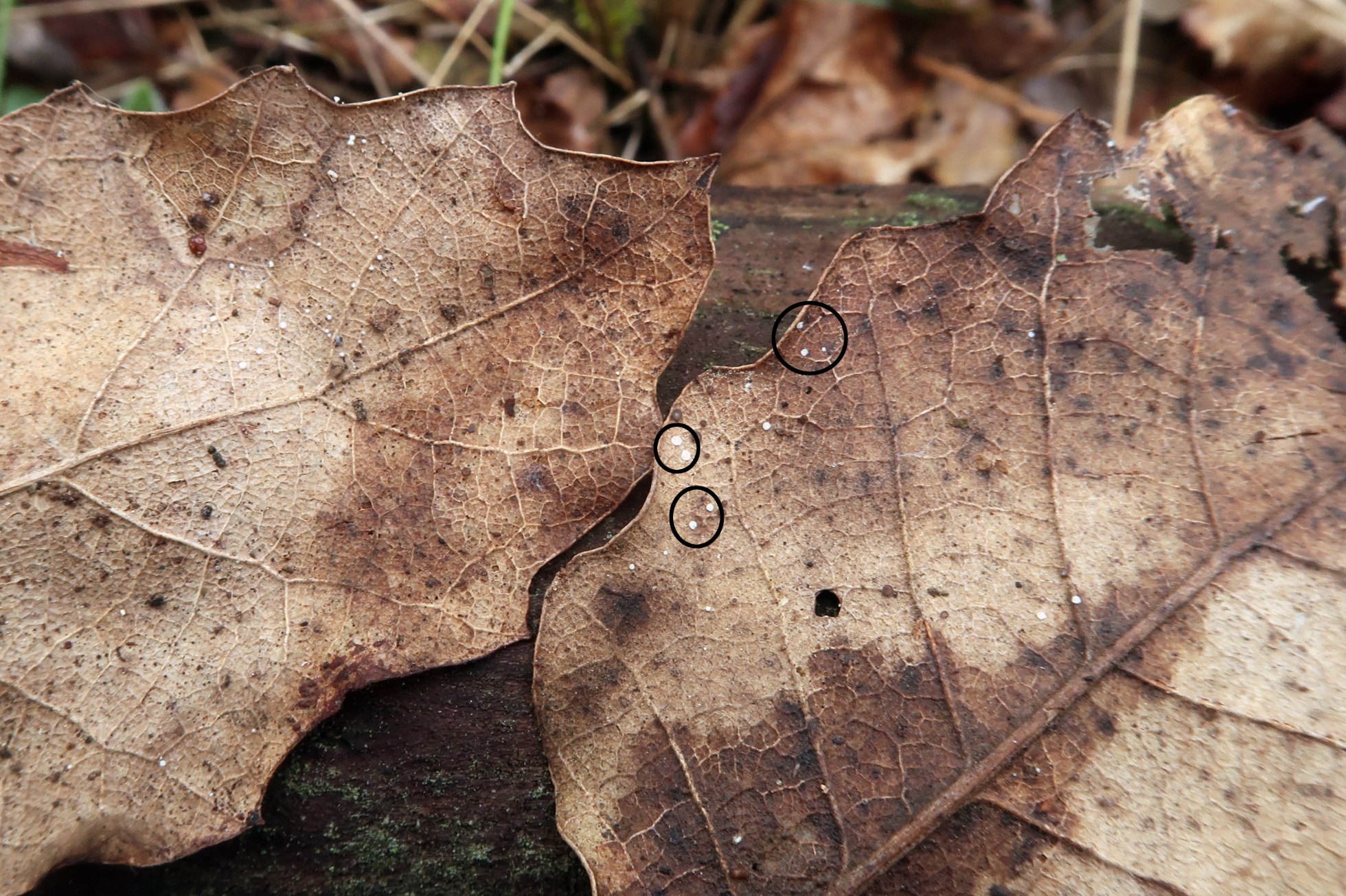 La hoja de roble objeto del estudio y los apotecios dentro de los círculos marcados: