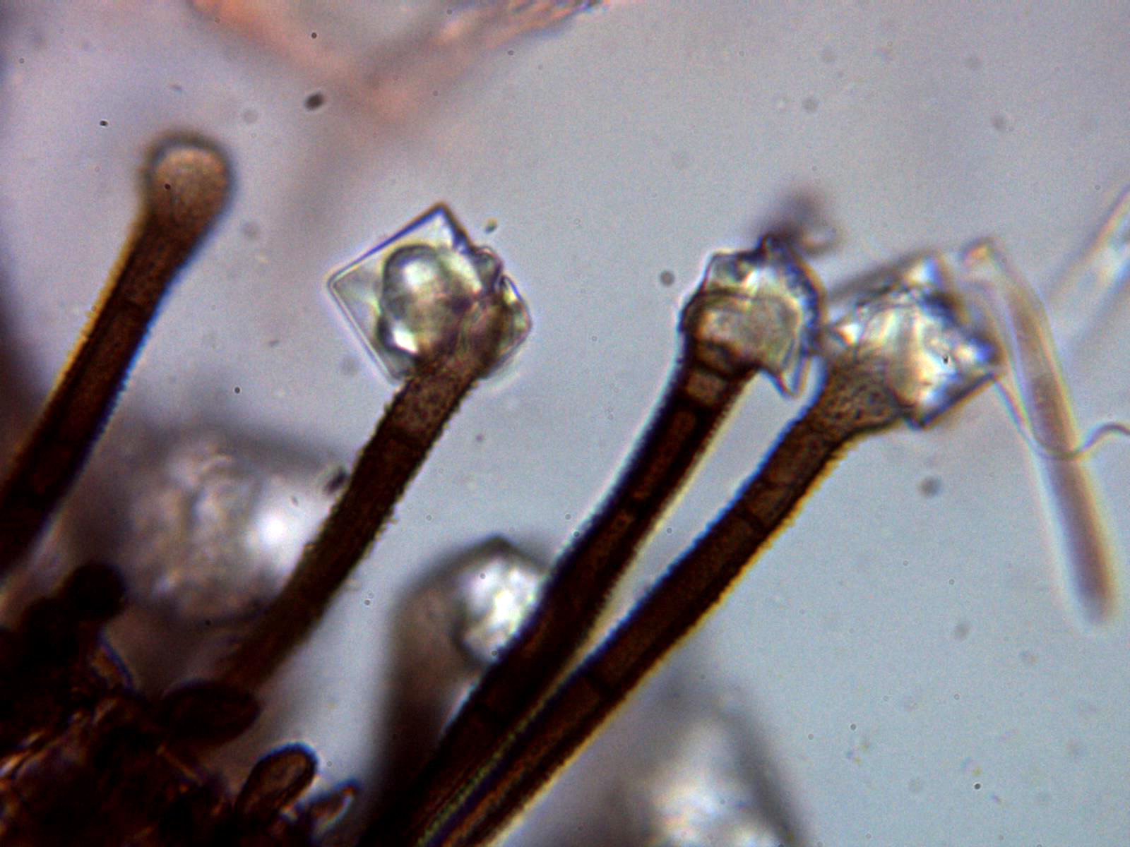 Pelos externos con cristalizaciones en el ápice a 400 aumentos: