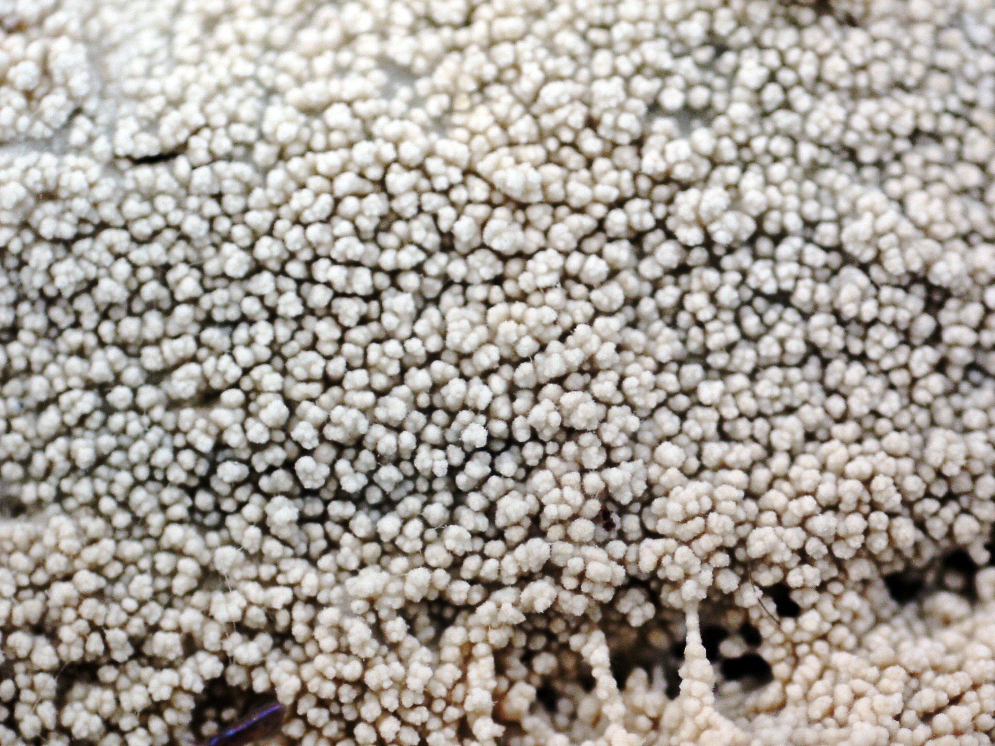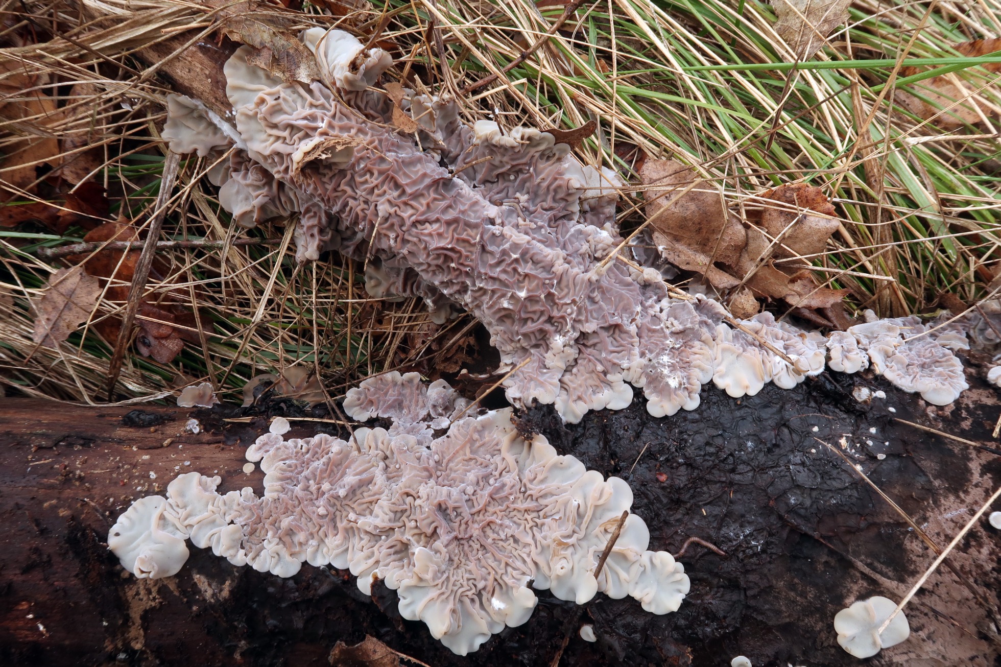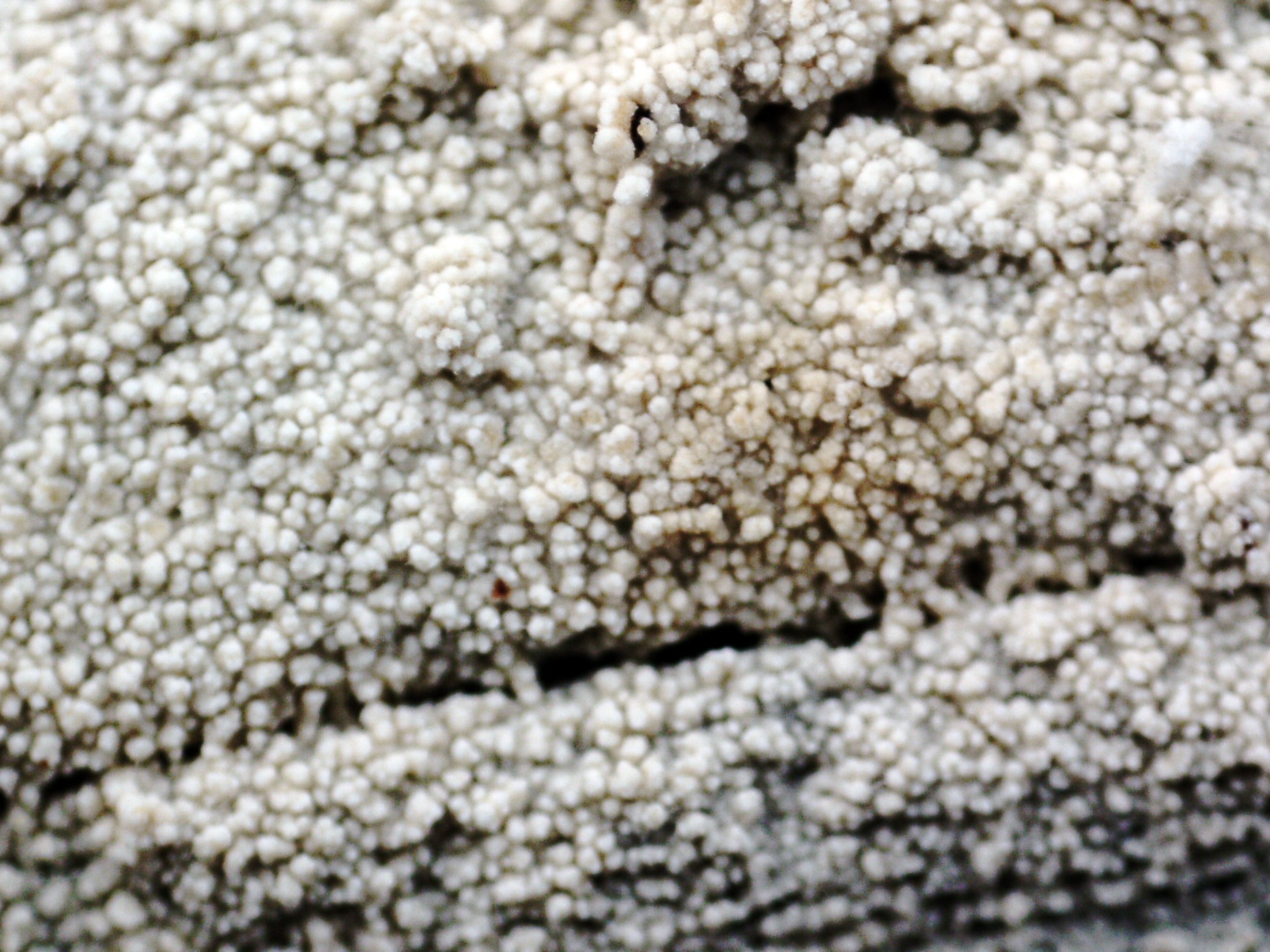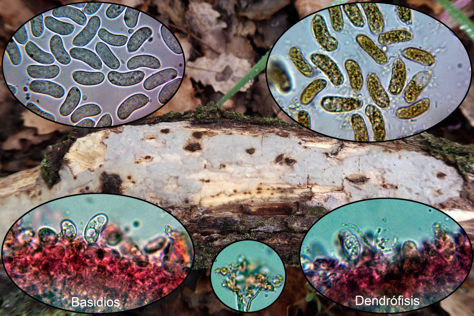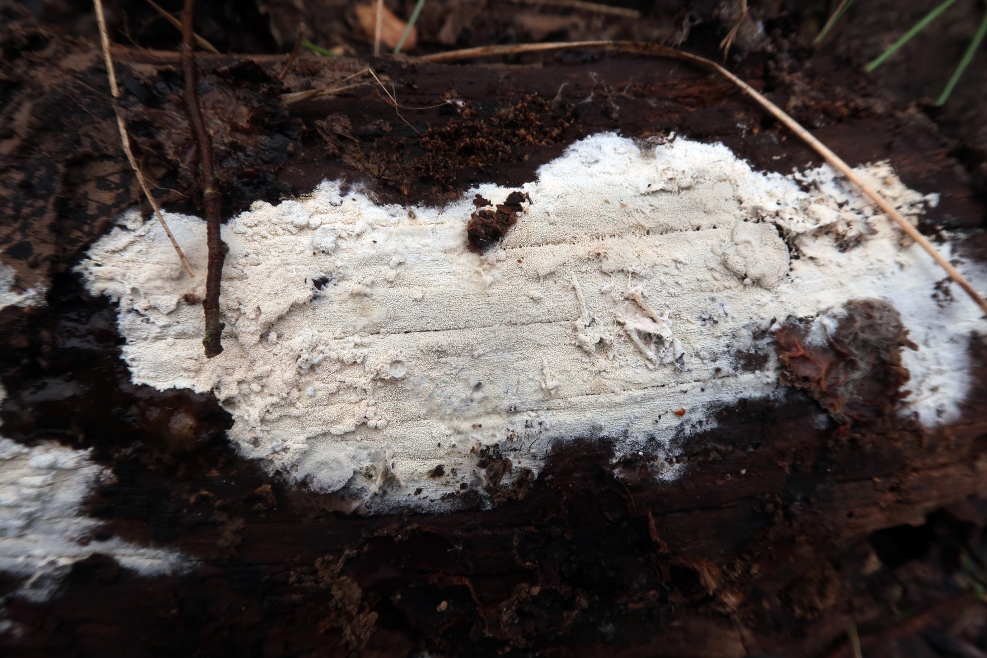 Un Corticial localizado sobre la superficie de un tronco bastante degradado de árbol de ribera, el Sistotrema brinkmannii