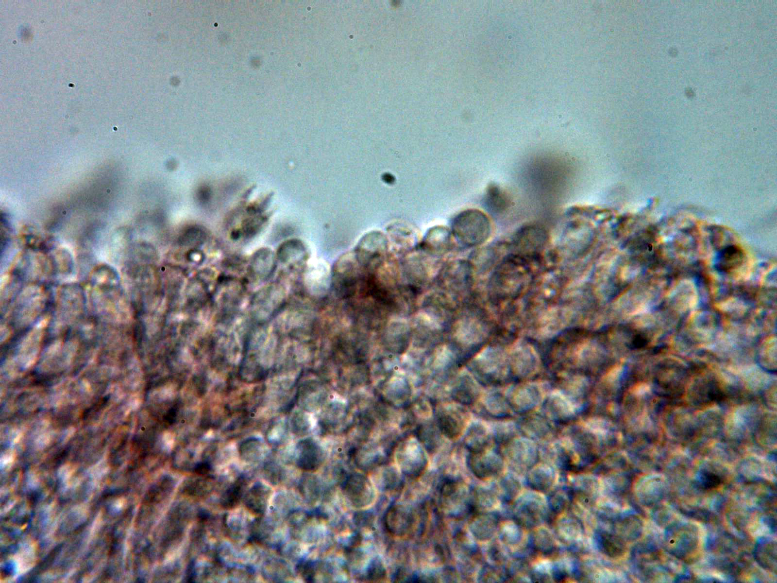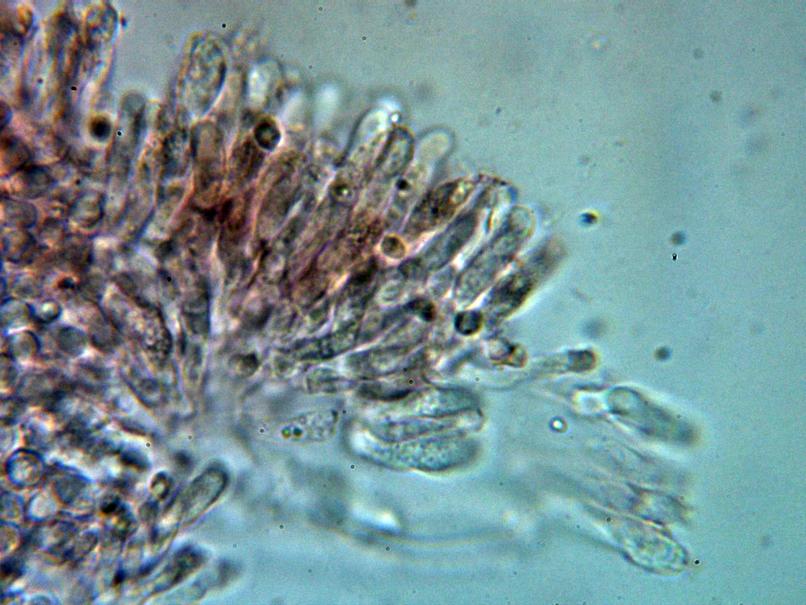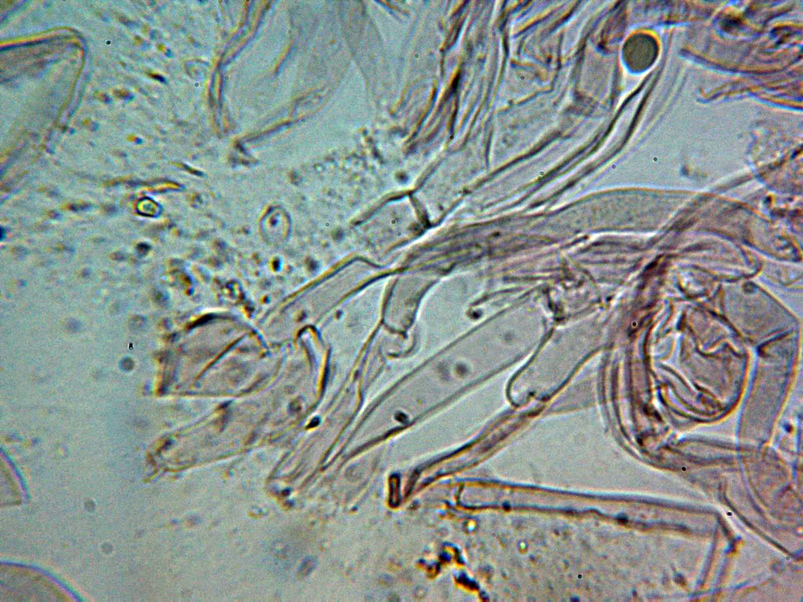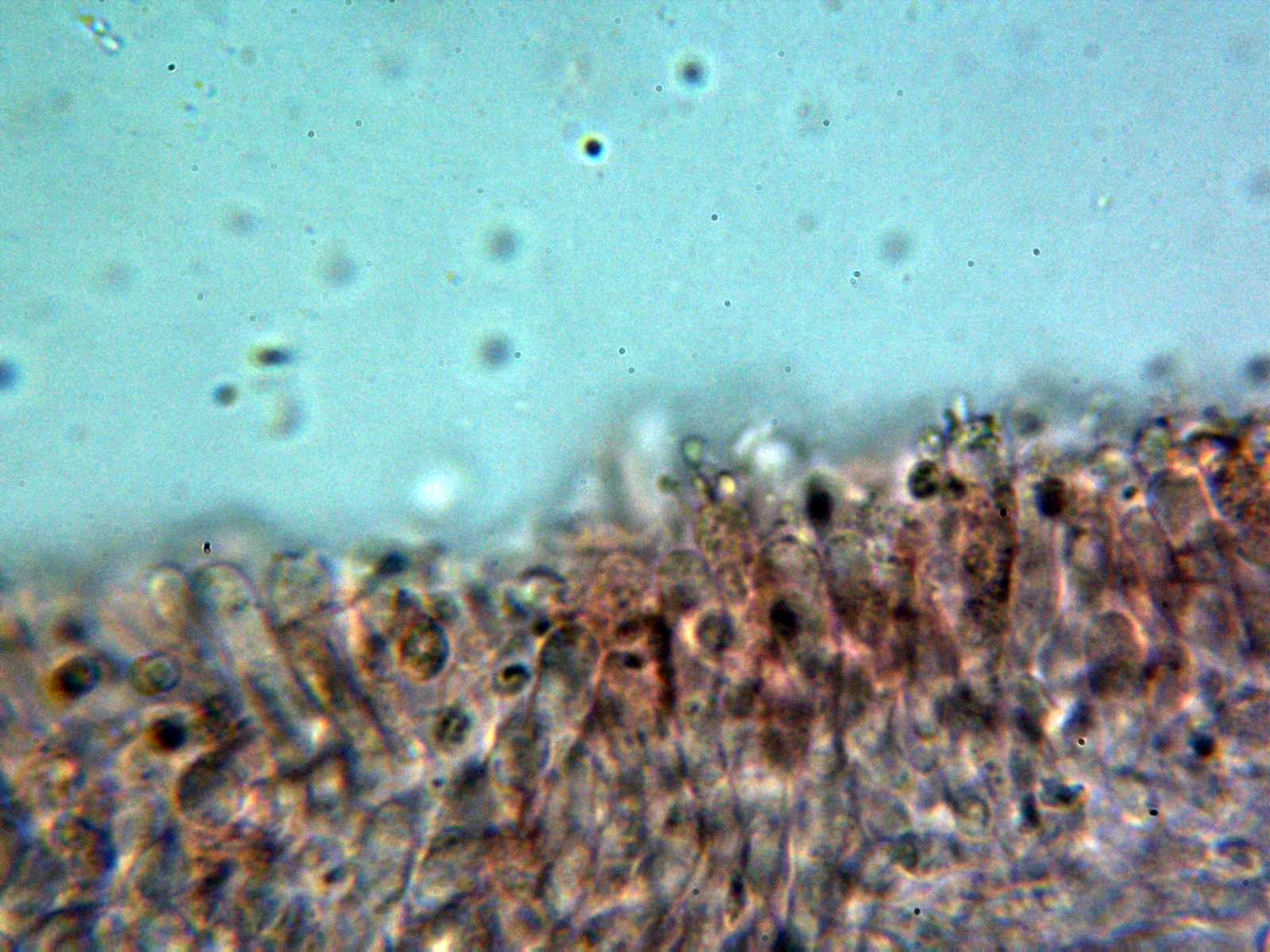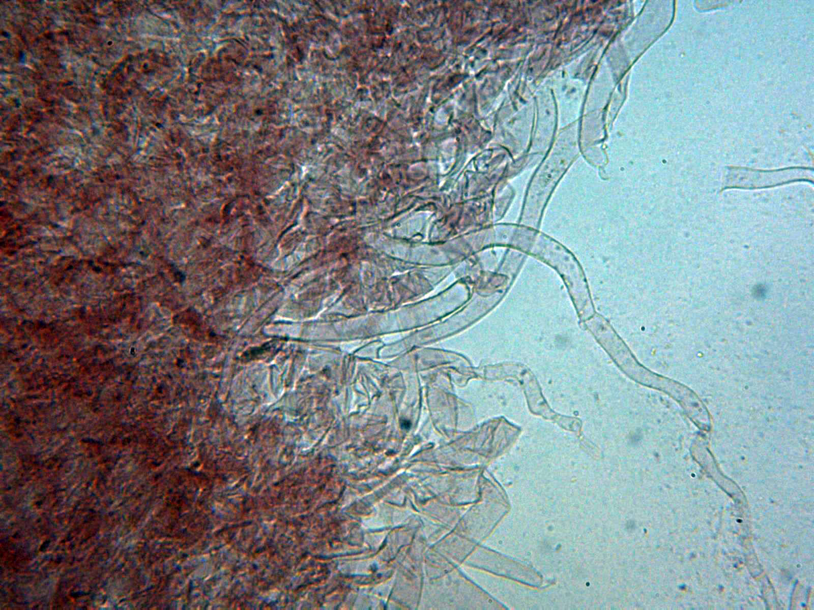 Pileipellis con hifas anchas y tabiques provistos de gruesas fíbulas, la pileipellis a 400 aumentos: