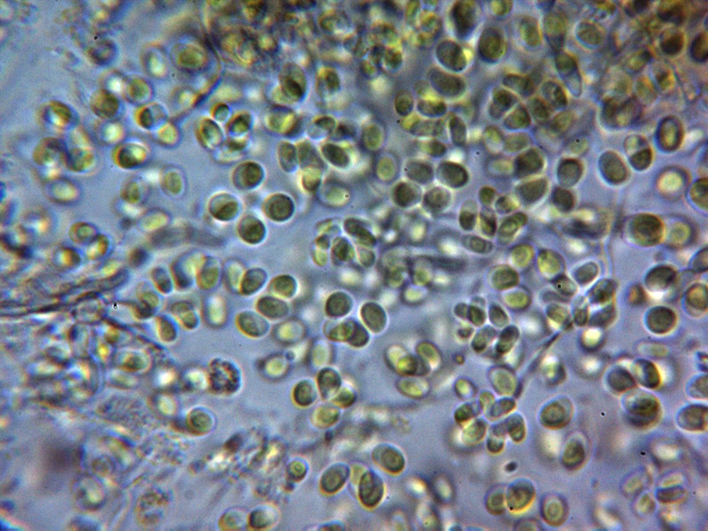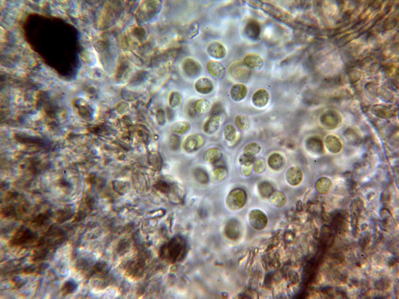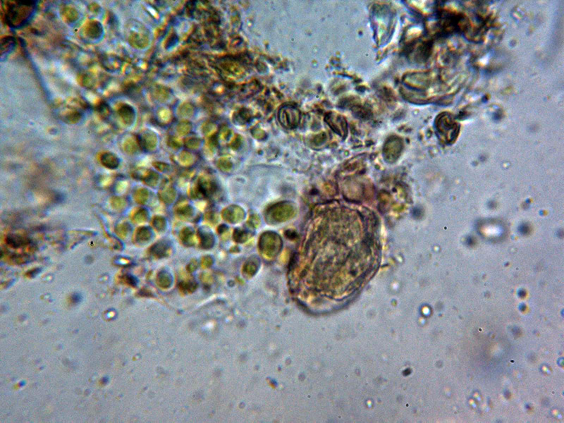 Lo que si había en las muestras estudiadas era una gran cantidad de lo que creía presumiblemente esporas, estas estarían dispuestas en grupos de mayoritariamente 4, que en una vista preliminar (y no solo yo) confundí con ascos, en opinión de Hans Otto-Baral, se trataría de cianobacterias incrustadas en mucilago, dejo unas imágenes: