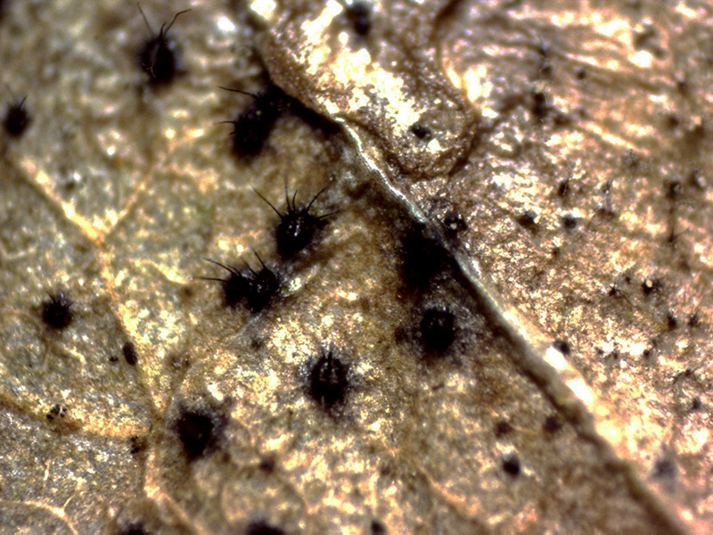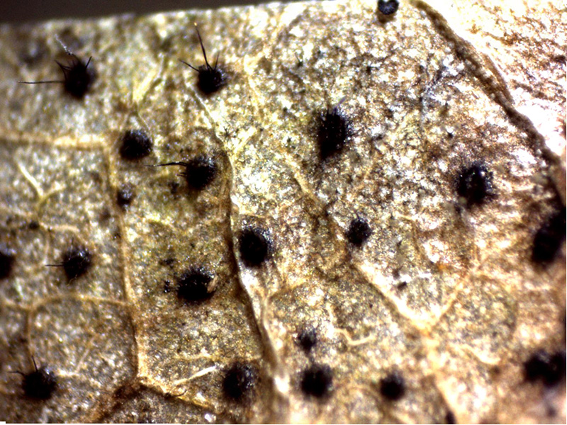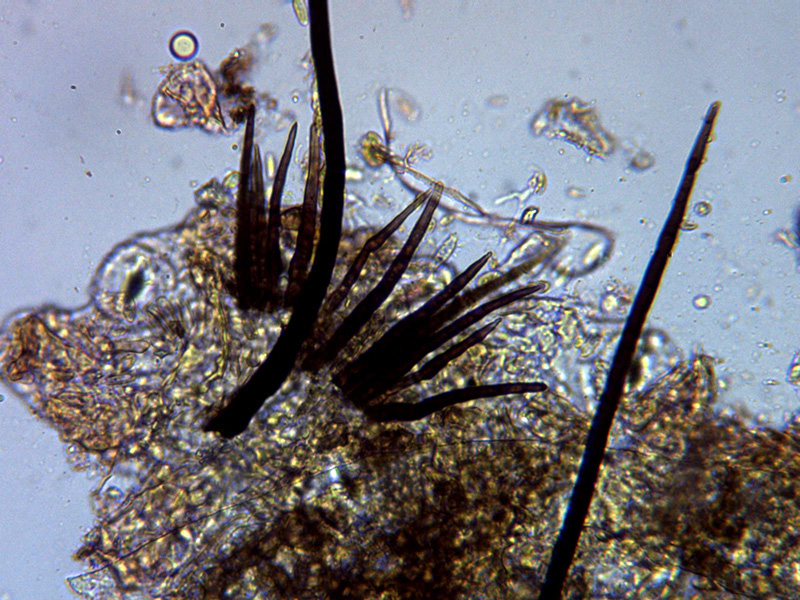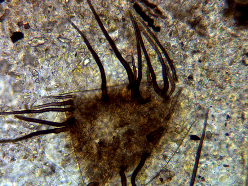 Unos muy diminutos apotecios peludos sobre una hoja ya seca de Hedera helix. Agradecer a Luc Bailli su ayuda en la identificación de la especie.