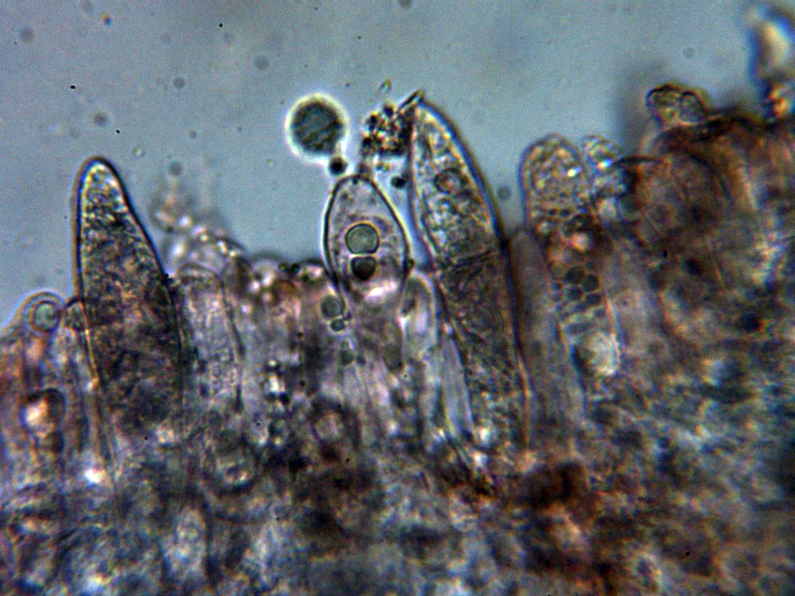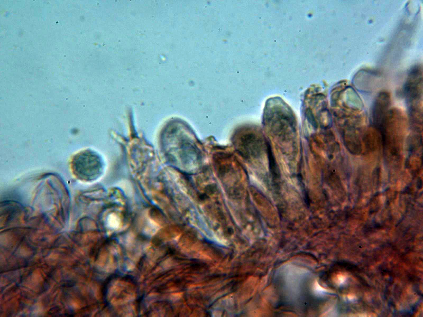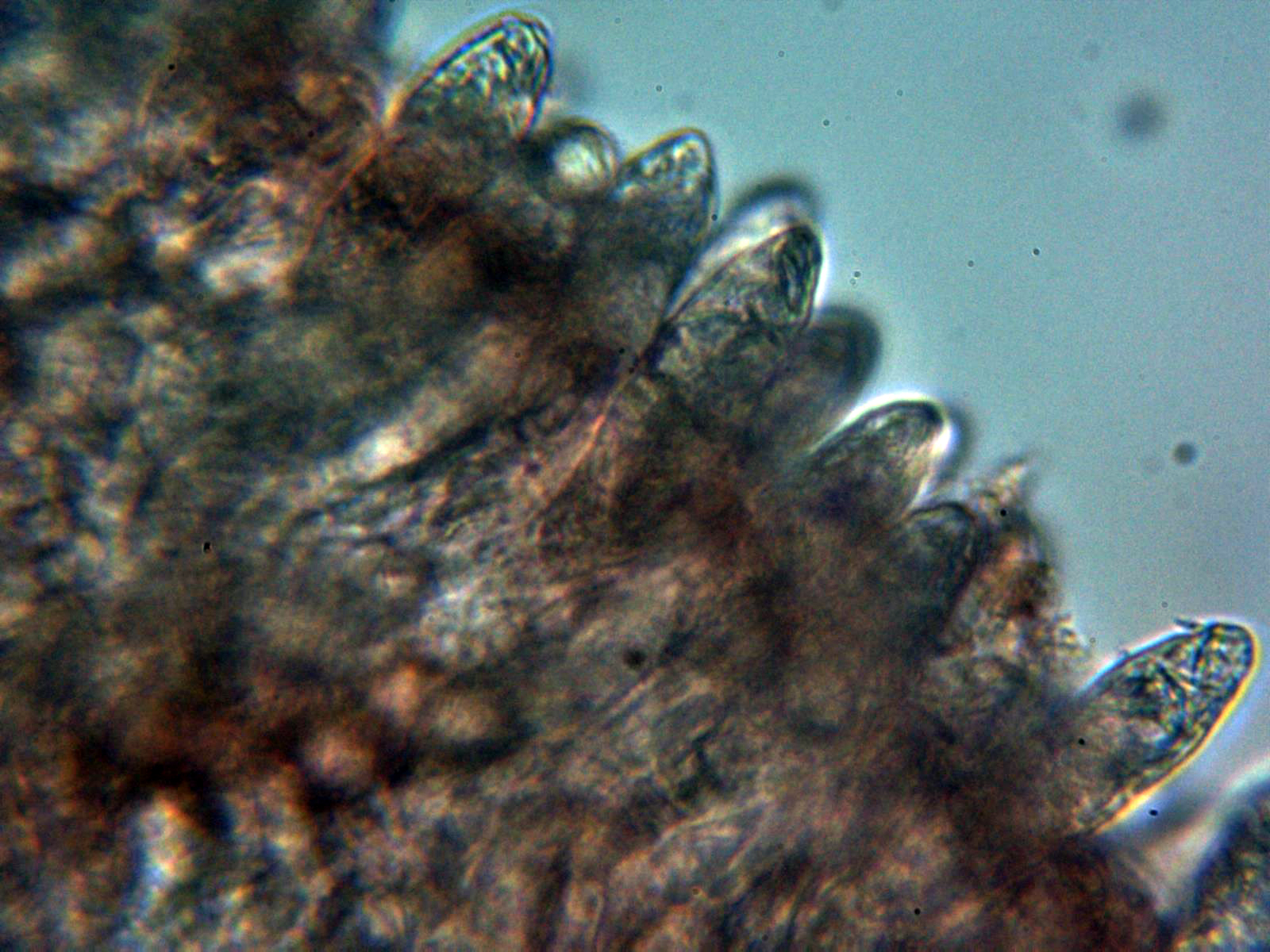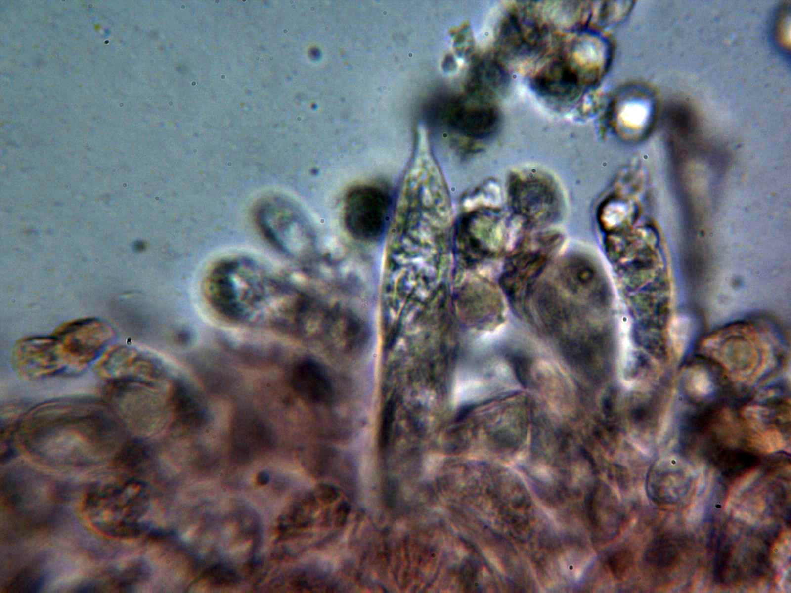 Escasos cistidios tanto en la cara laminar como en la arista, los pocos cistidios observados fusiformes y papilados:
