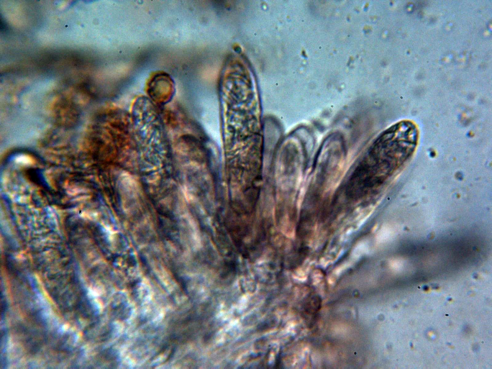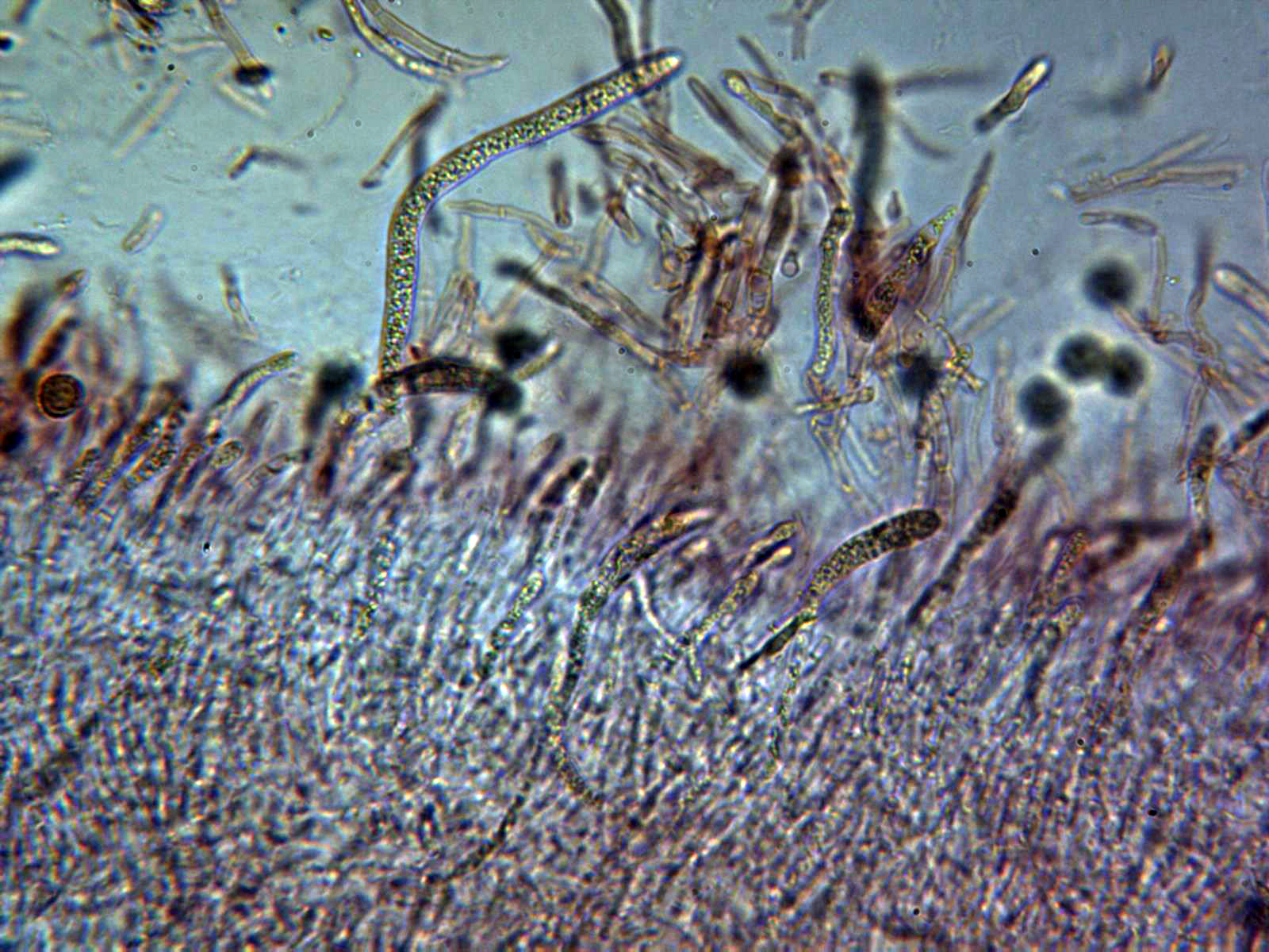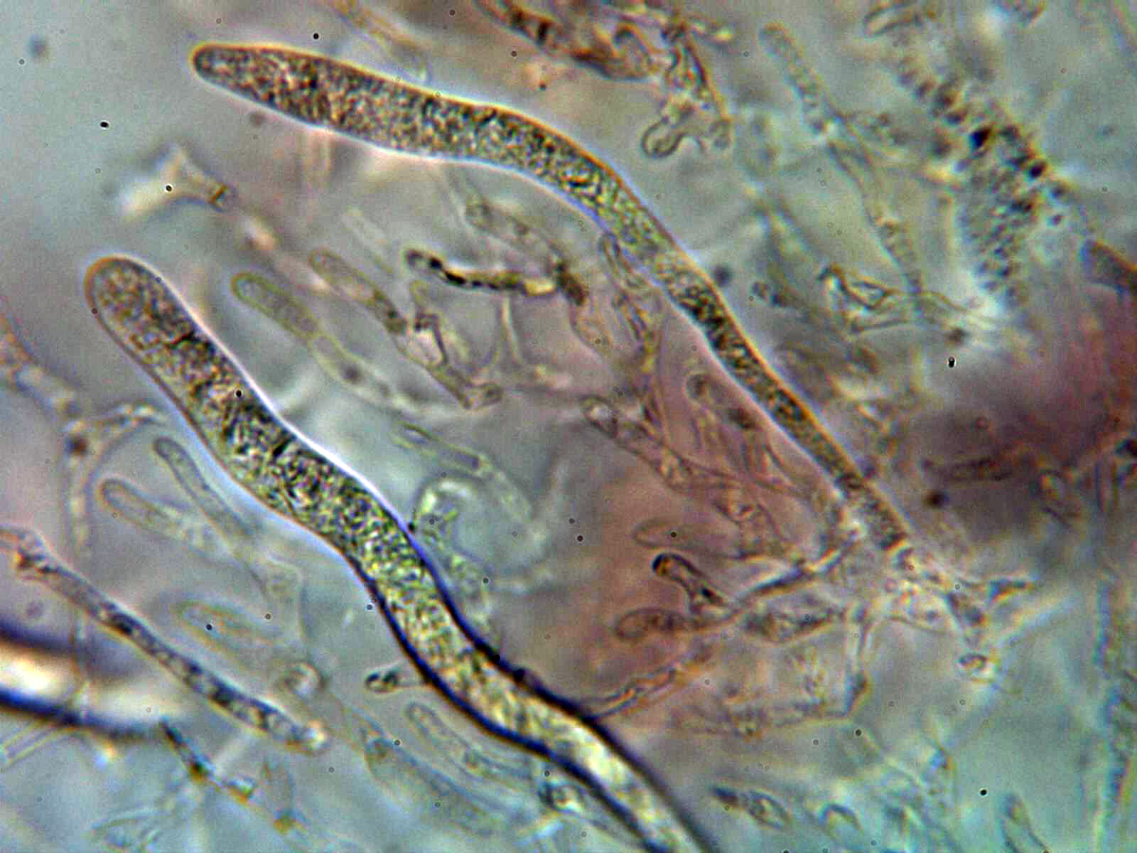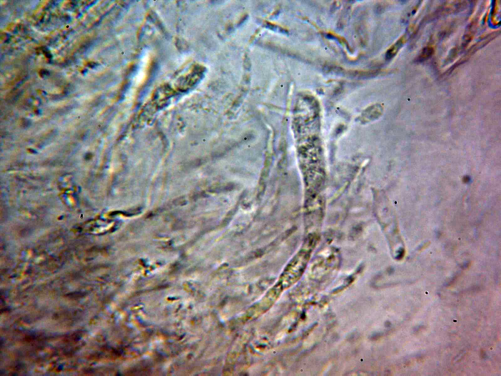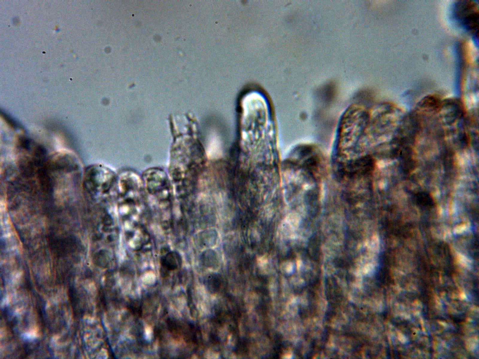 Escasos cistidios tanto en la cara laminar como en la arista, los pocos cistidios observados fusiformes y papilados: