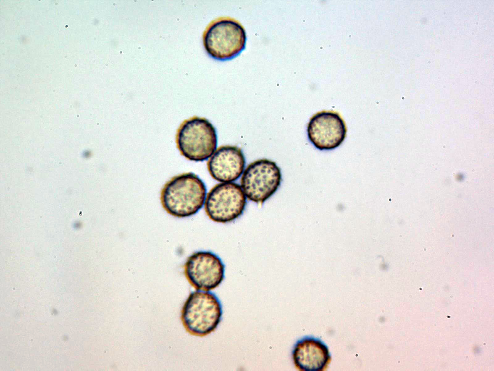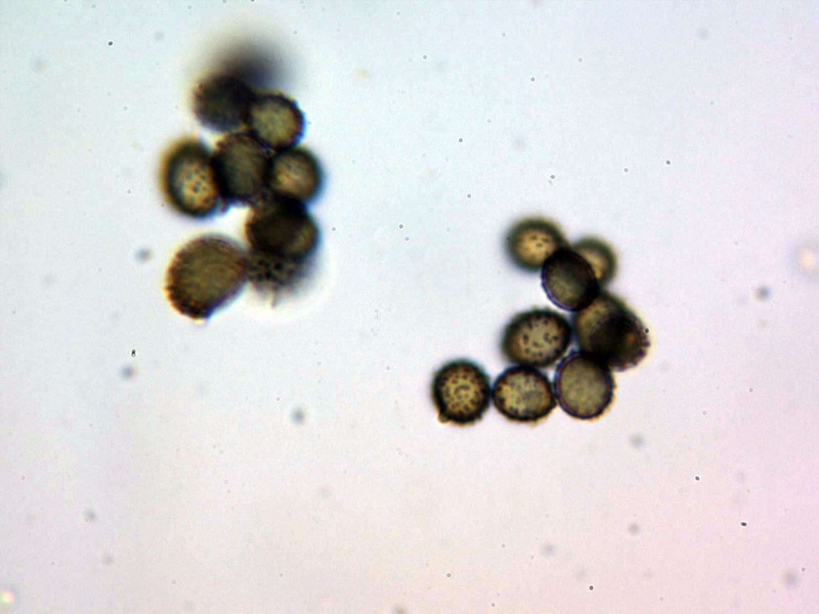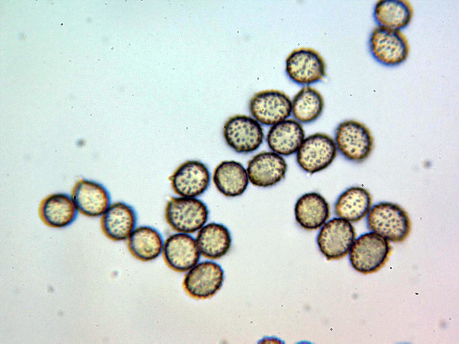 Las esporas en Melzer, ovoides, con verrugas dispersas bajas que algunas se juntan para formar unas muy discretas crestas, pero sin formar en ningún caso retículo, con unas medidas de: