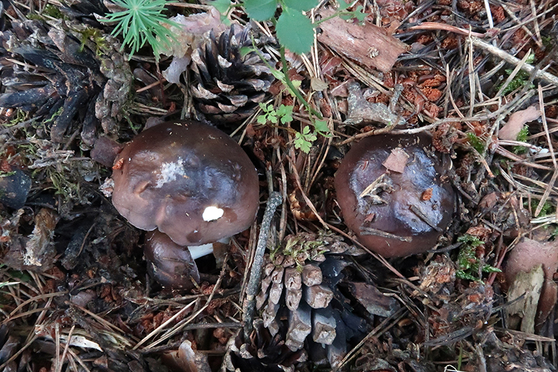 La primera es del 8 de Septiembre de 2019, en pinar de altura.Sombrero de unos 5 o 6 cm., convexo, con cutícula brillante, de color marrón violáceo con manchas crema más claras
