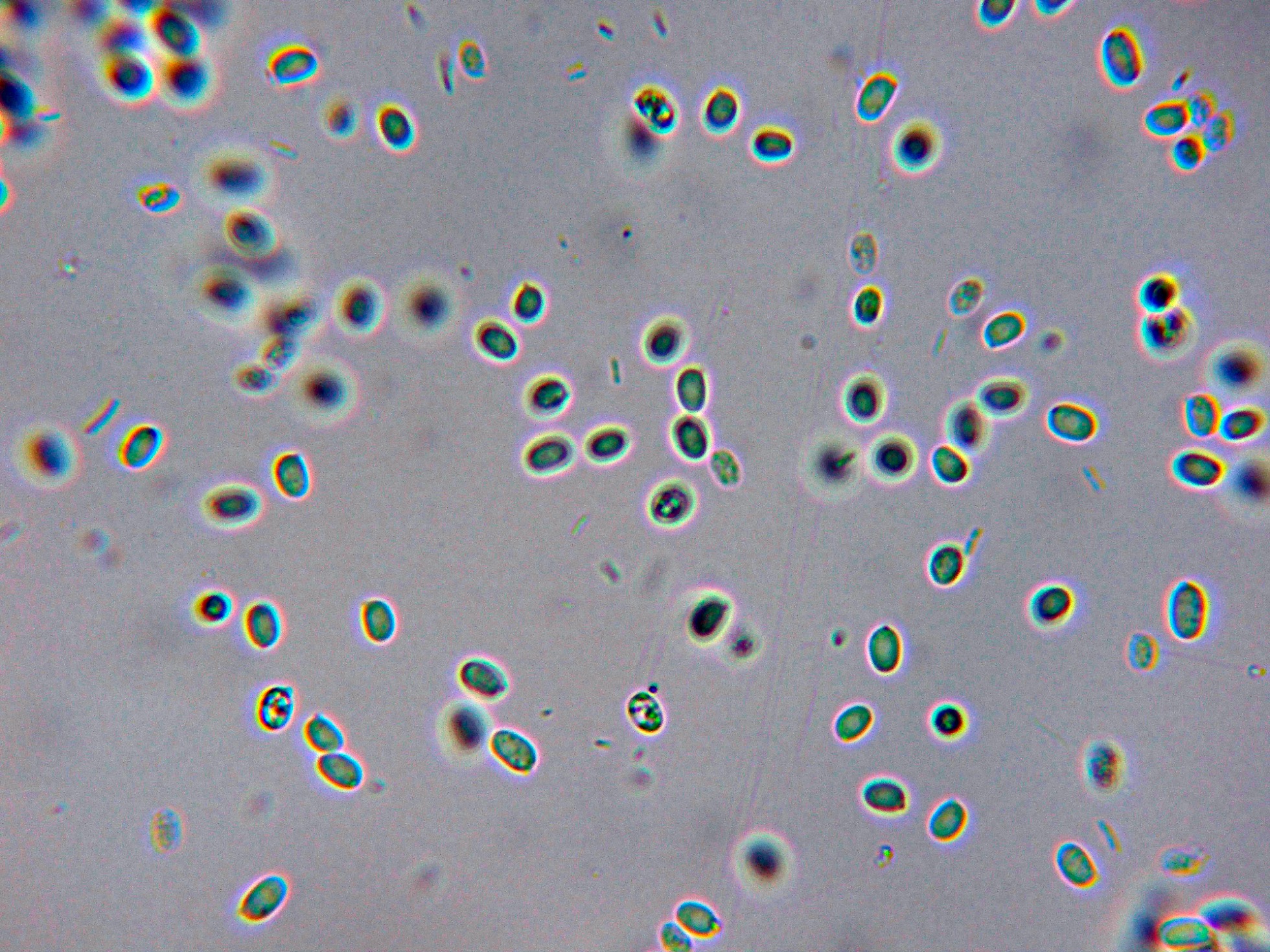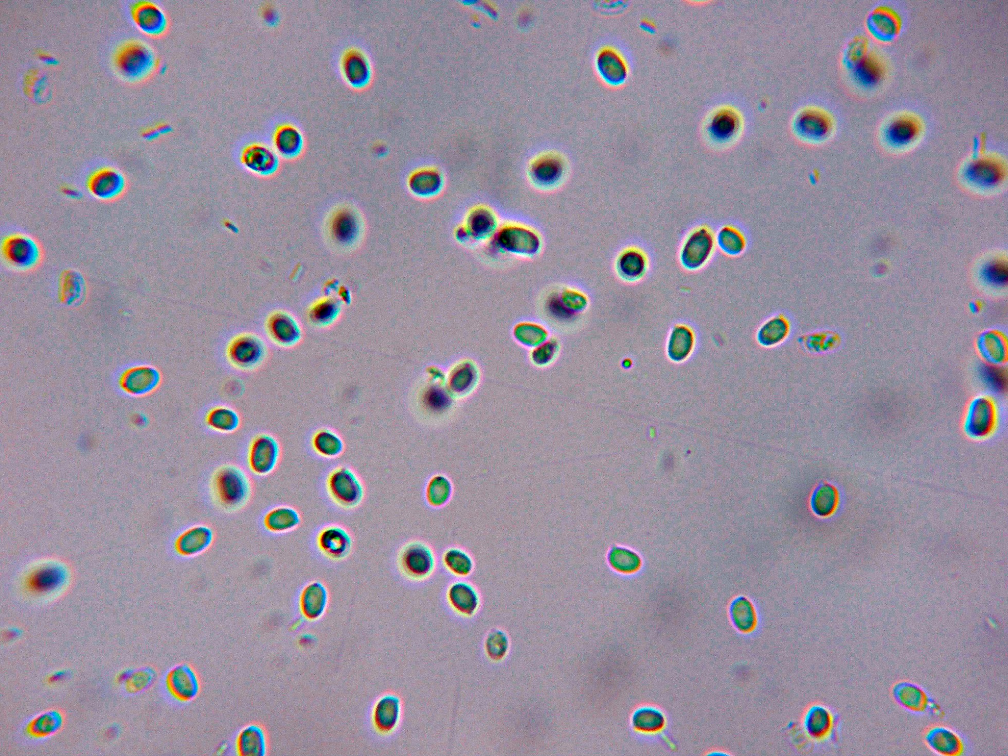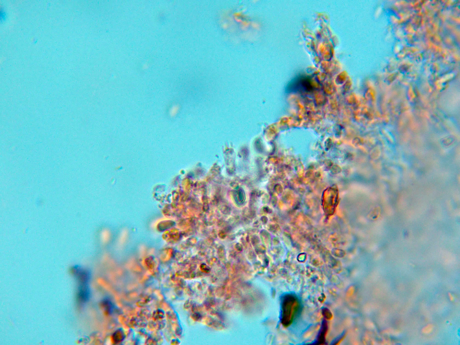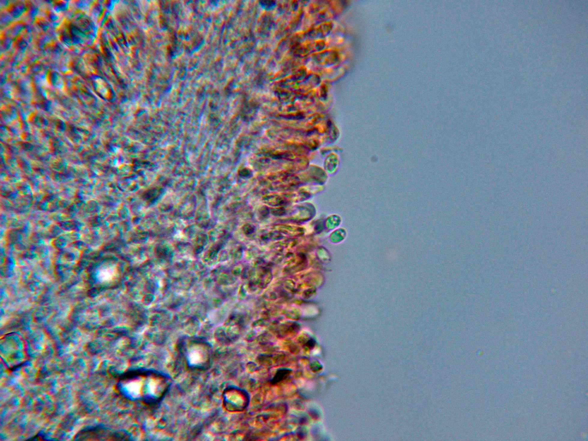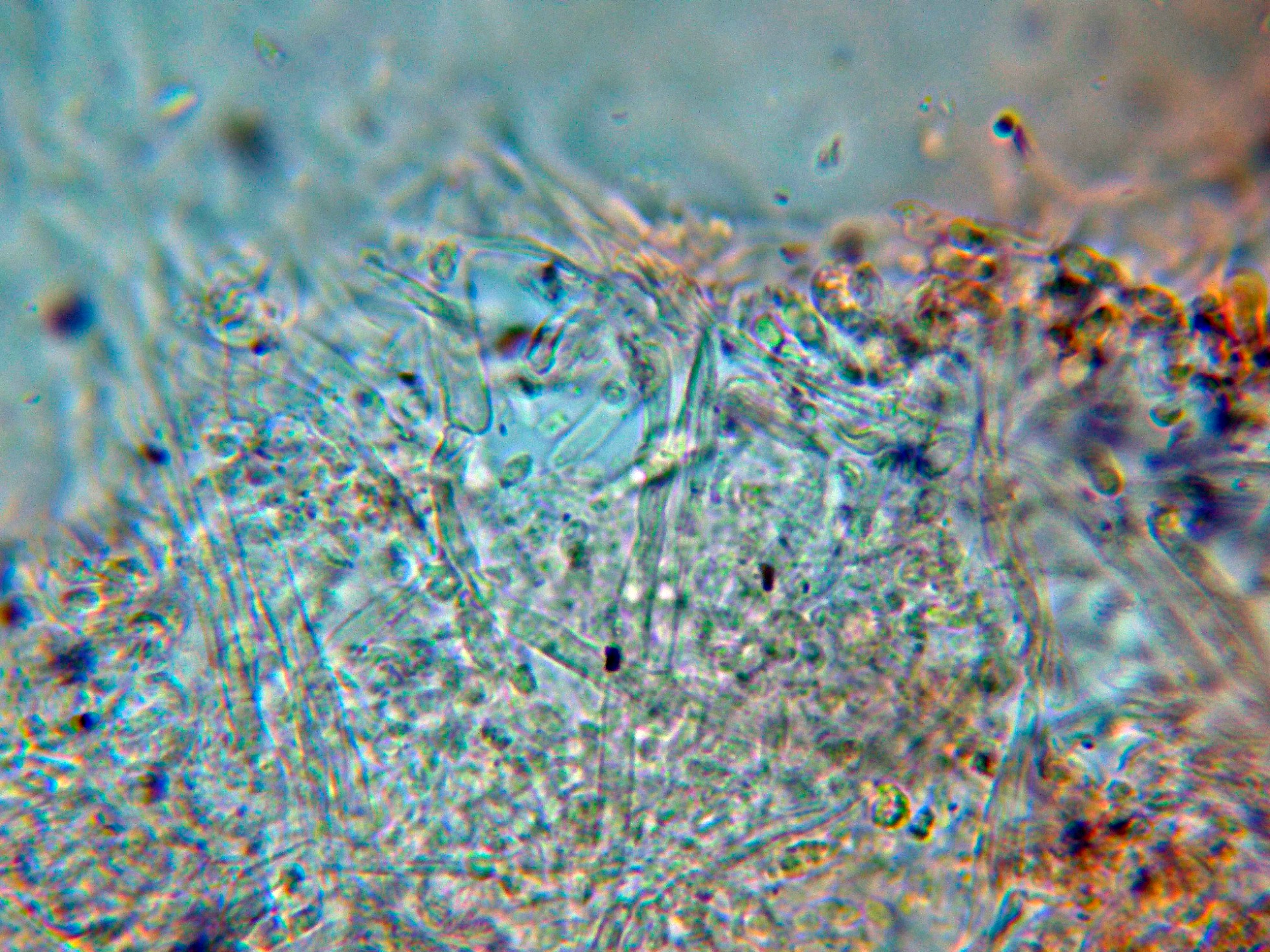 Seguimos con un "cromo nuevo" para mí, este Corticial se caracteriza por su pequeño tamaño esporal, también conocido como Corticium microsporum, con sistema hifal monomítico y sin cistidios observados, muy probablemente la Trechispora cohaerens. Muy parecida al Ceraceomyces sublaevis, este último con esporas de tamaño parecido pero más estrechas y con cistidios septados (septocistidios).
