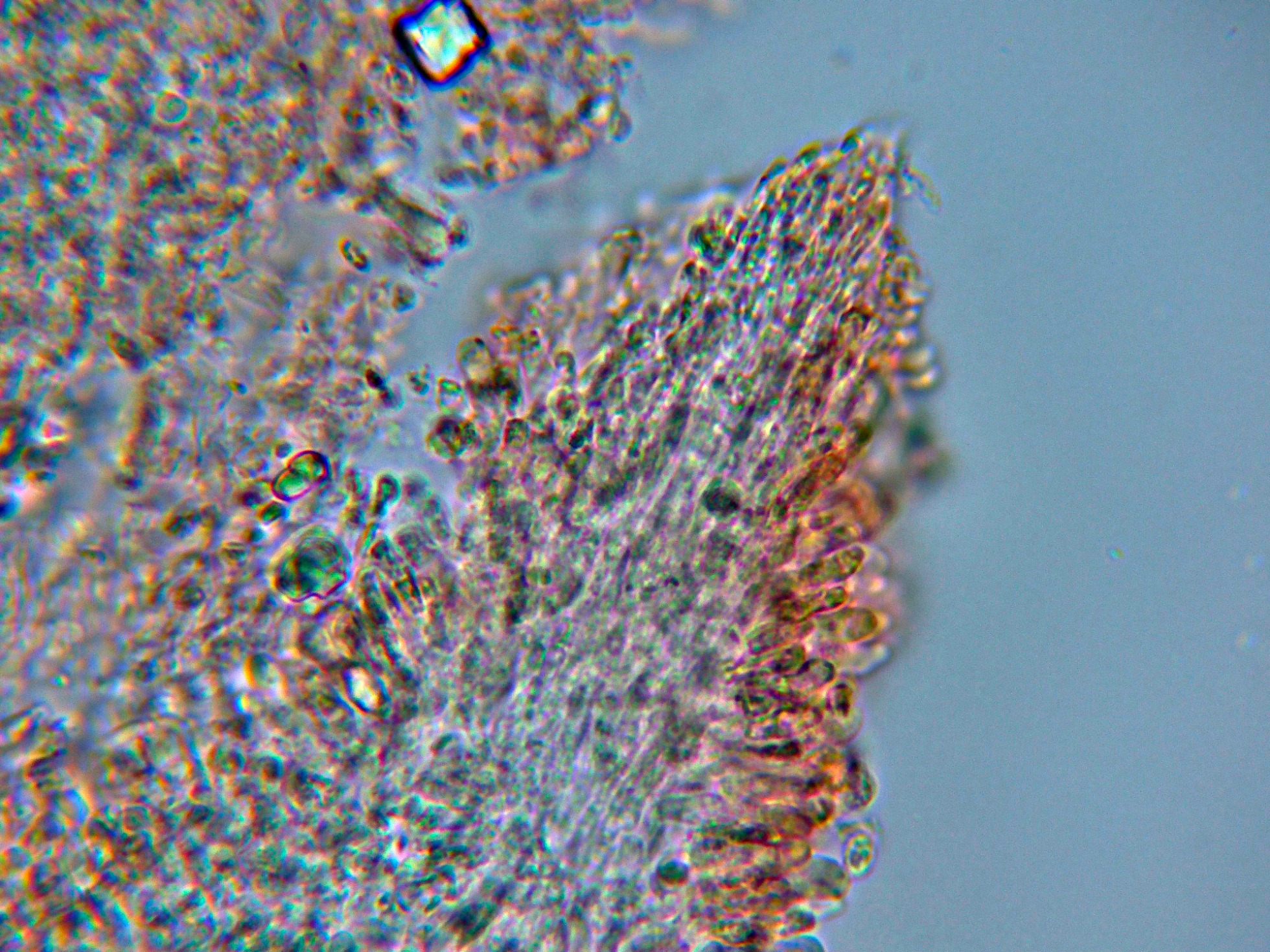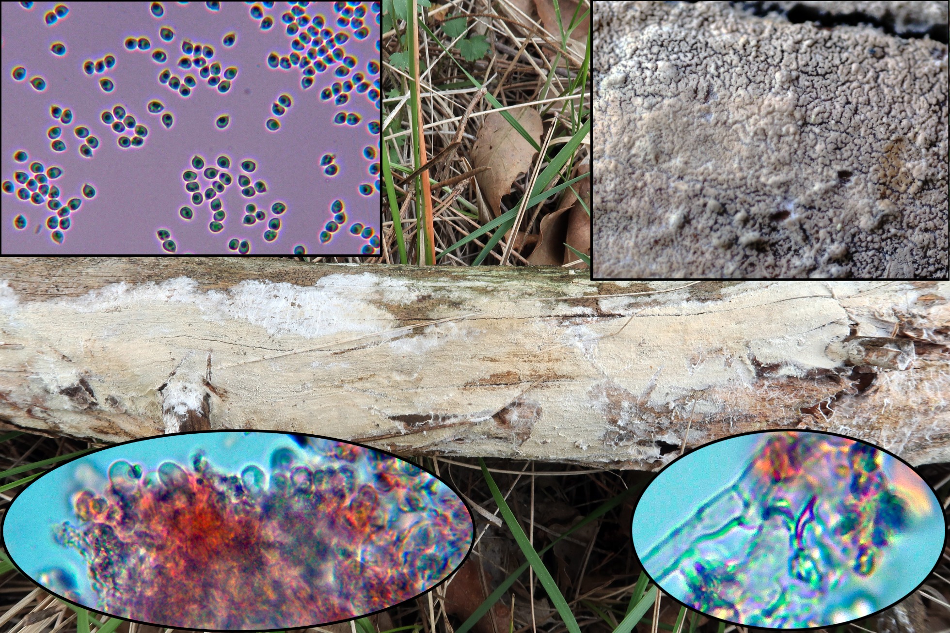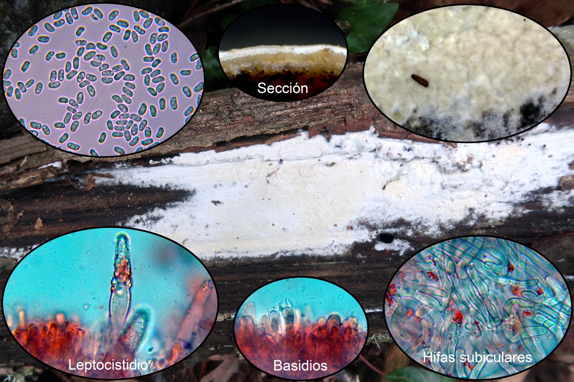 Un Phanerochaete bastante común , con cistidios con cristalizaciones, la Phanerochaete sordida.