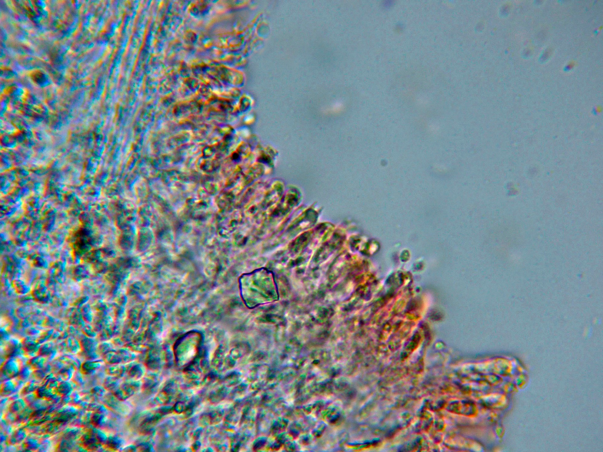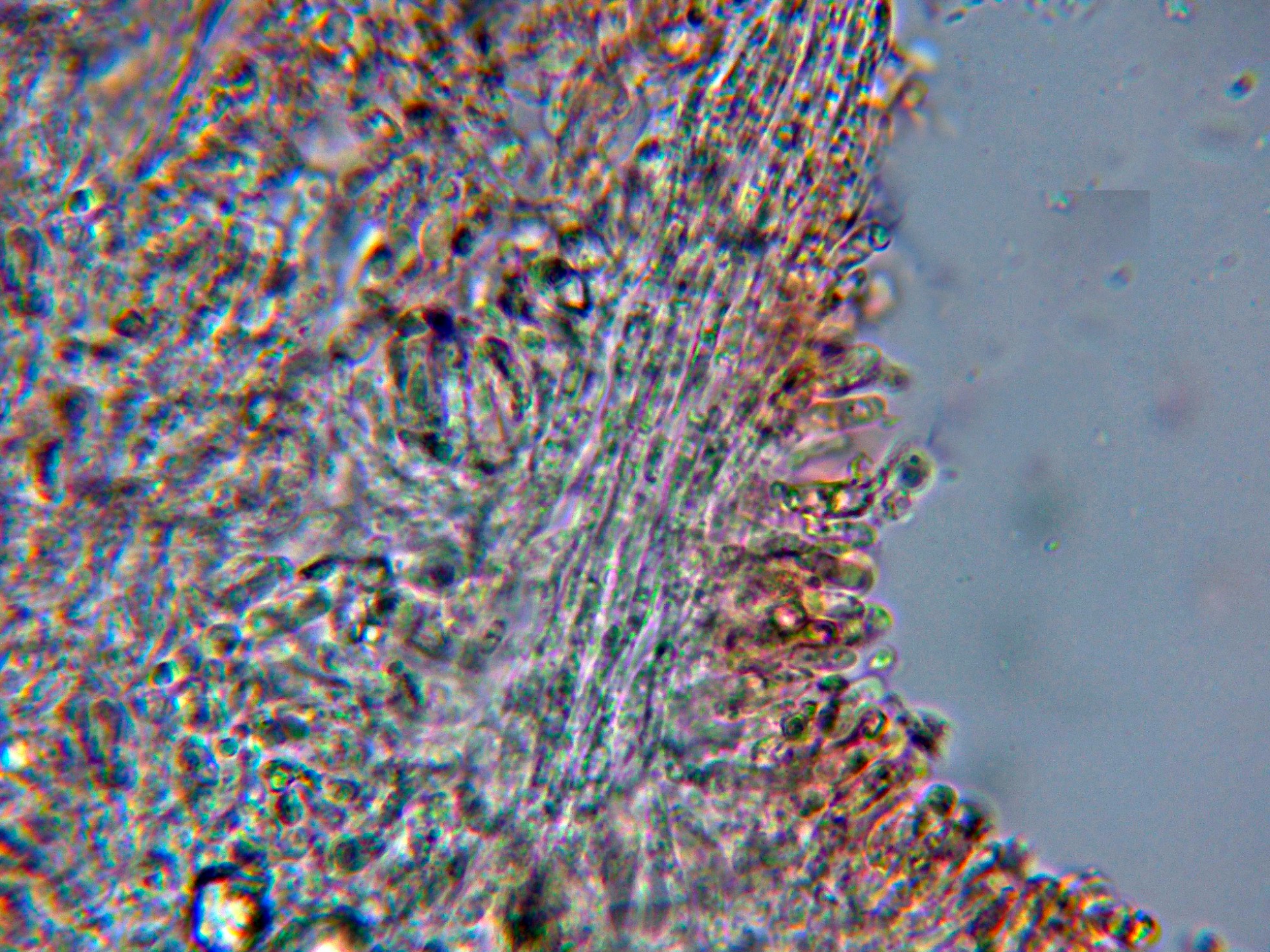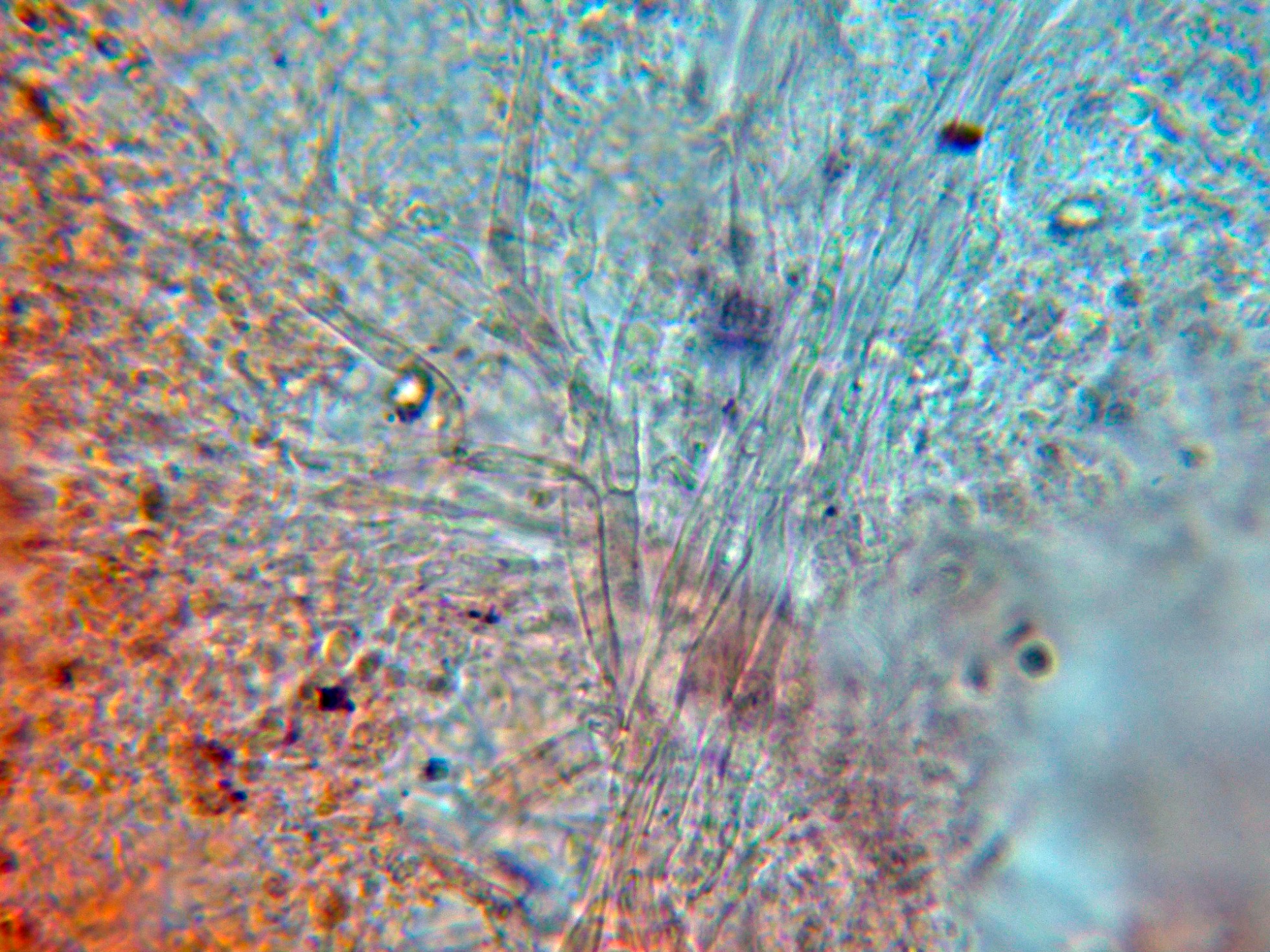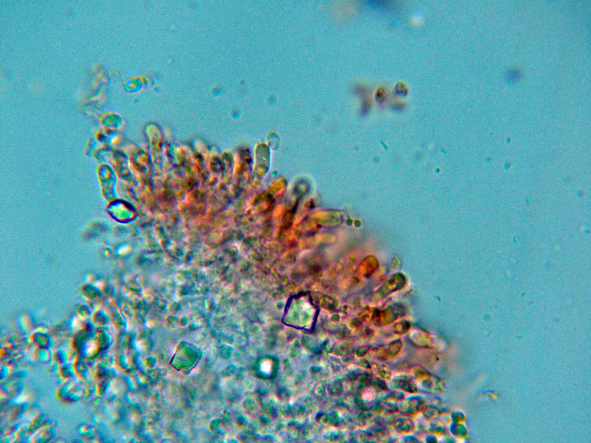 Un Phanerochaete bastante común , con cistidios con cristalizaciones, la Phanerochaete sordida.