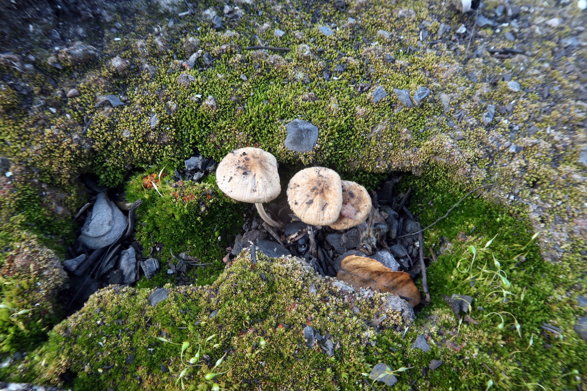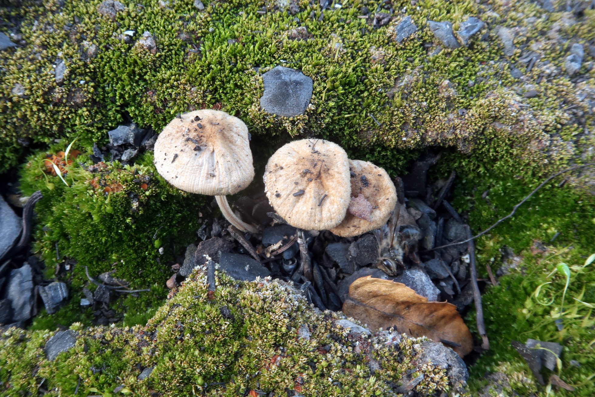 Tres ejemplares no ya en su mejor momento brotando entre el musgo sobre suelo completamente carbonizado.