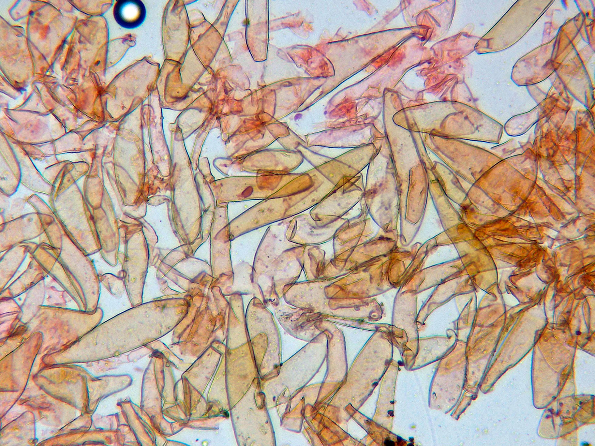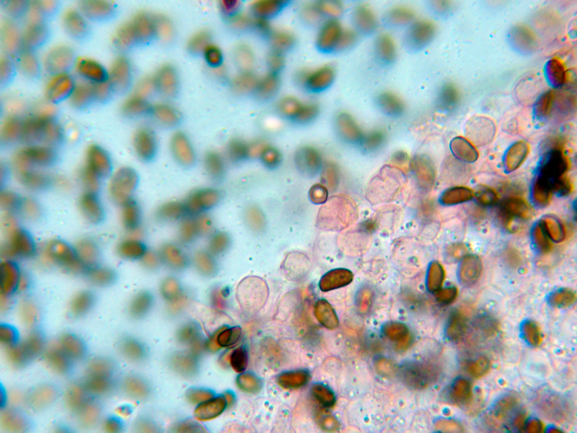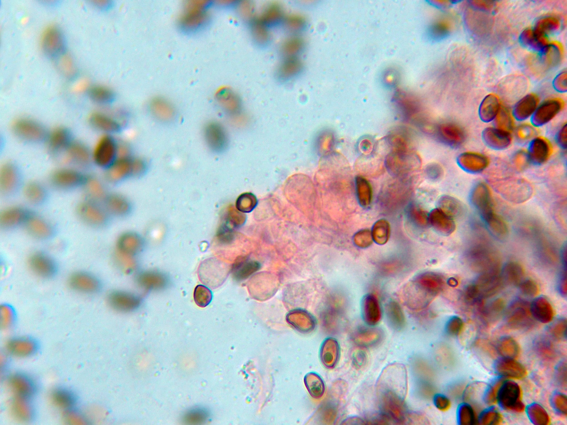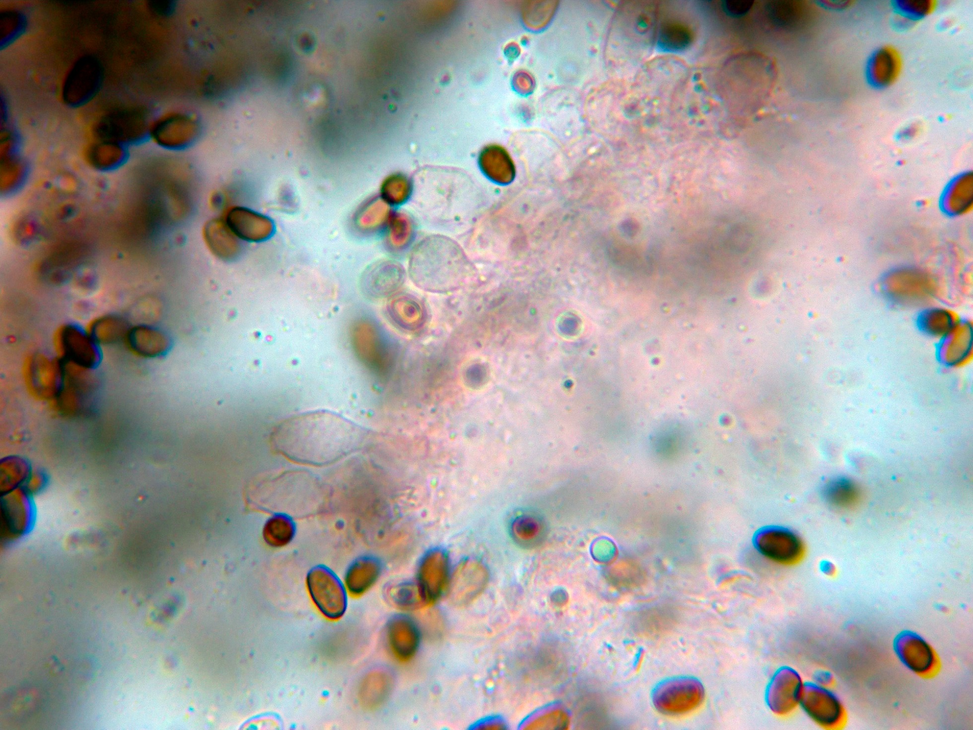 En el himenio las esporas ya habían colapsado y me resultó muy difícil observar cistidios debido a su estado, aunque se puede intuir uno en la primera imágen en la parte baja con un extremo apuntado: