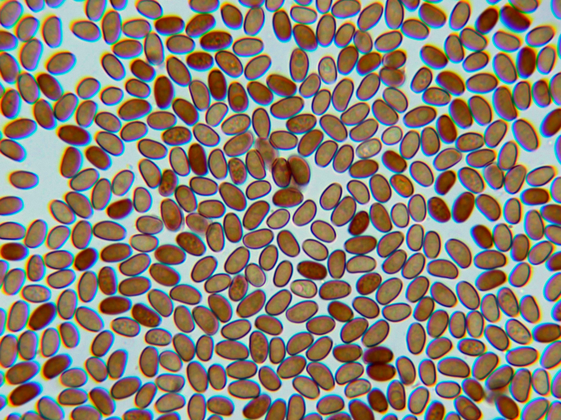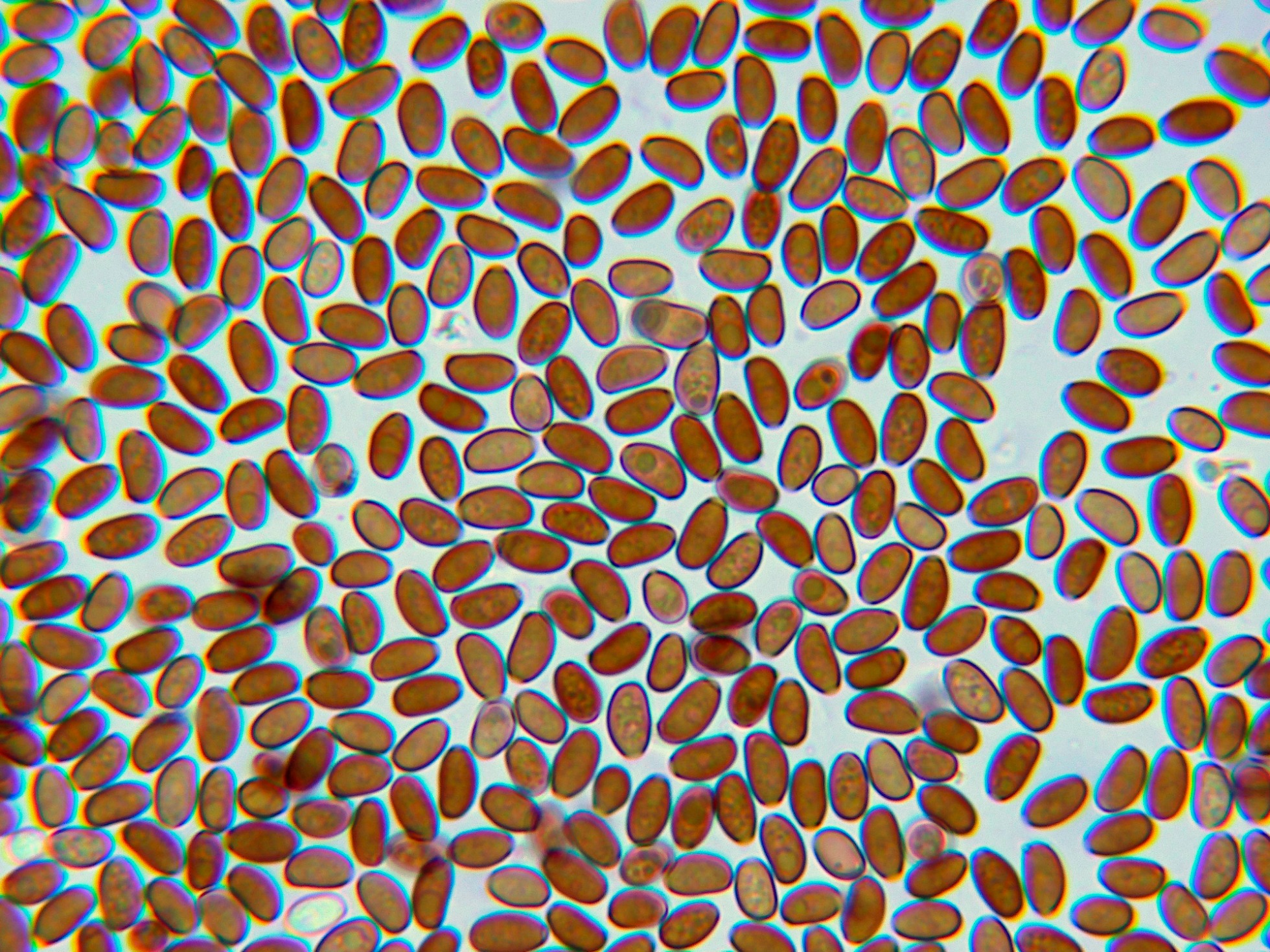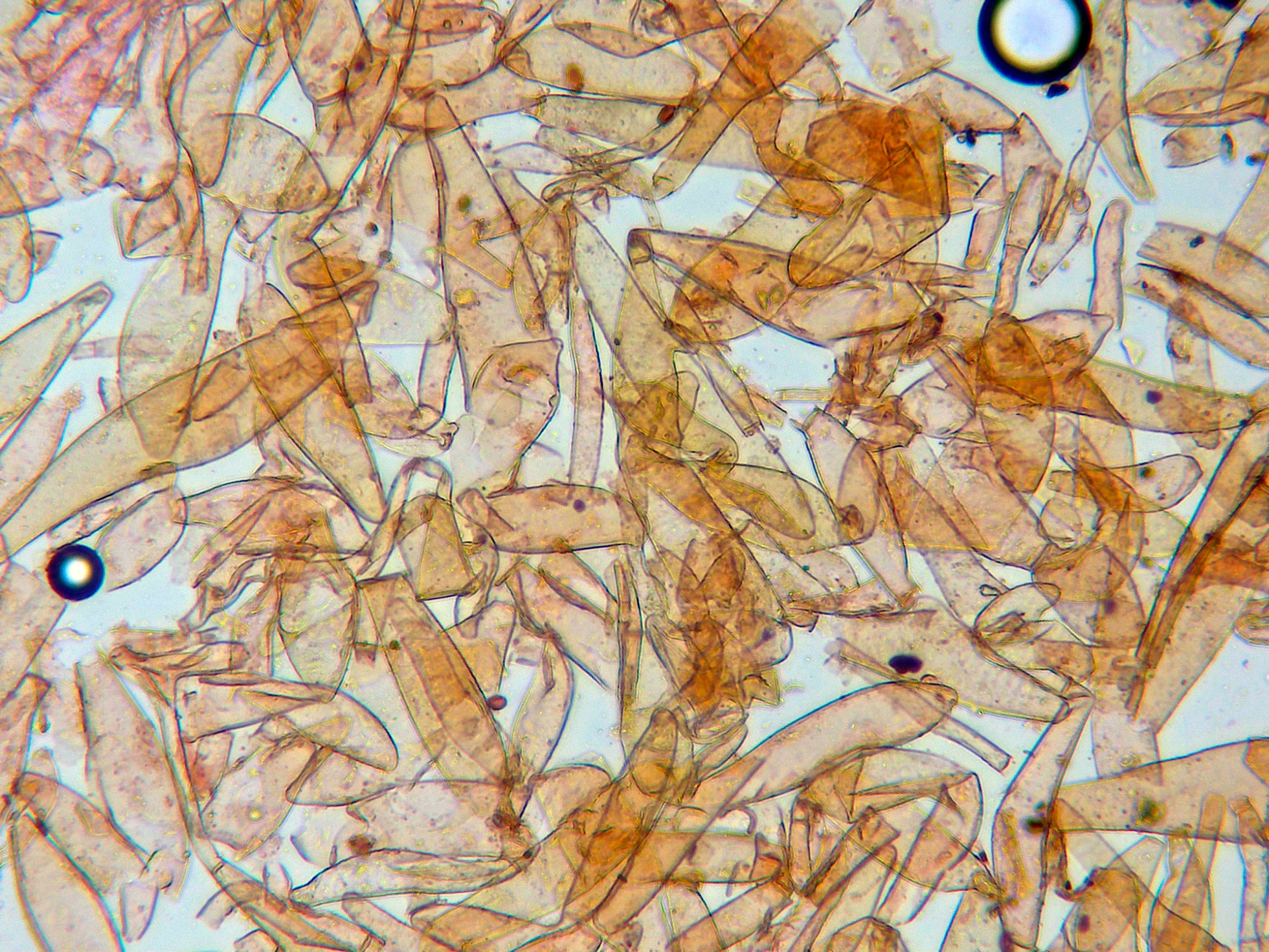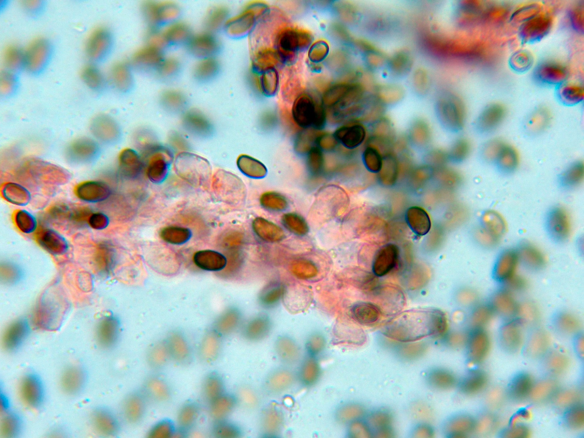 En el himenio las esporas ya habían colapsado y me resultó muy difícil observar cistidios debido a su estado, aunque se puede intuir uno en la primera imágen en la parte baja con un extremo apuntado: